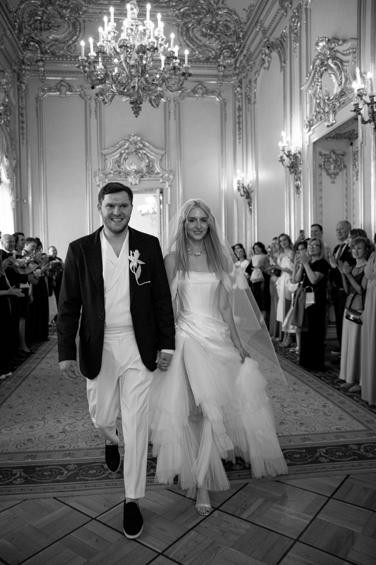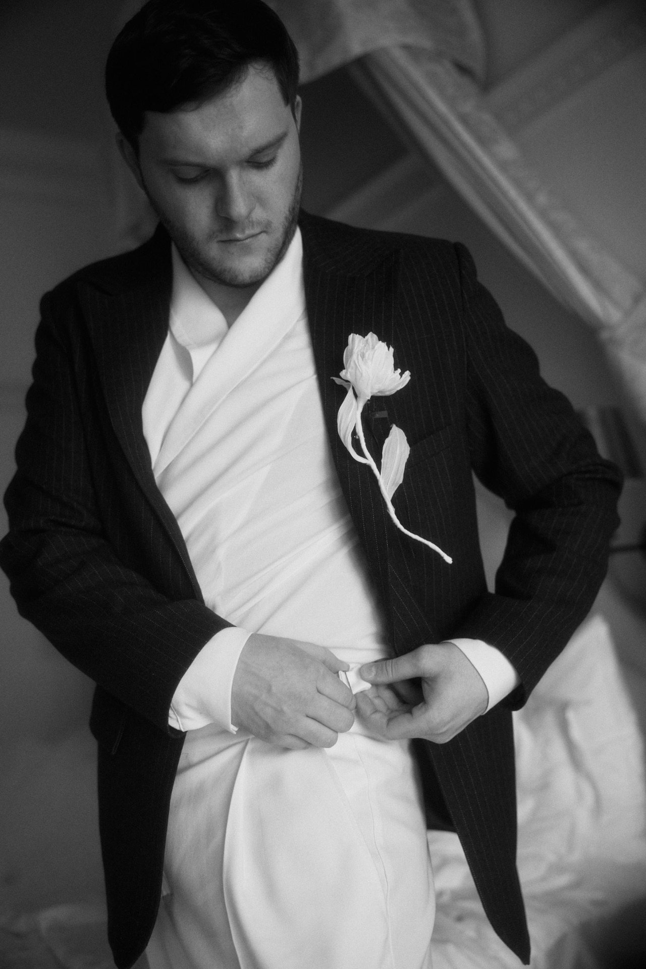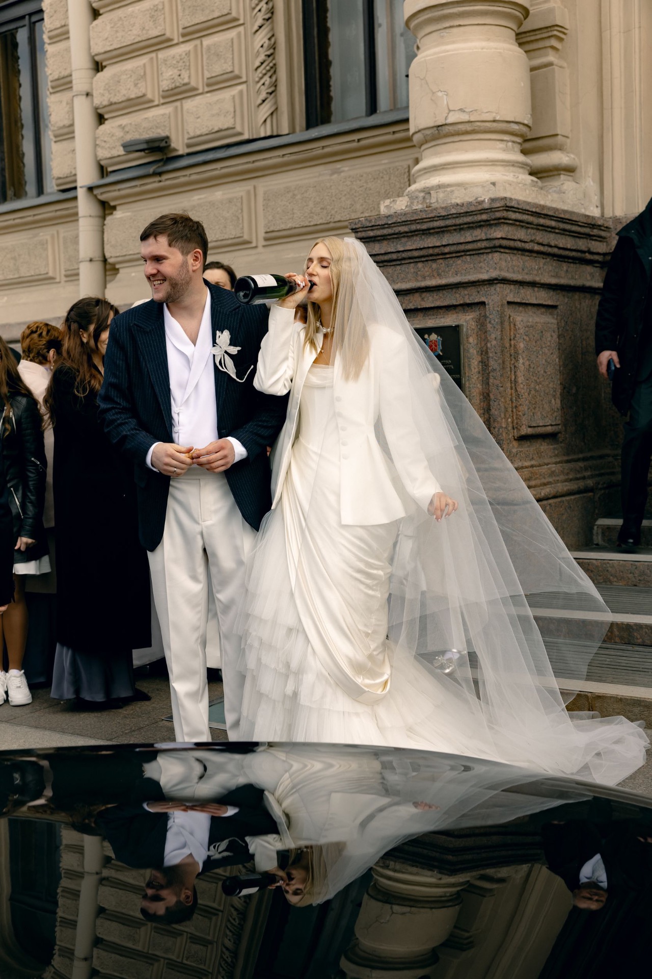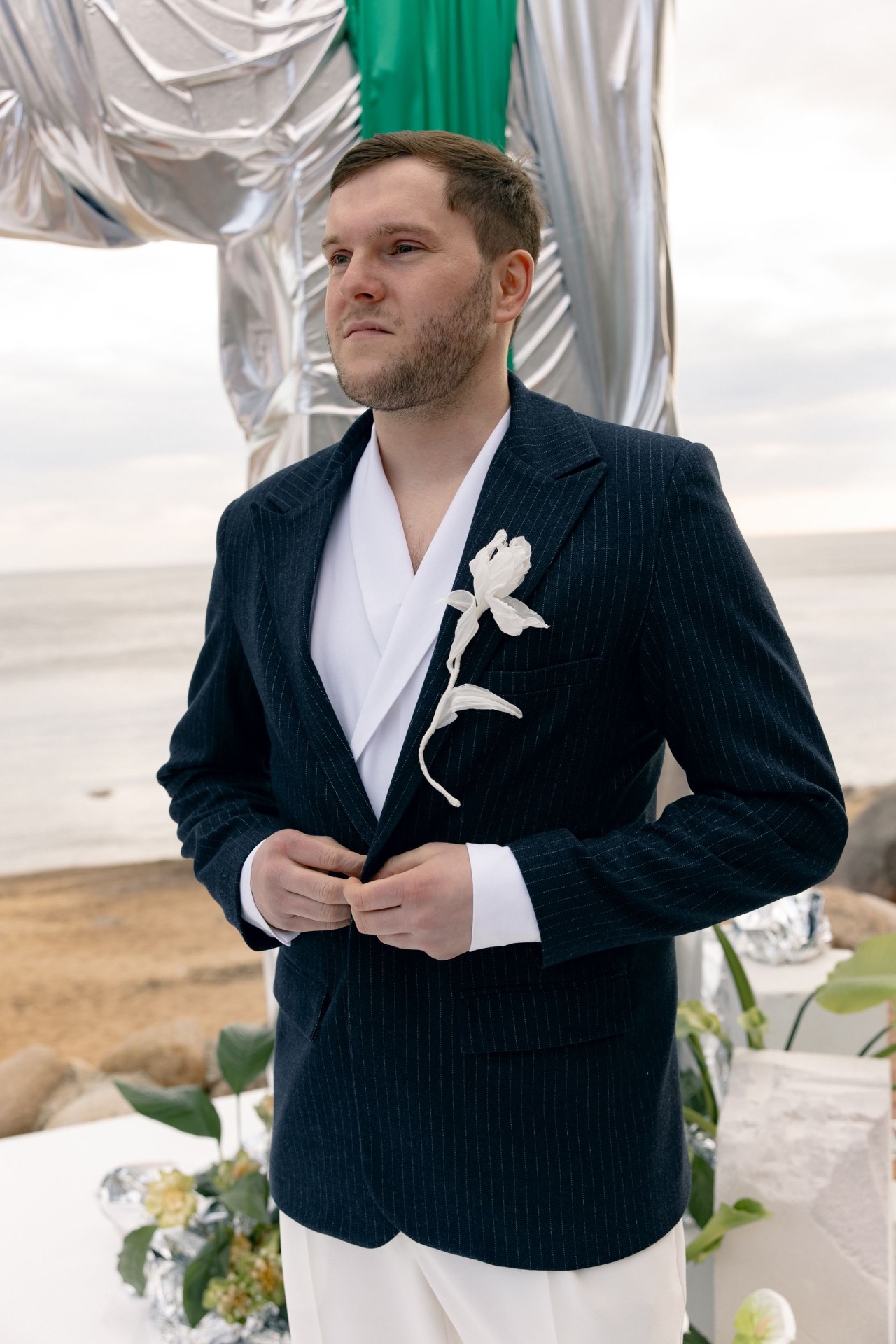Образ жениха отшивали по индивидуальным эскизам. Он состоял из необычной рубашки и стильного цветка. Поддерживали эту историю дизайнерские колготы во втором образе невесты. А необычная для свадебного образа, но стильная причёска Алины подчеркнула графику её платья.