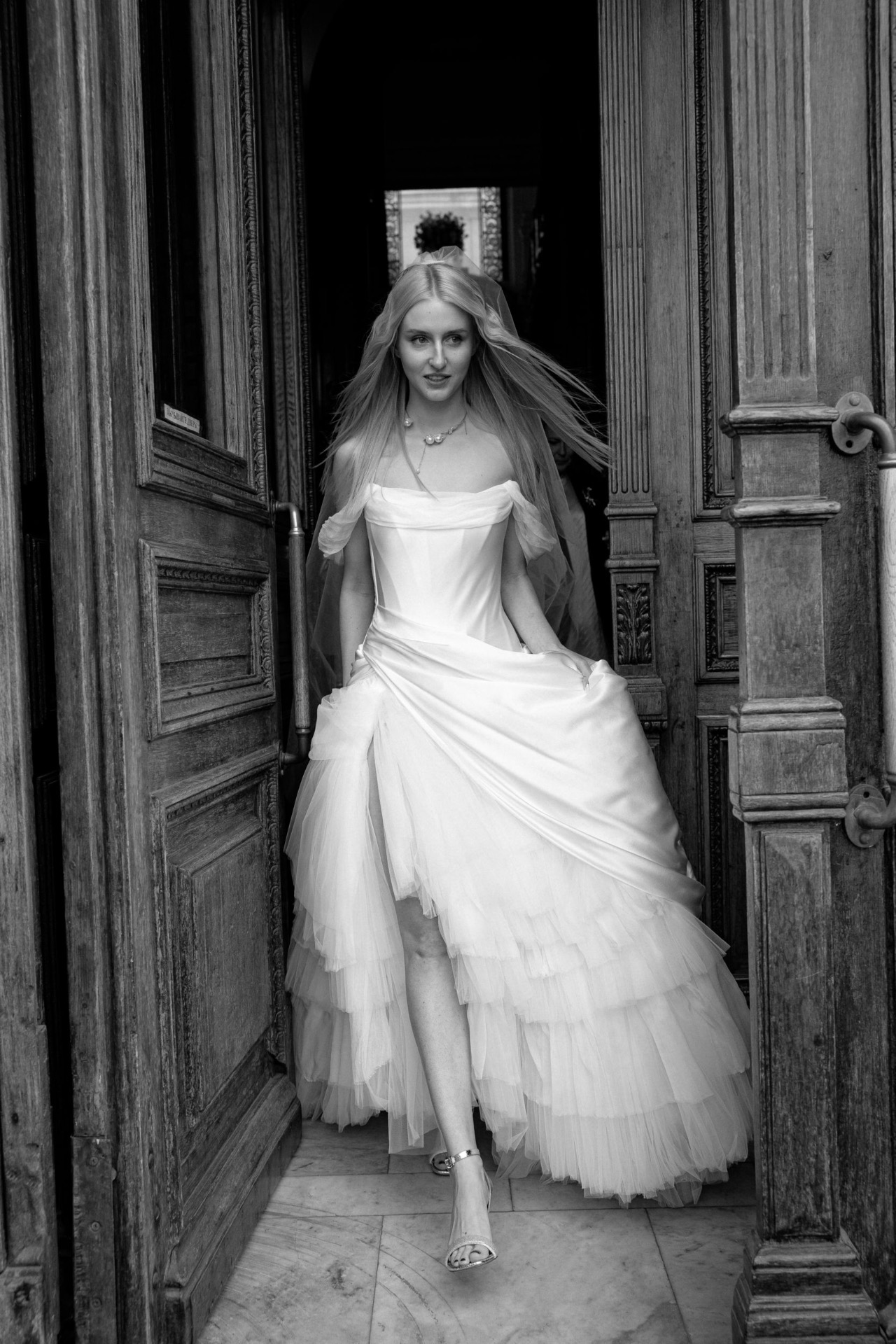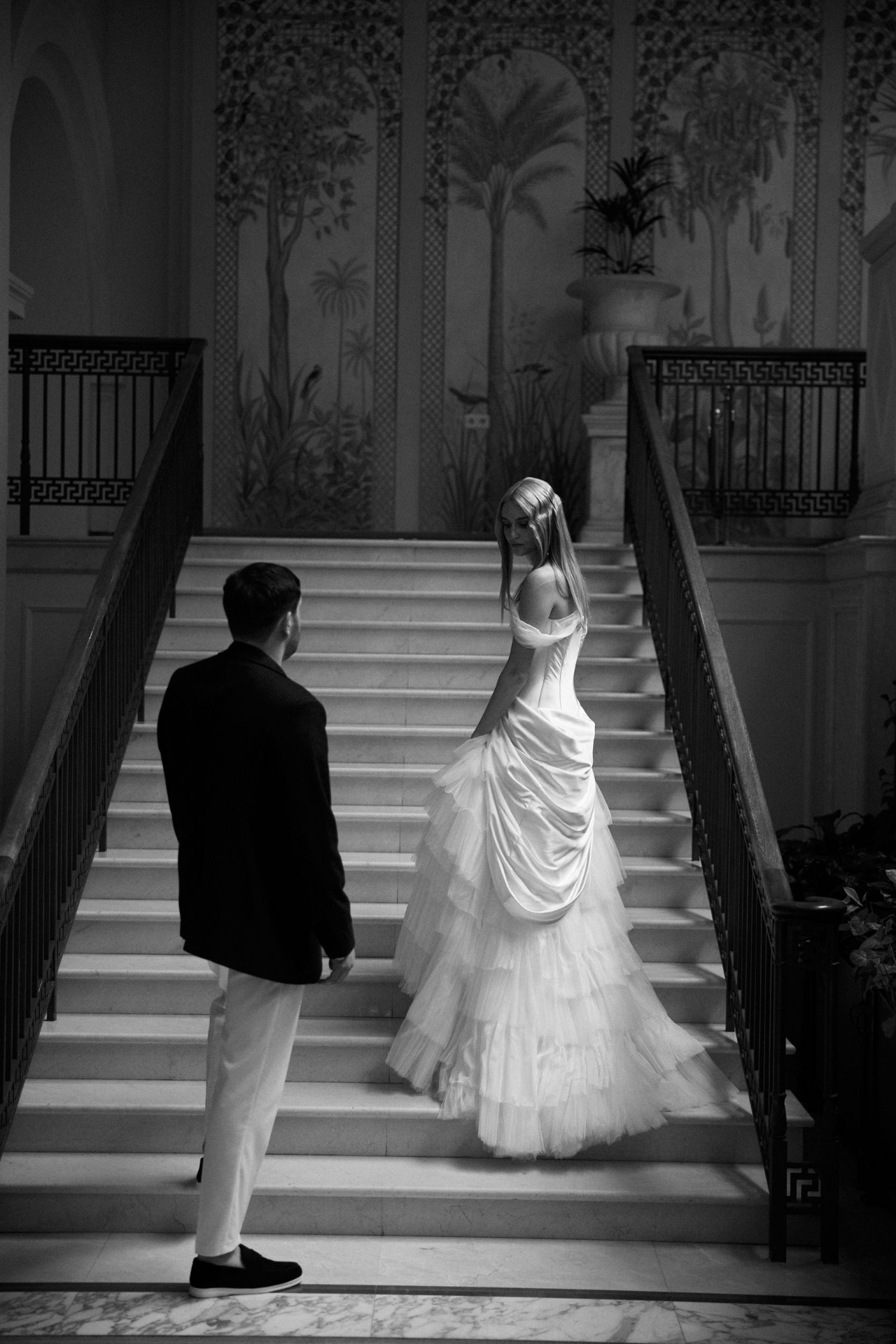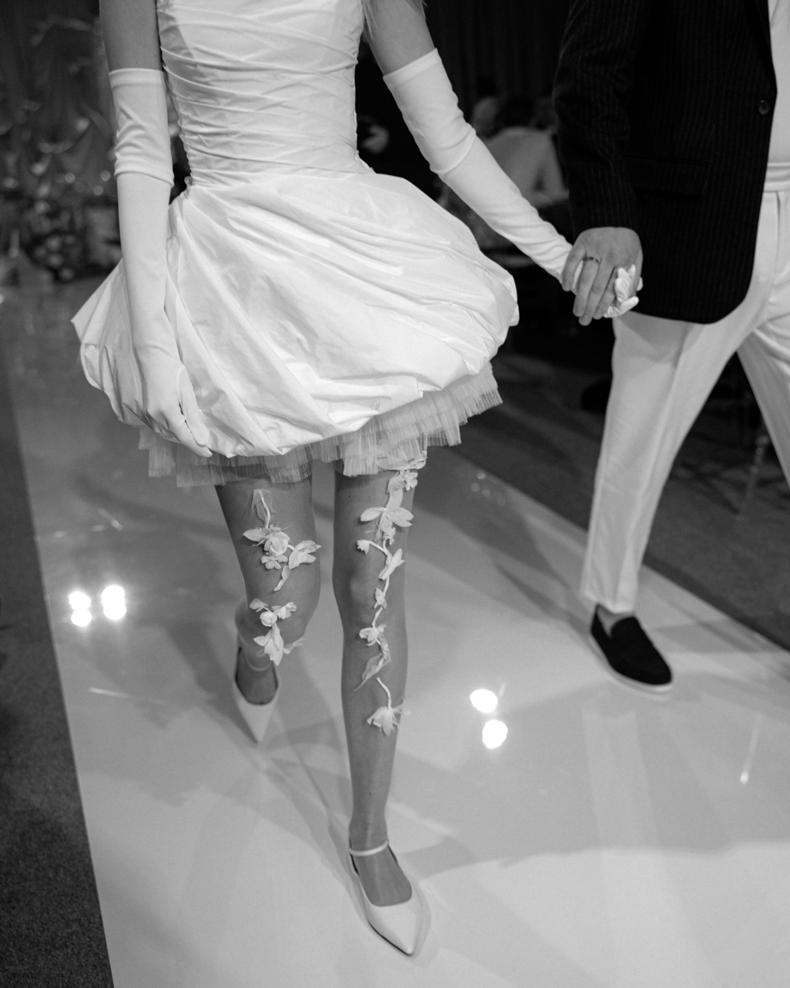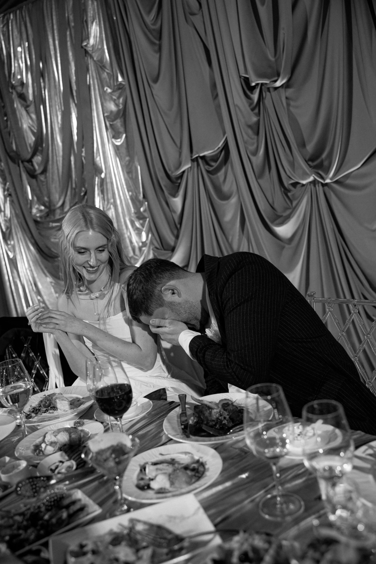 Образ жениха отшивали по индивидуальным эскизам. Он состоял из необычной рубашки и стильного цветка. Поддерживали эту историю дизайнерские колготы во втором образе невесты. А необычная для свадебного образа, но стильная причёска Алины подчеркнула графику её платья.