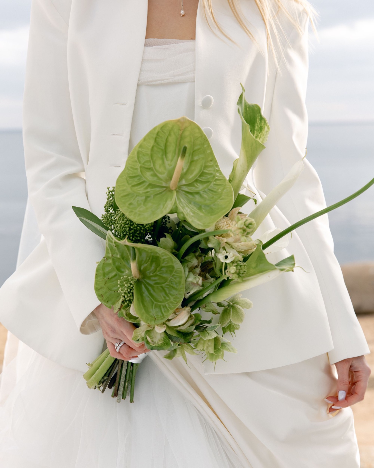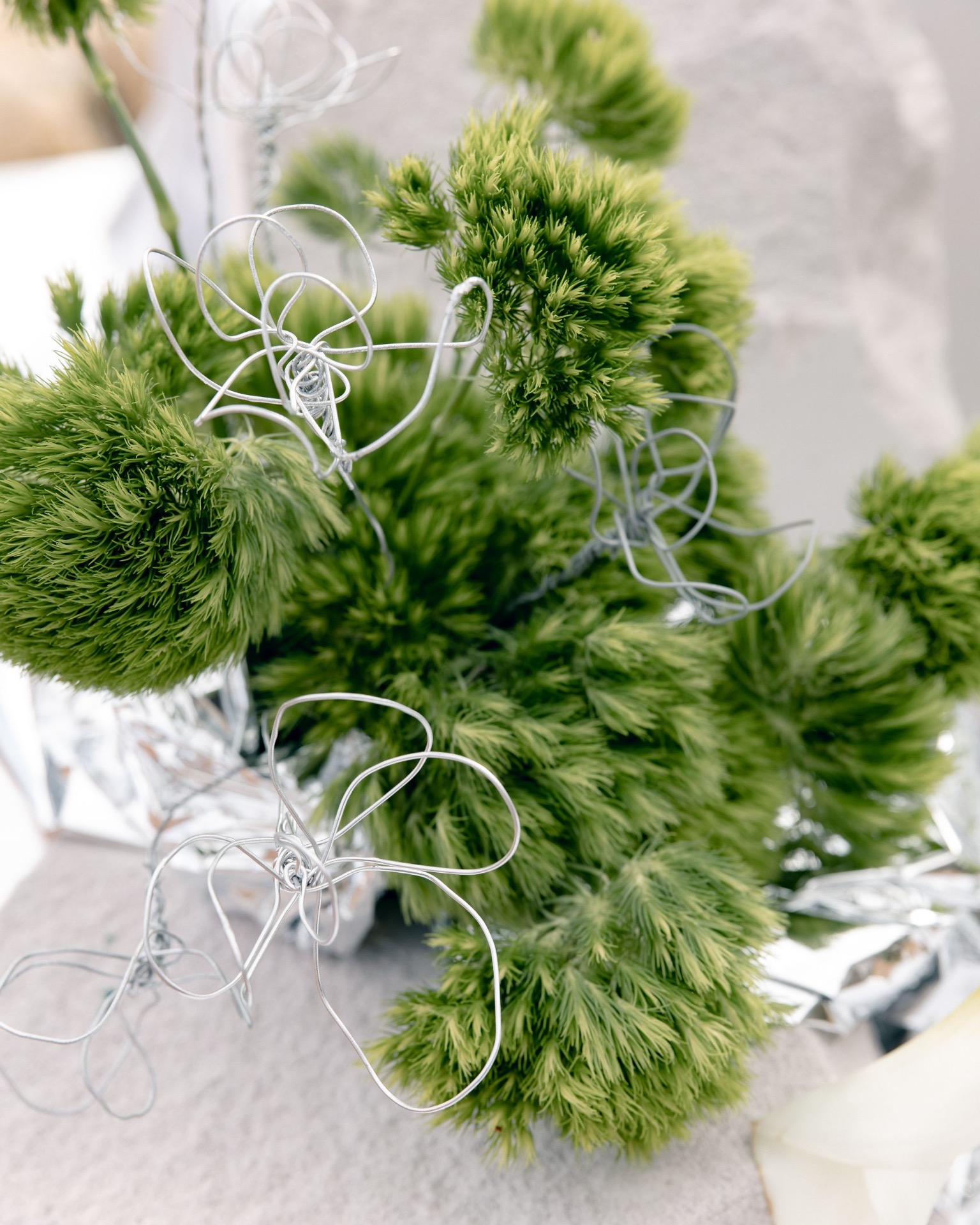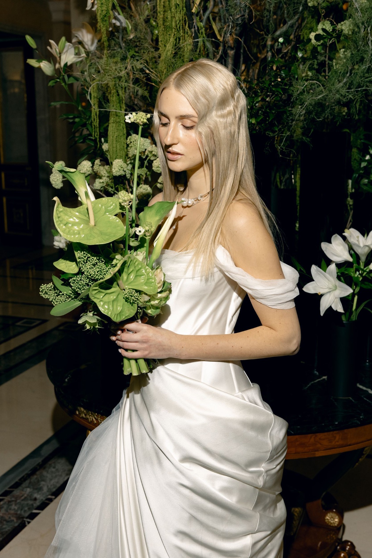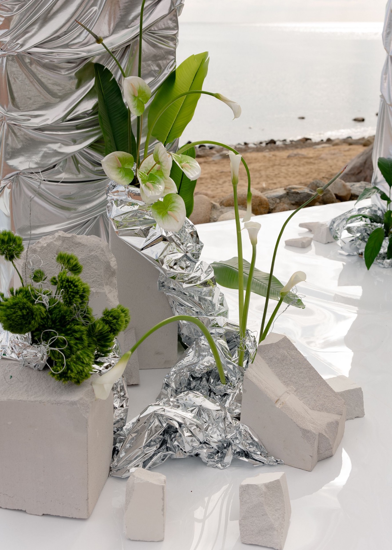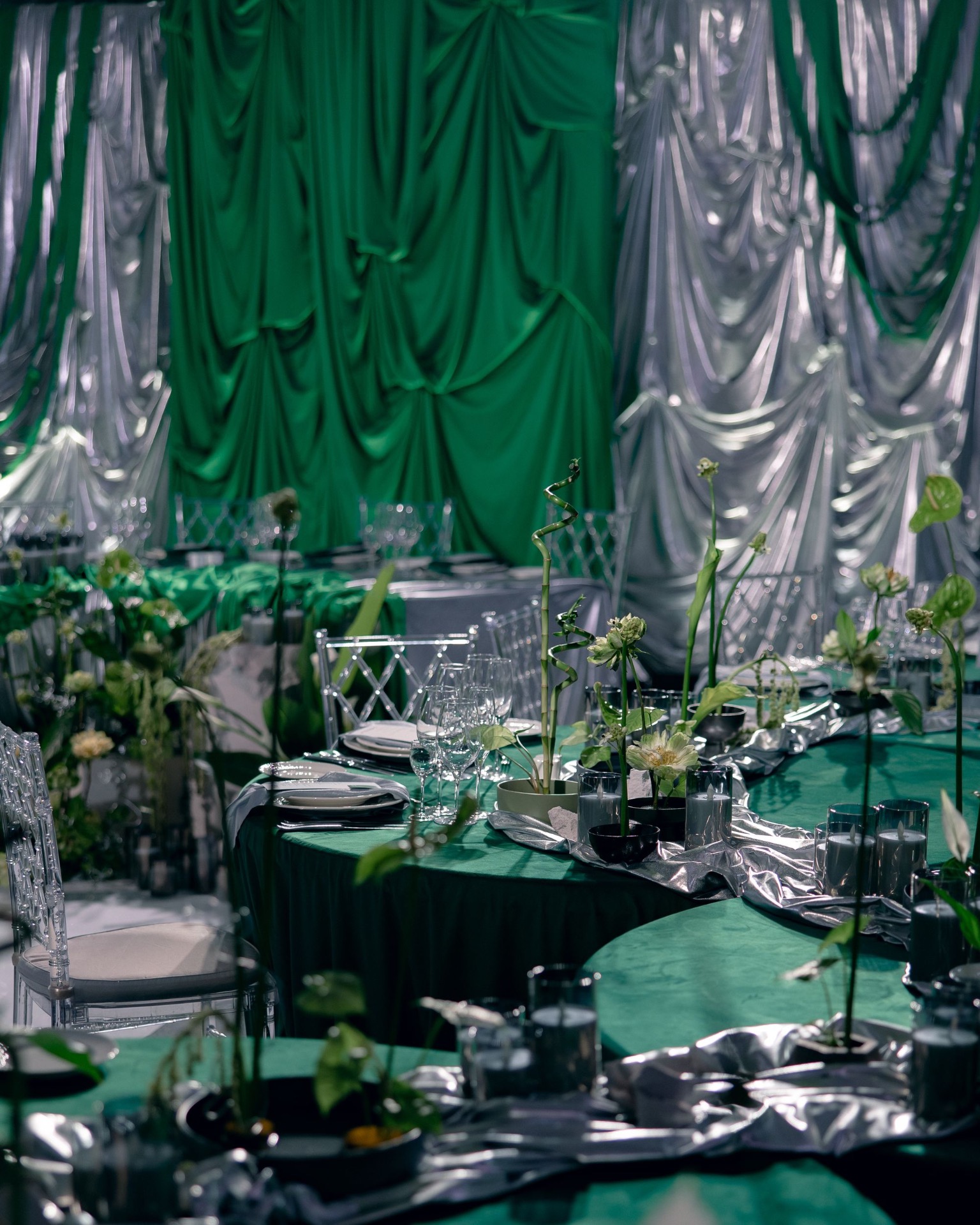Оформление было настоящим искусством, где каждая деталь имела значение. Глубокий графит, металлик, белый и насыщенный травянисто-зелёный цвета создали футуристичную, но элегантную картину. Драпировки, бетонные блоки и минимализм в оформлении живыми цветами подчёркивали концепцию стильного урбанизма. Символично, что певица Ёлка, чей концерт стал подарком от родителей пары, идеально вписалась в эту цветовую палитру.