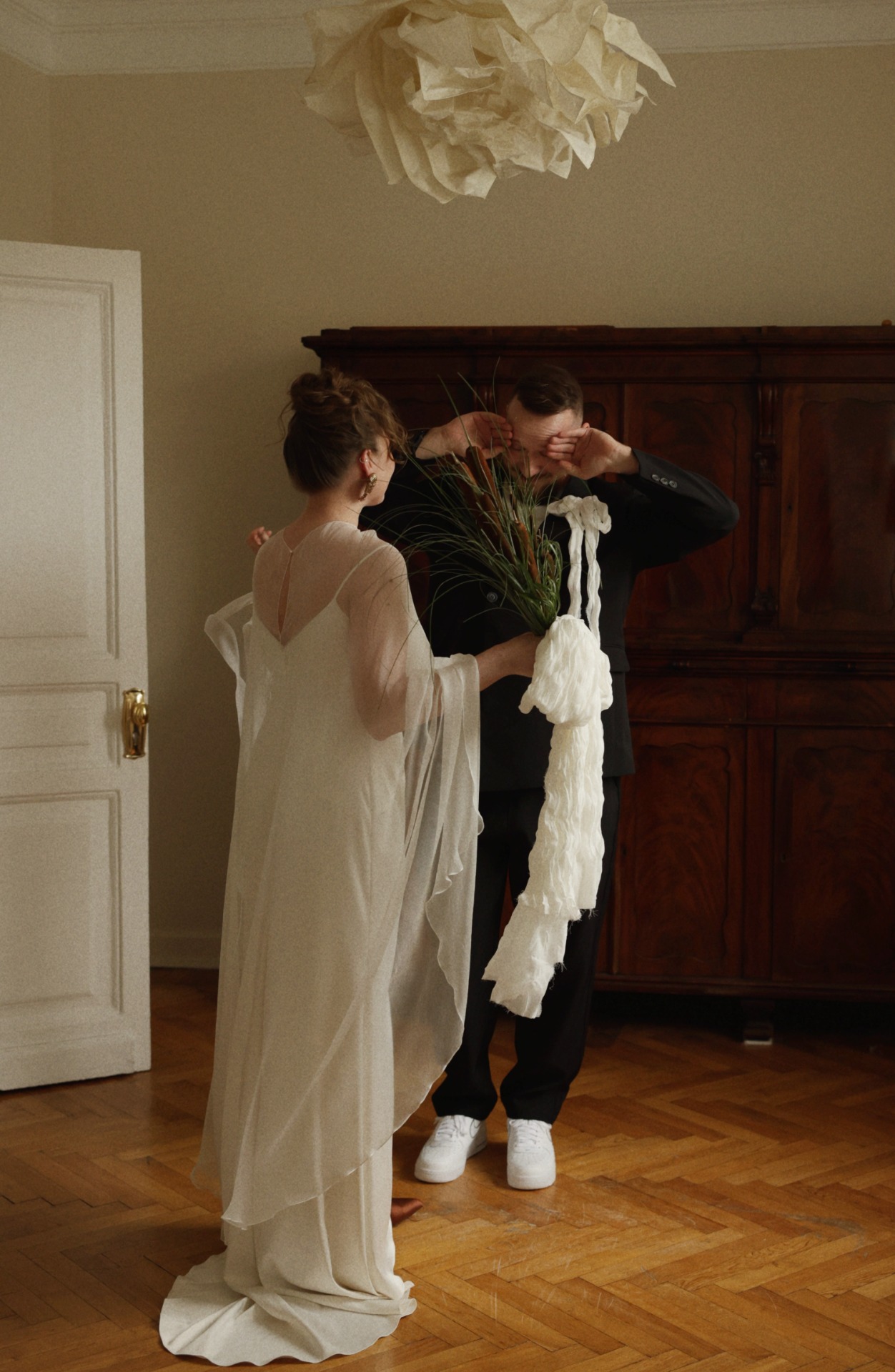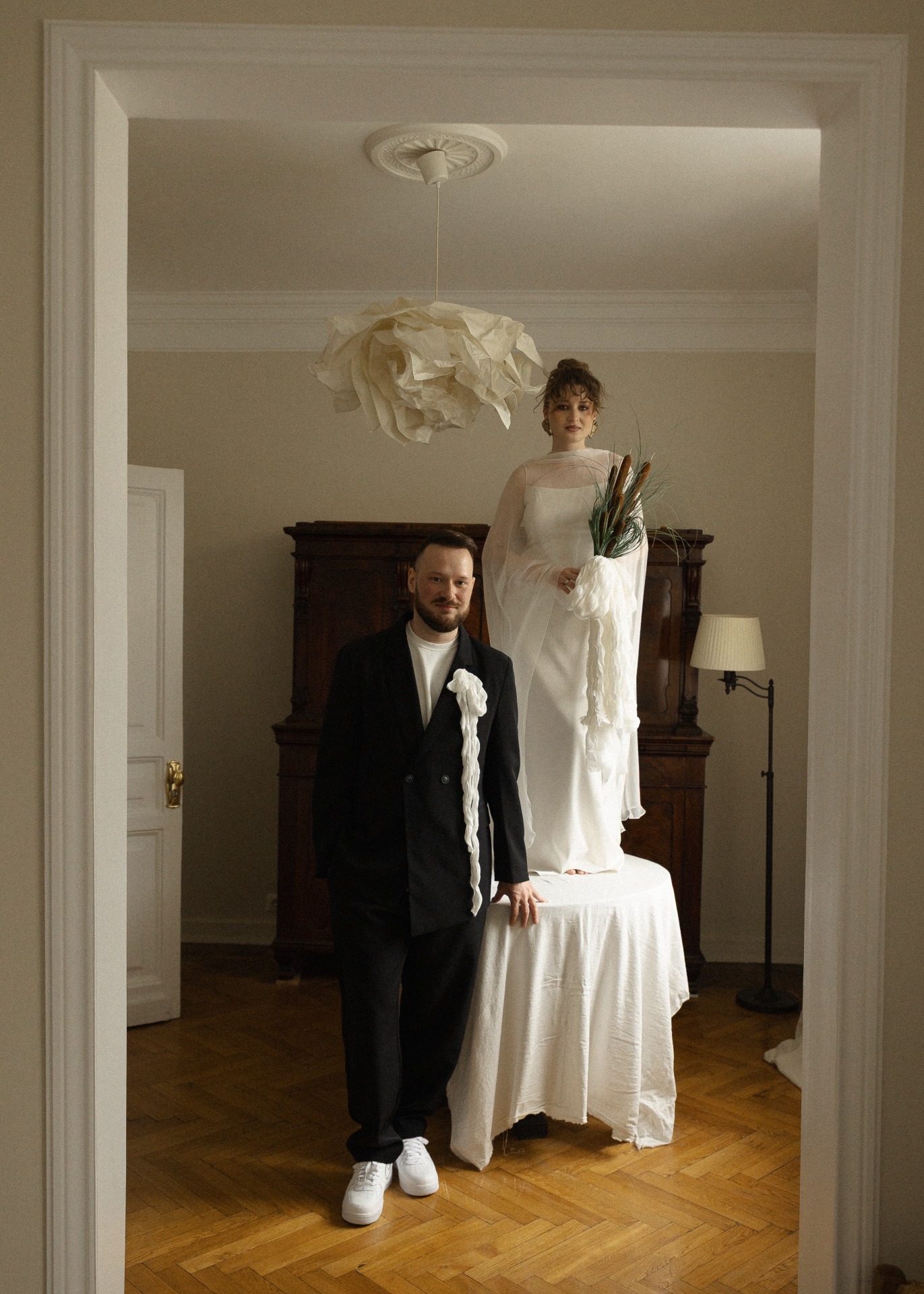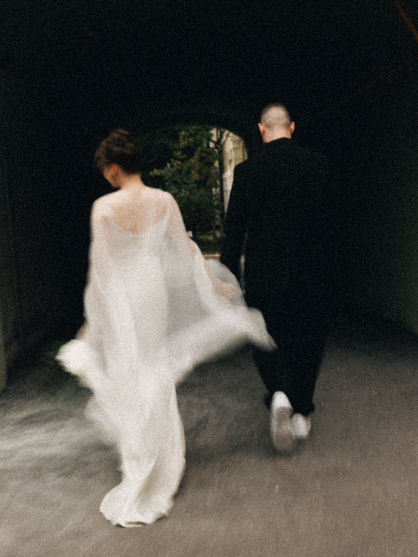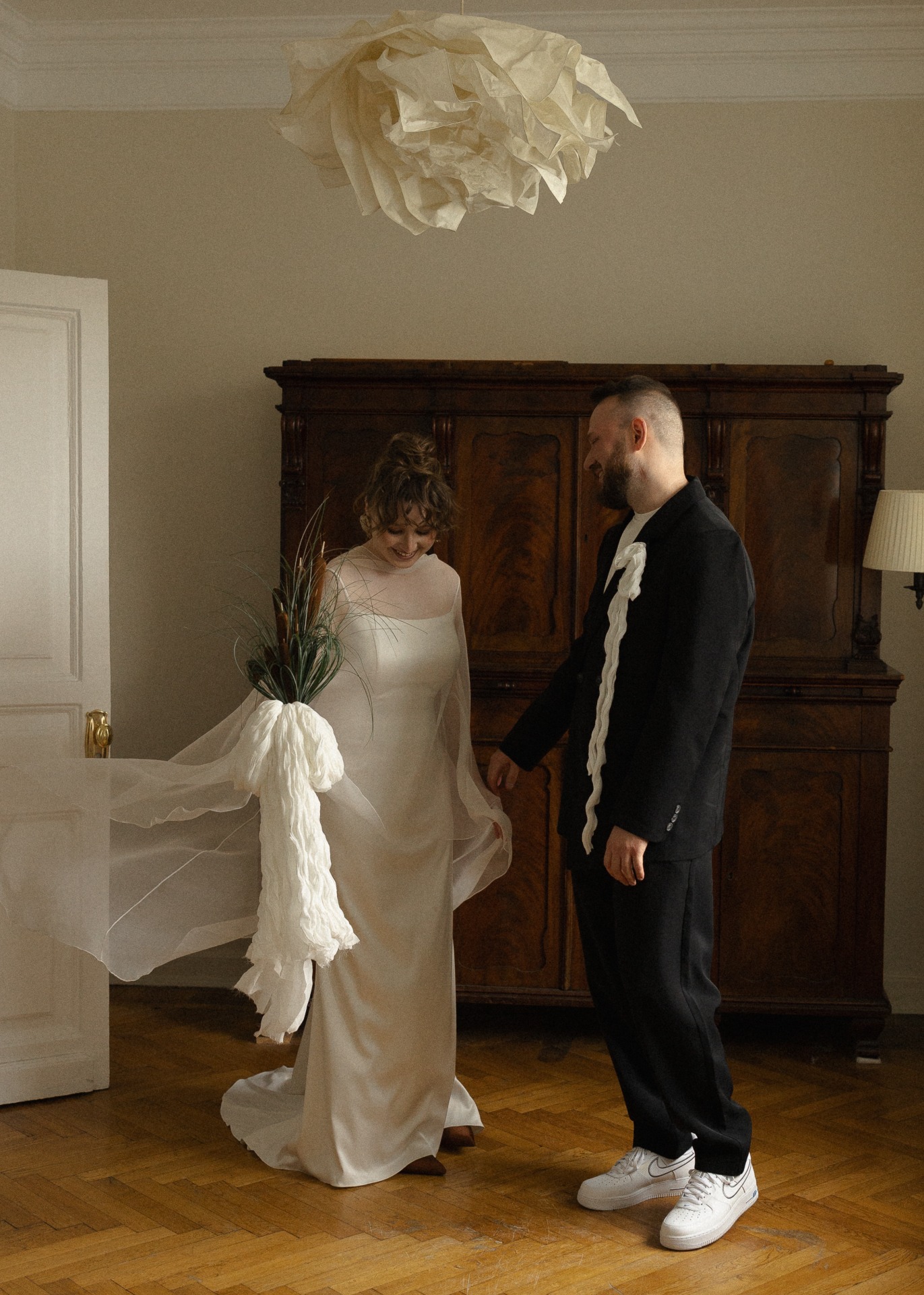 Изначально я хотела что-то в духе antibride, так как не видела себя в классике. Мы сходили с Настей в несколько салонов, померили разные варианты и решили, что будем шить мой наряд. Референсы платья я нашла на Pinterest, там же увидела кейпы, и в моей голове сложилась картинка. К слову, утренний образ мы тоже шили на заказ.