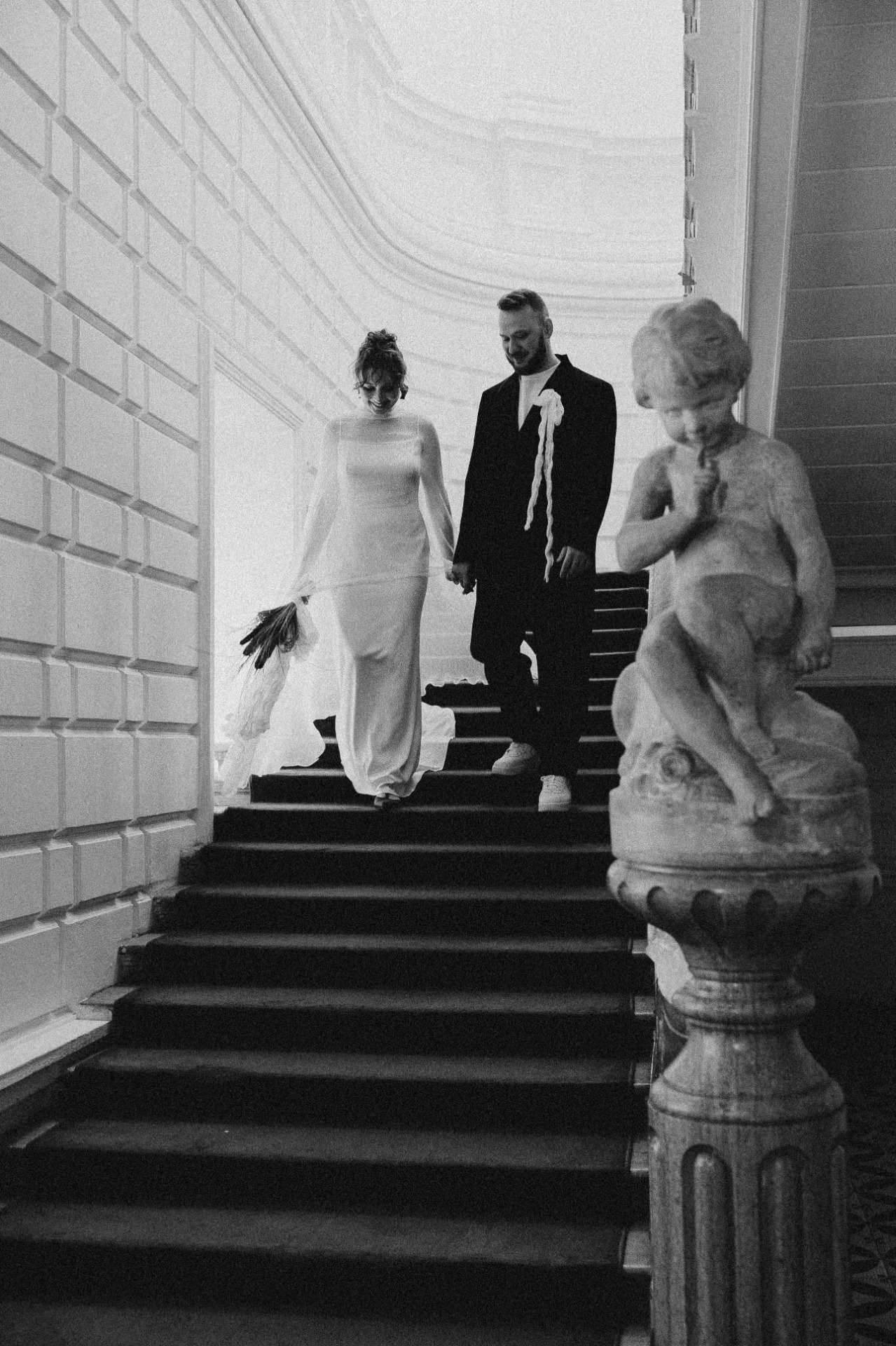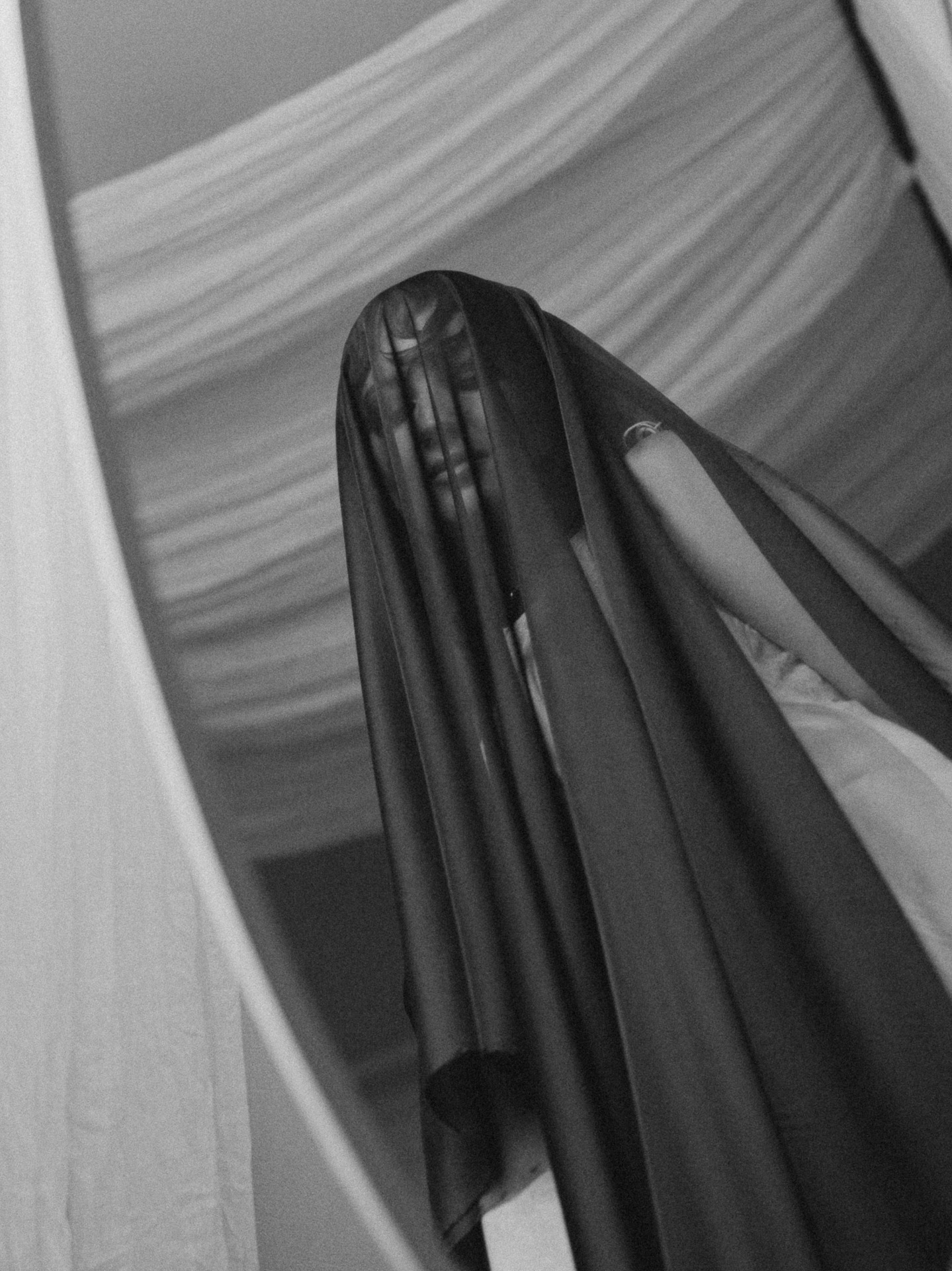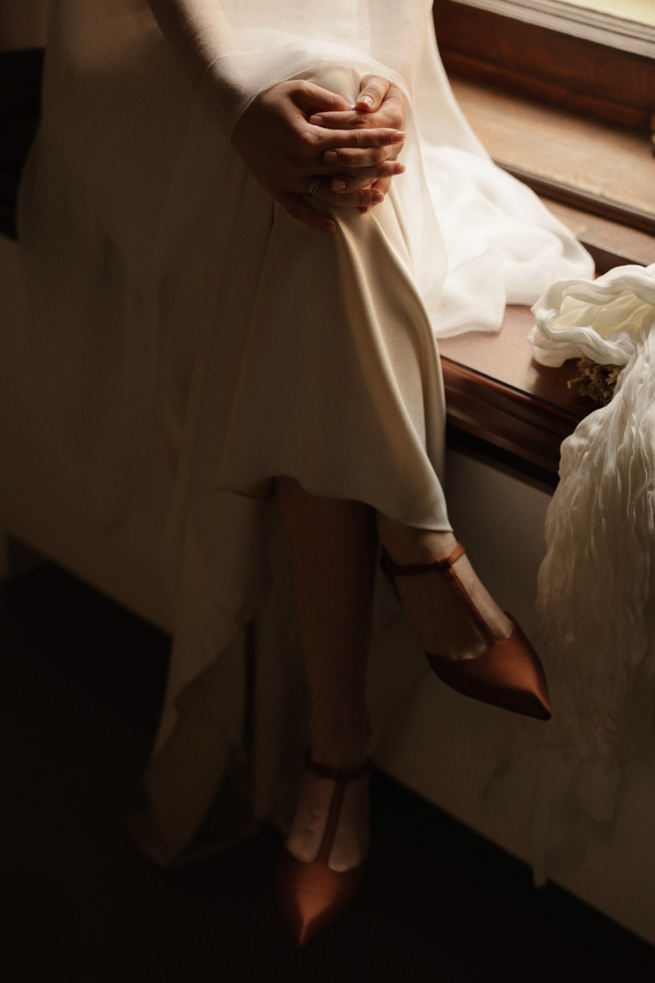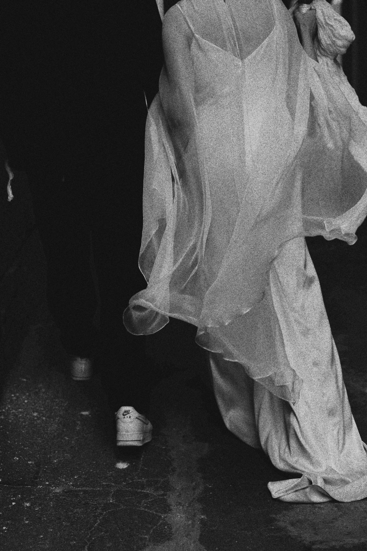 Изначально я хотела что-то в духе antibride, так как не видела себя в классике. Мы сходили с Настей в несколько салонов, померили разные варианты и решили, что будем шить мой наряд. Референсы платья я нашла на Pinterest, там же увидела кейпы, и в моей голове сложилась картинка. К слову, утренний образ мы тоже шили на заказ.