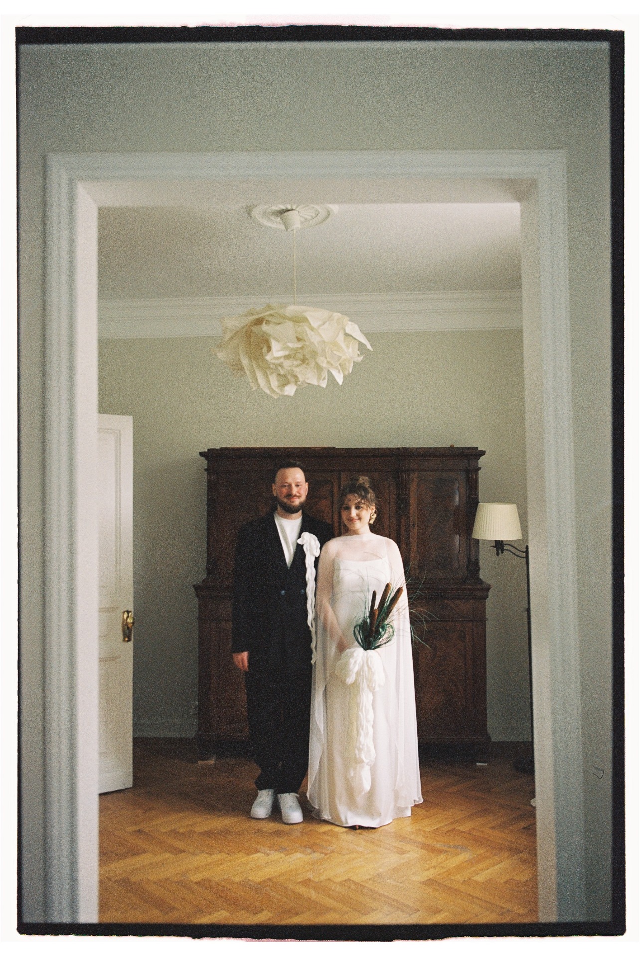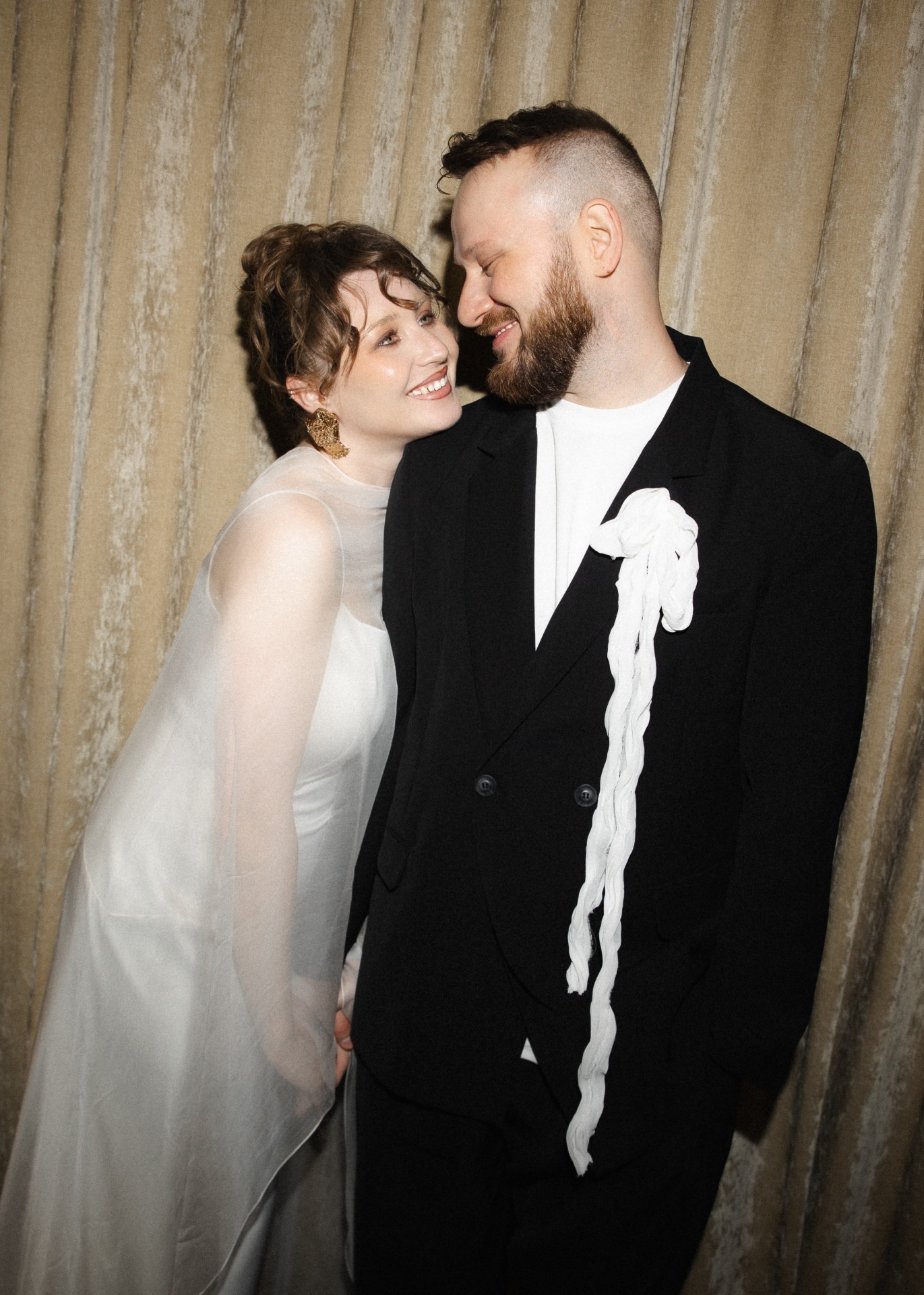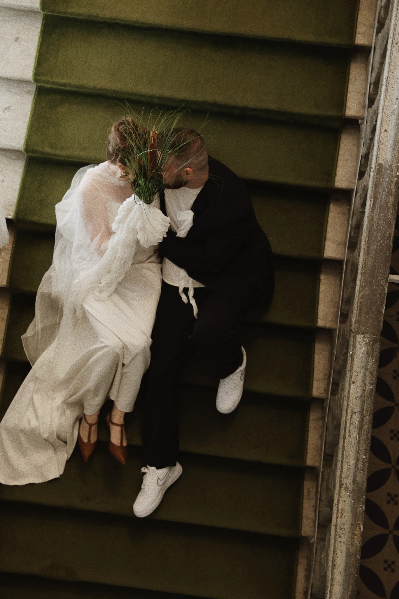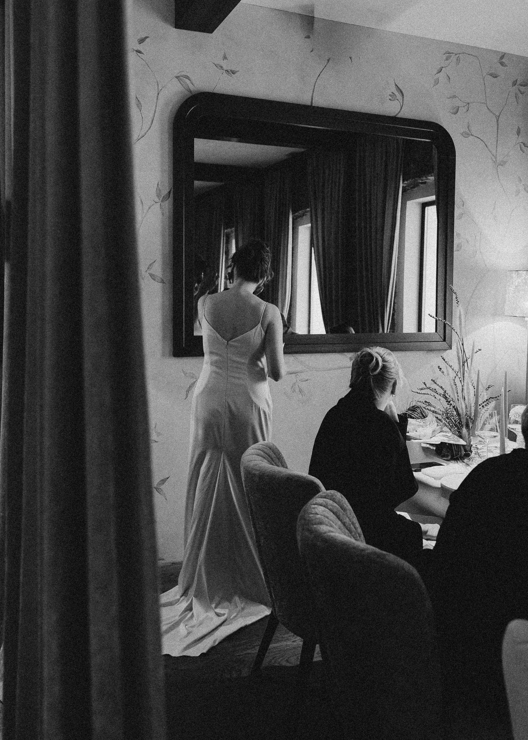 Изначально я хотела что-то в духе antibride, так как не видела себя в классике. Мы сходили с Настей в несколько салонов, померили разные варианты и решили, что будем шить мой наряд. Референсы платья я нашла на Pinterest, там же увидела кейпы, и в моей голове сложилась картинка. К слову, утренний образ мы тоже шили на заказ.