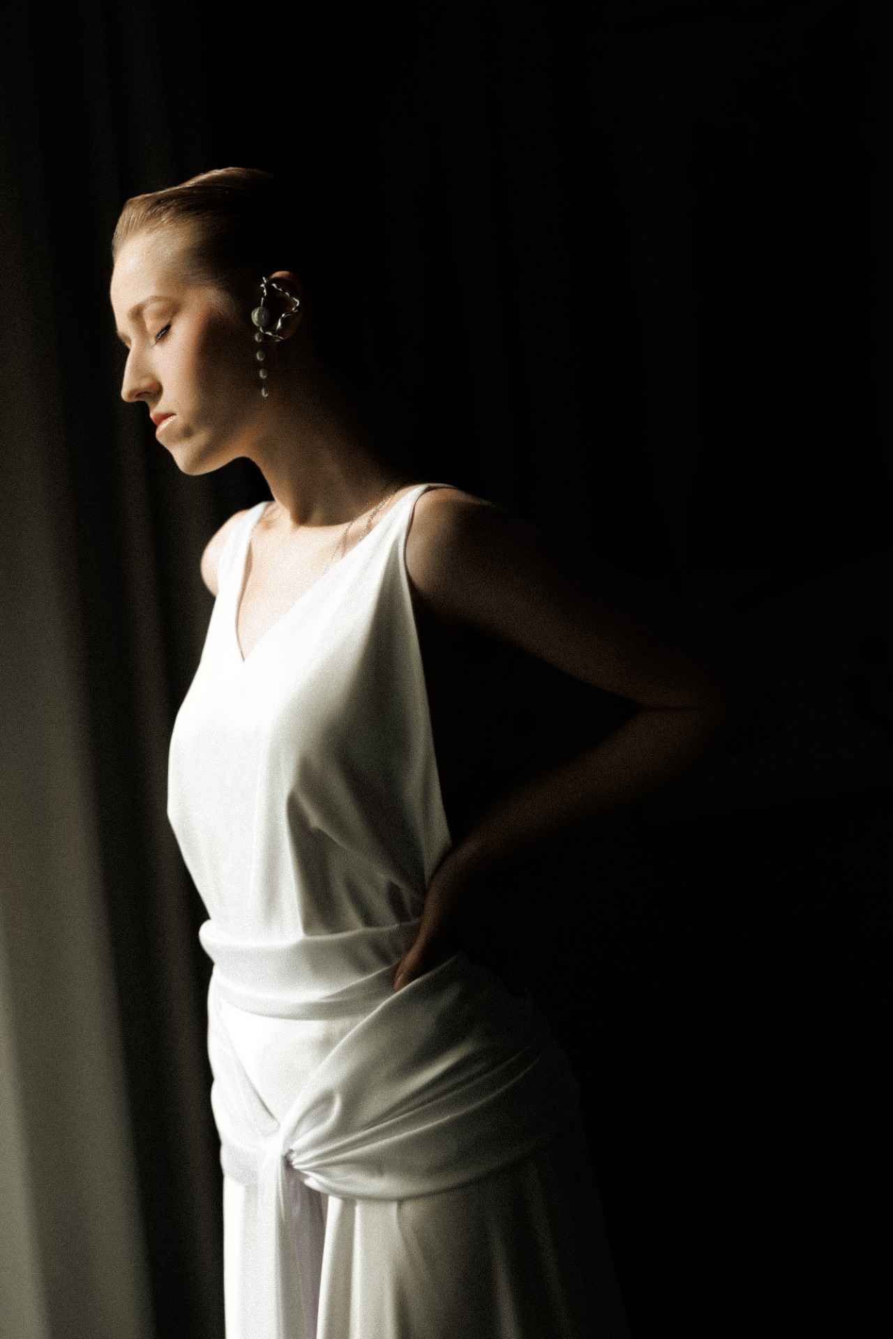 Я часто ношу асимметричные украшения, поэтому и для образа выбрала необычную моно-серьгу, а чтобы подчеркнуть открытую спину, решила выбрать сотуар.