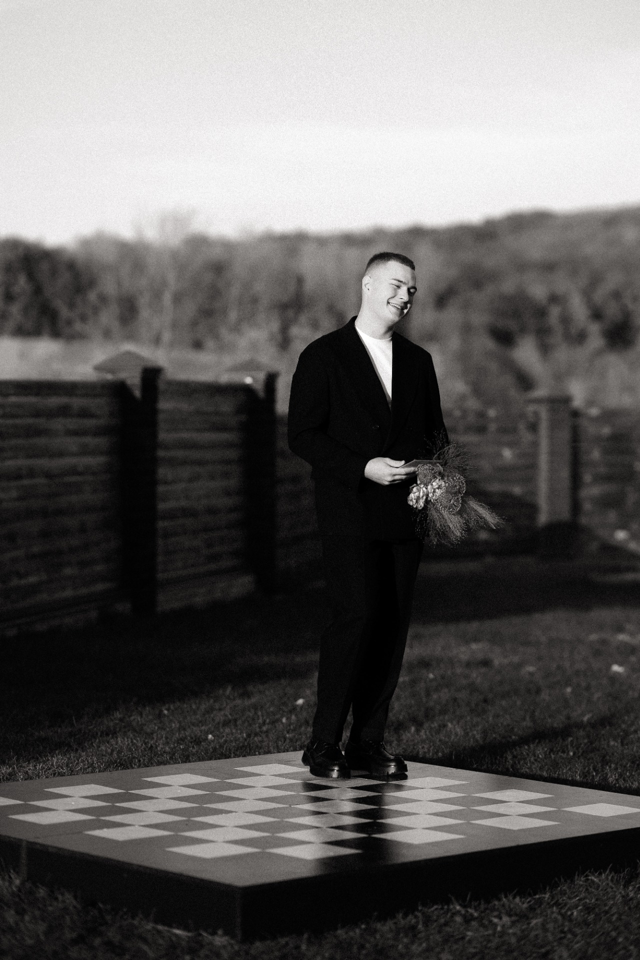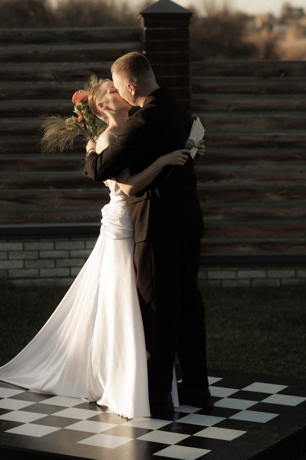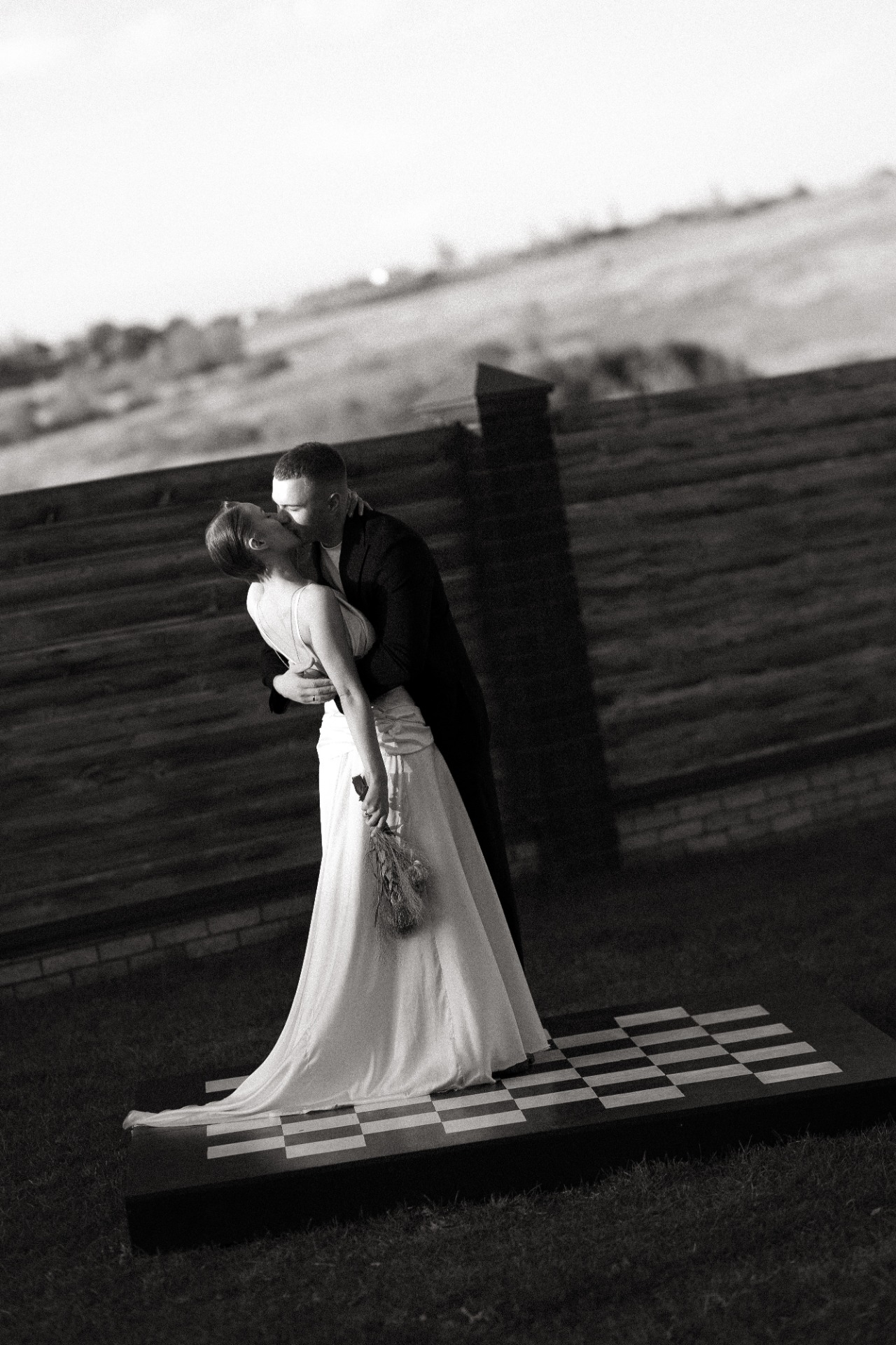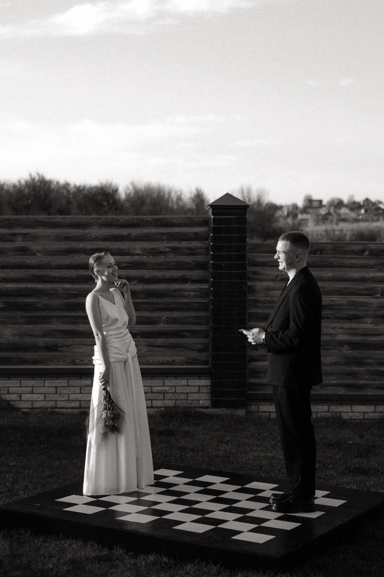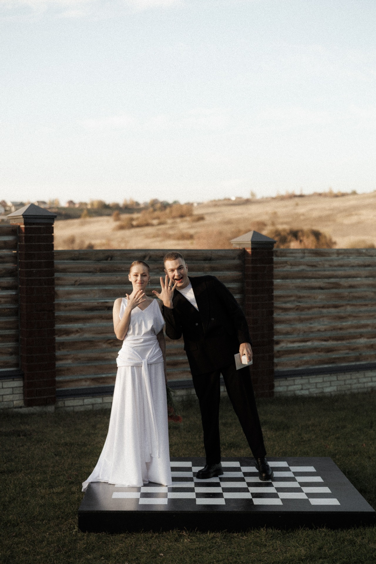 При выборе палитры и ключевых аспектов я поняла, что точно хочу сделать что-то креативное для фотозоны. Я накидала разные варианты в Pinterest, а затем обсудила их с сестрой. Ей показалась классной идея с шахматной доской и тем, как во время клятв мы с Сережей будем идти друг к другу. Поэтому мы выбрали белый и чёрный цвета, а для дресс-кода гостей добавили бежевый и серый.