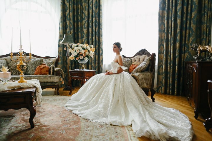 Дворцовый интерьер мы дополнили деталями и уникальной сервировкой, а воздушная композиция из роз и чарующего антуриума создала невероятную атмосферу роскоши. Акцентом в декоре также стал позолоченный канделябр с тонкими молочными свечами. Невеста в стиле Dolce&Gabbana — Королева на своем торжестве. Воплотившаяся в жизнь мечта из детства.