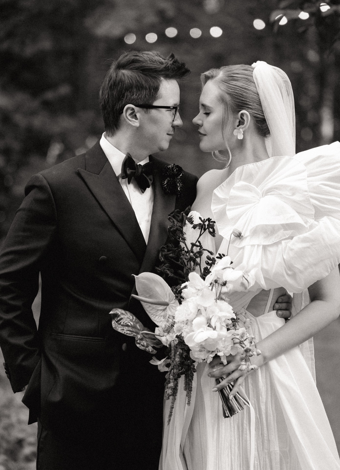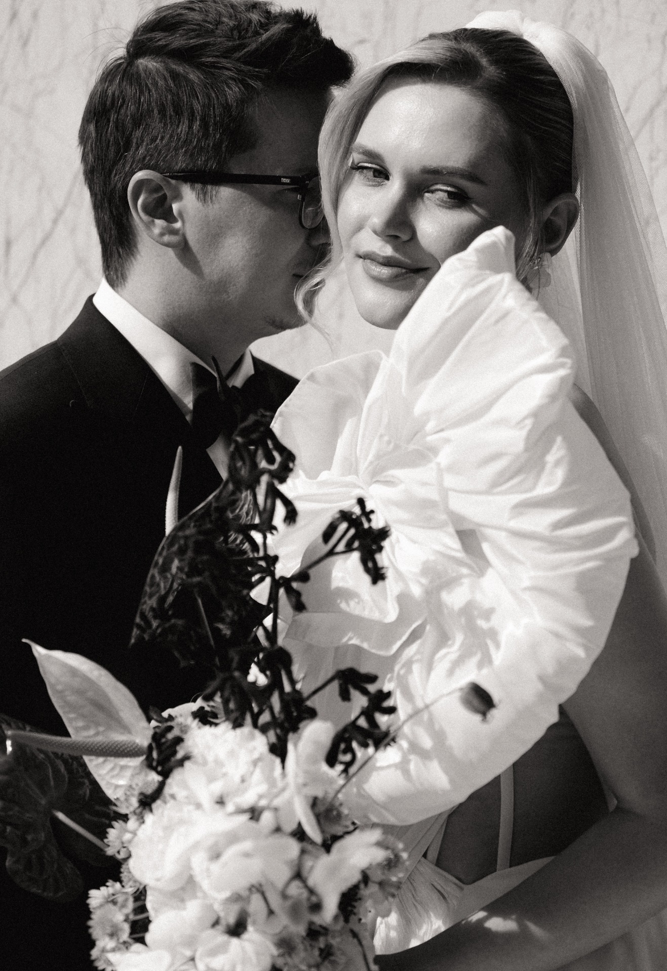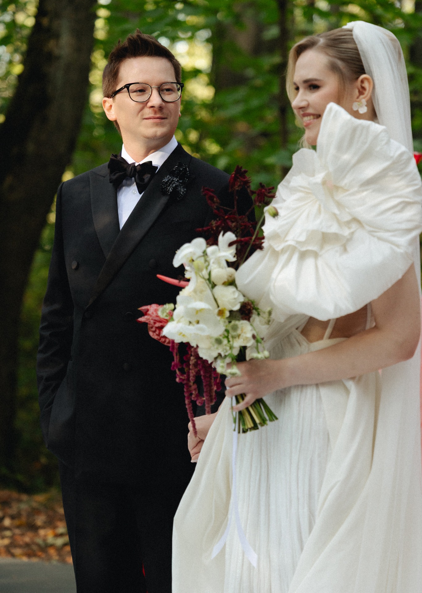 Руслан подбирал образ самостоятельно — ему хотелось чего-то лаконичного и утончённого. Мы быстро поняли, что в обычных магазинах идеальный костюм не найти, поэтому решили шить его на заказ в Amanti Dei Costumi. Бутоньерку нам тоже хотелось не классическую. В итоге наш выбор пал на необычный чёрный фарфоровый ирис-брошь от Big Brooch.
