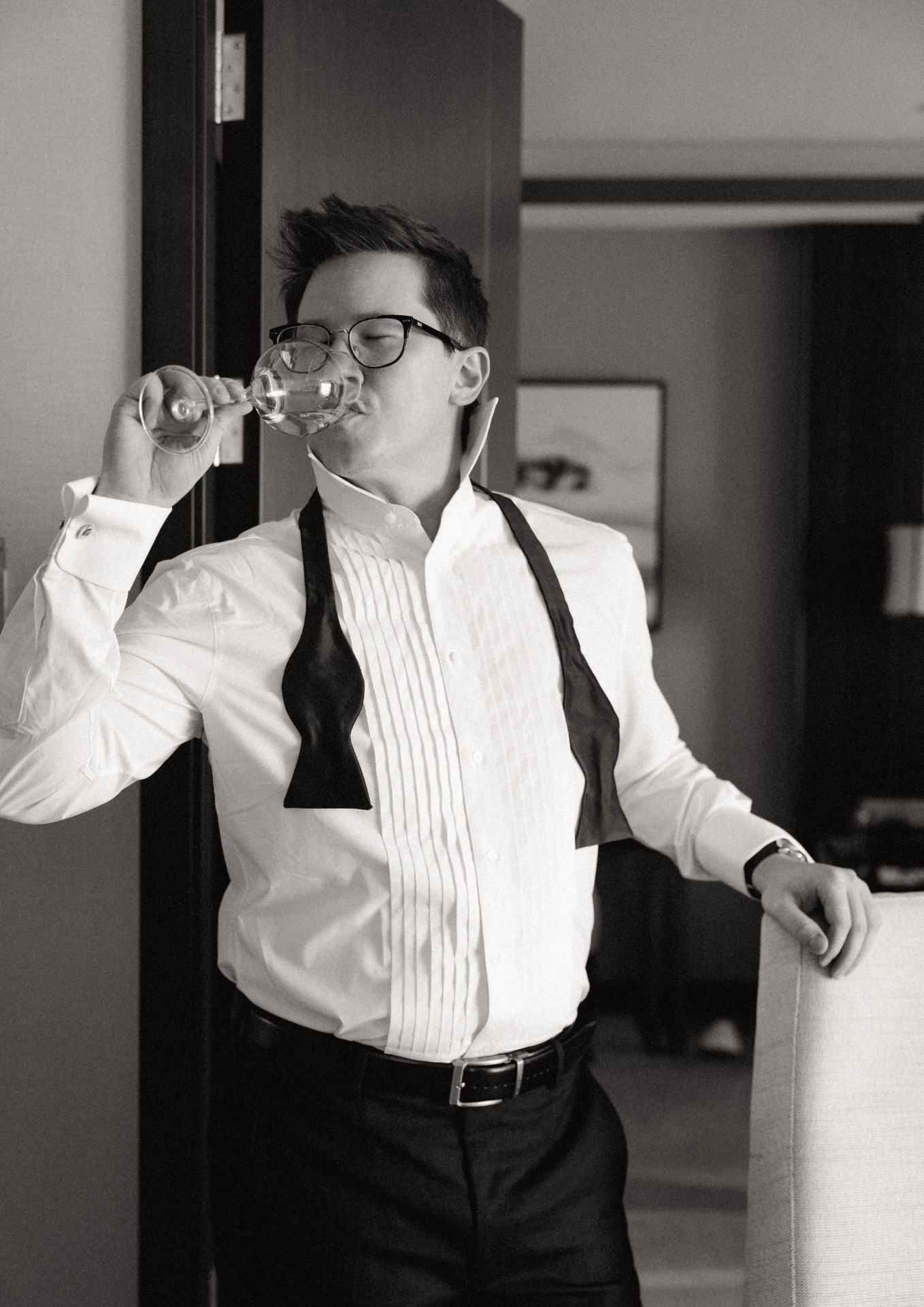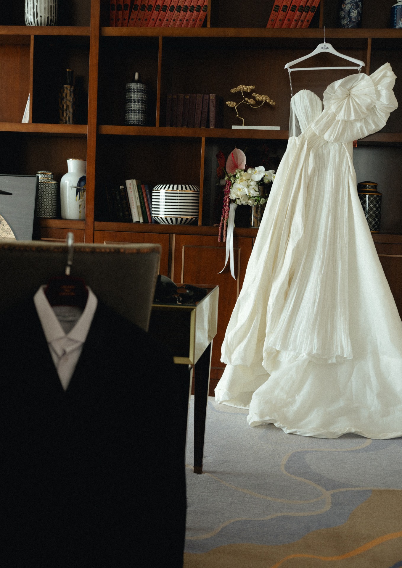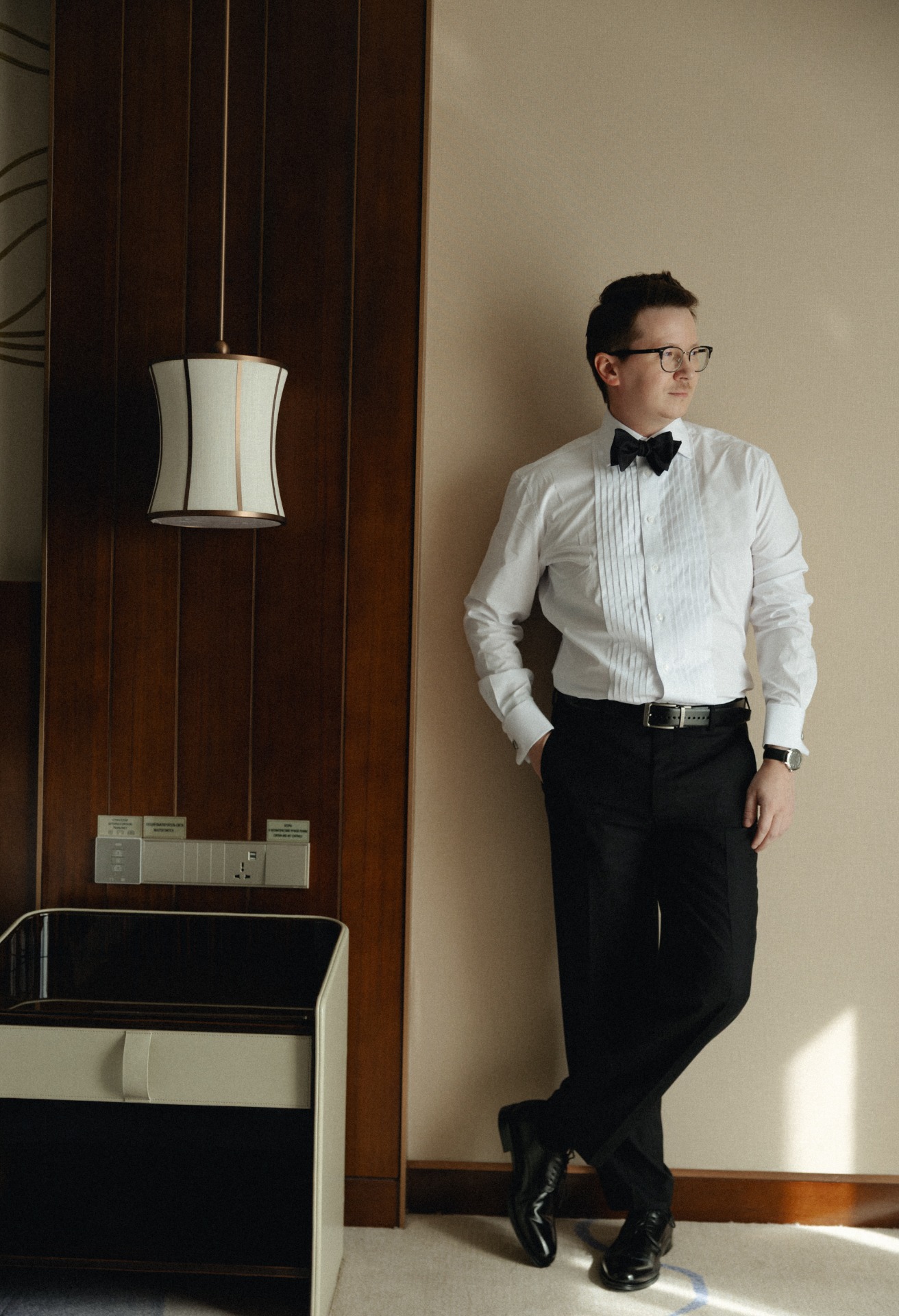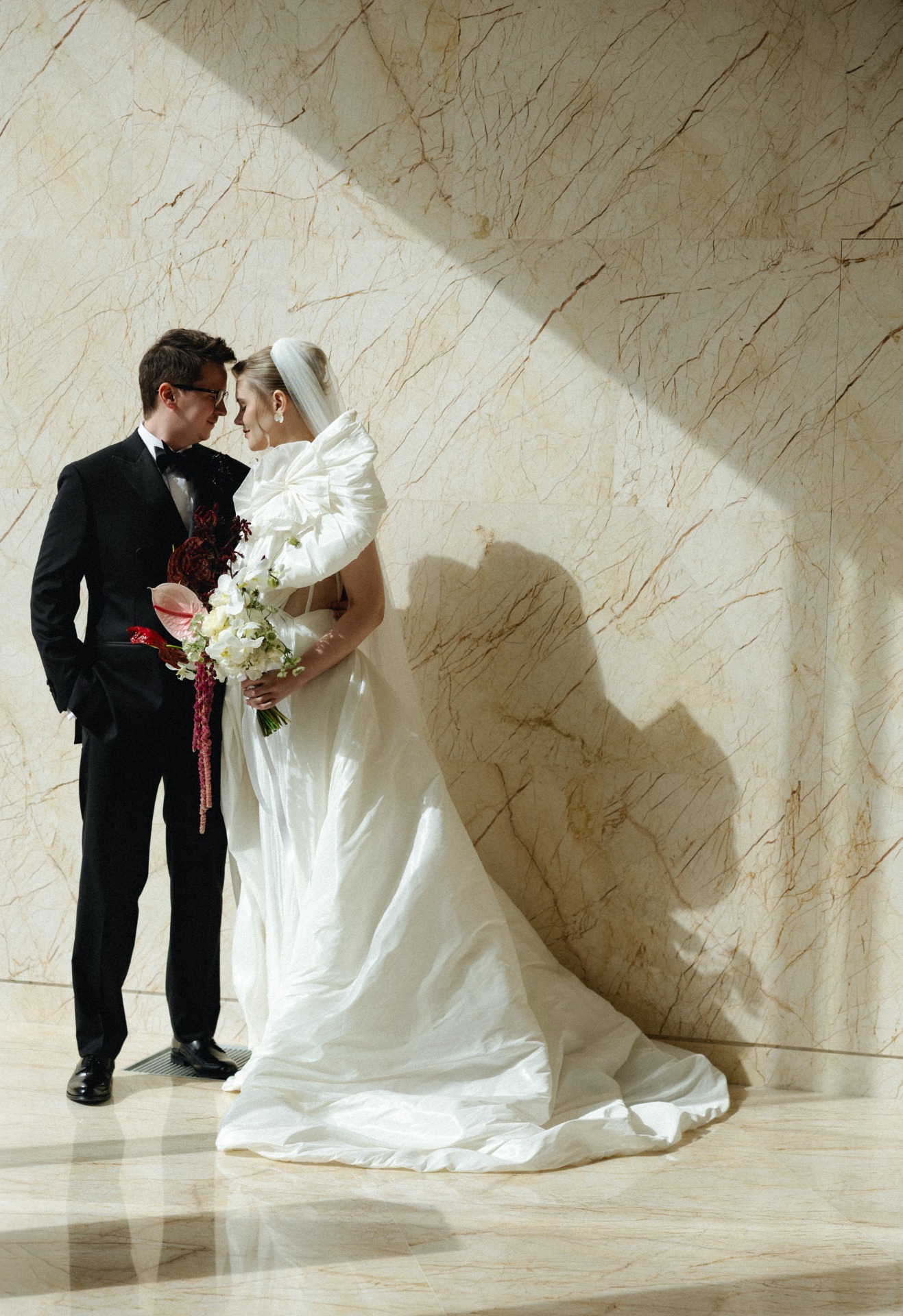 Руслан подбирал образ самостоятельно — ему хотелось чего-то лаконичного и утончённого. Мы быстро поняли, что в обычных магазинах идеальный костюм не найти, поэтому решили шить его на заказ в Amanti Dei Costumi. Бутоньерку нам тоже хотелось не классическую. В итоге наш выбор пал на необычный чёрный фарфоровый ирис-брошь от Big Brooch.