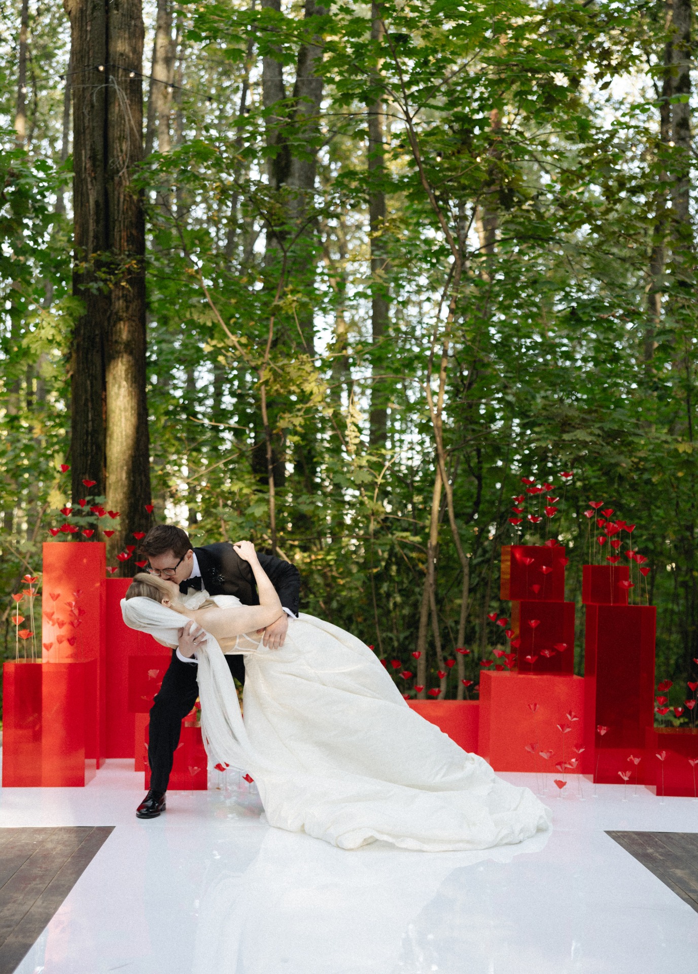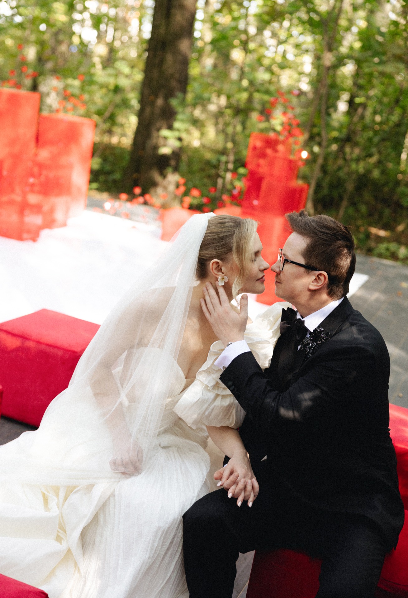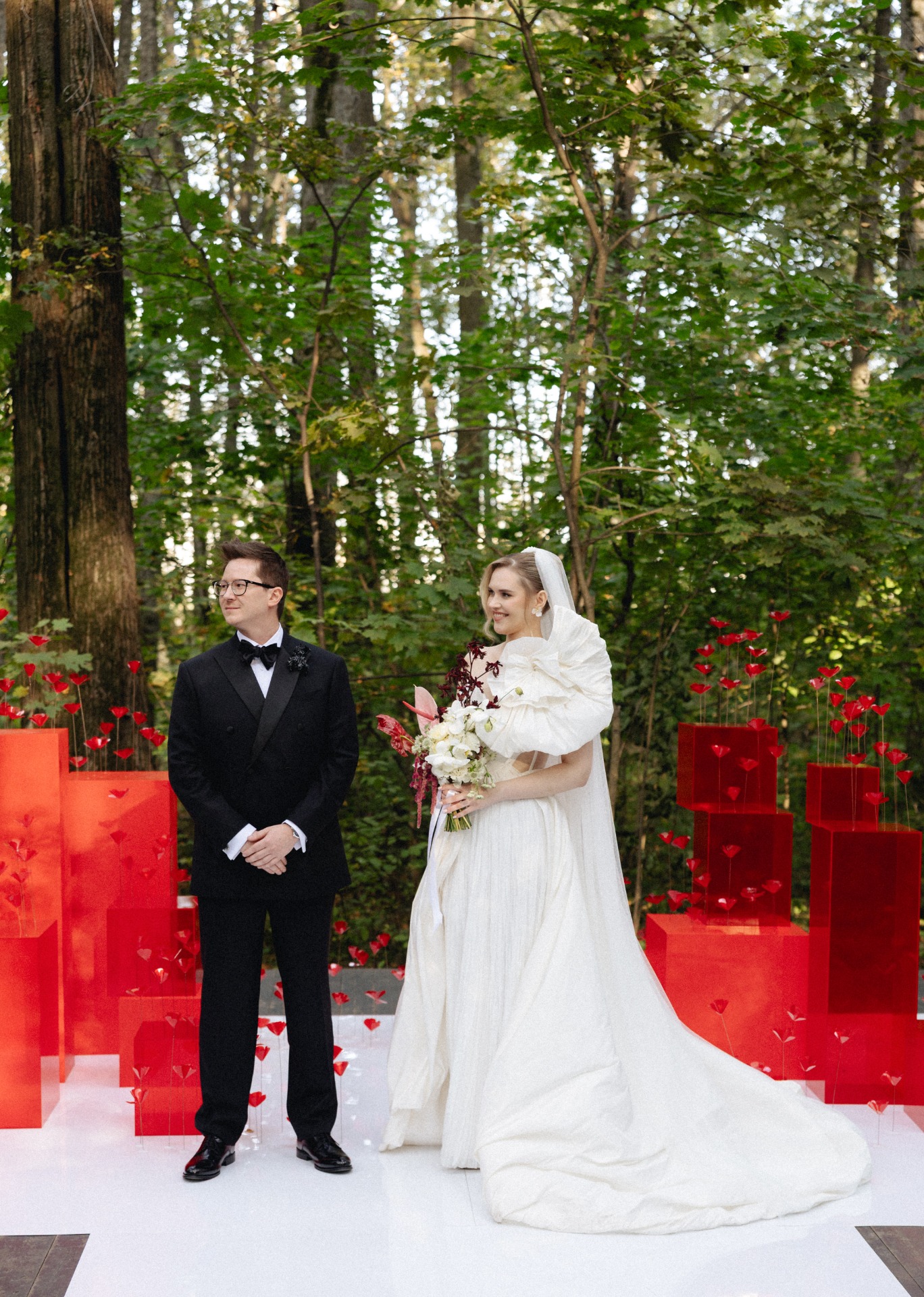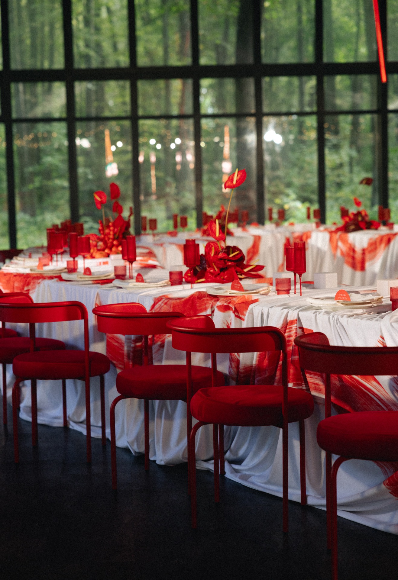 Что касается палитры и декора, у нас не было чёткого видения. Как и многие пары, мы просто отправили референсы с Pinterest — то, что откликалось нам по настроению. Мы знали только одно: нам не хотелось излишней флористики, мы отдавали предпочтение чему-то необычному и смелому, как в сервировке столов, так и в зоне церемонии. Нам хотелось ярких красок, а не нюдовой классики.