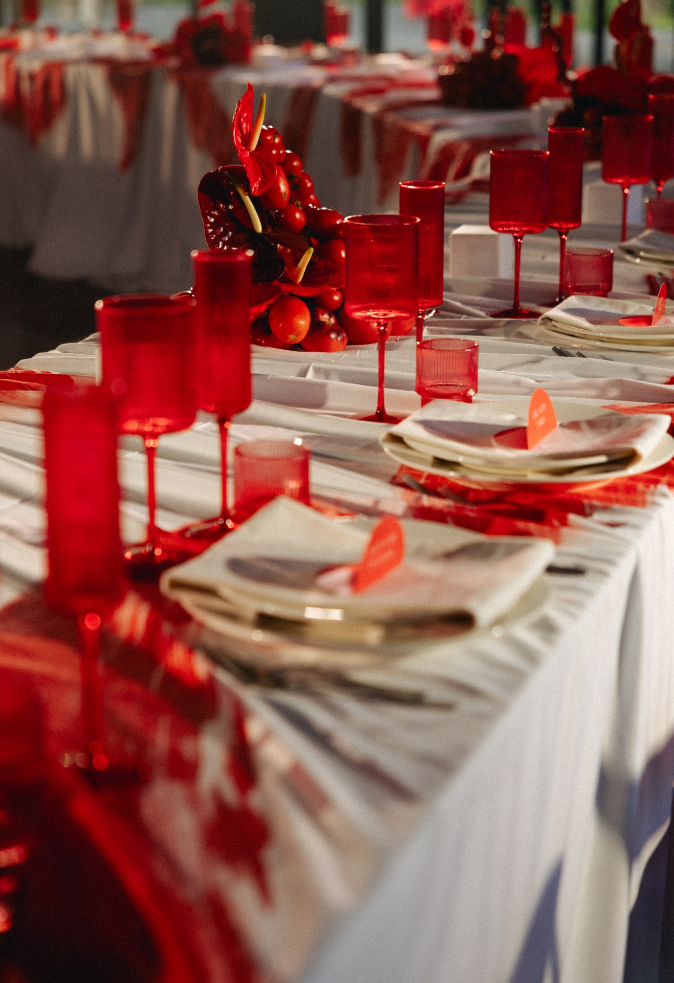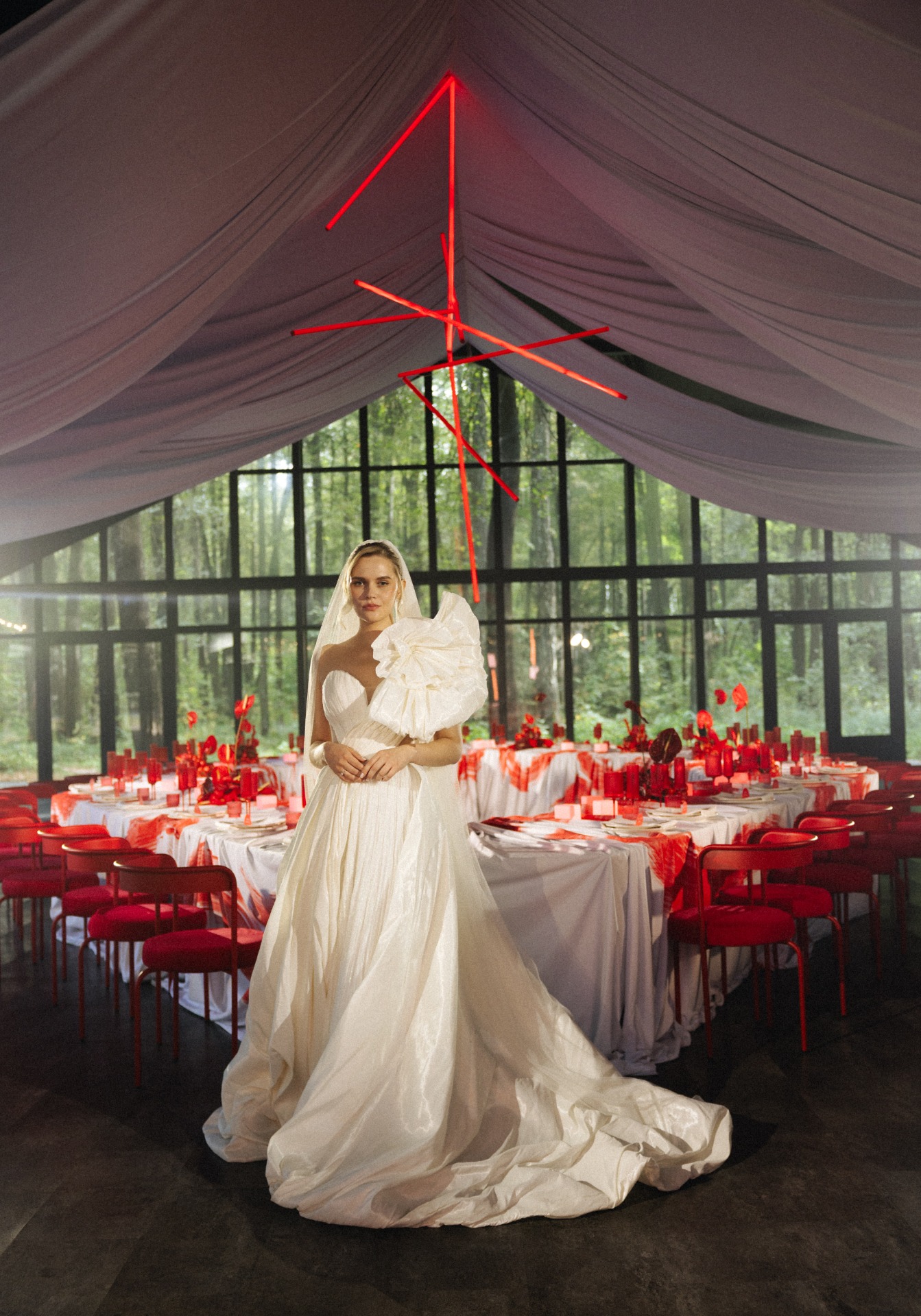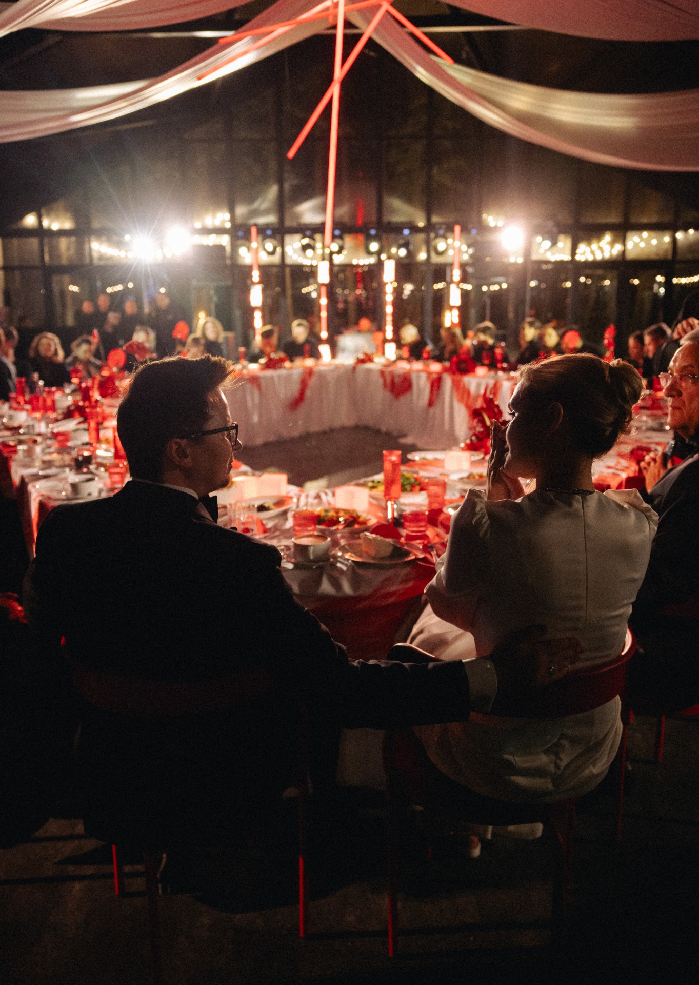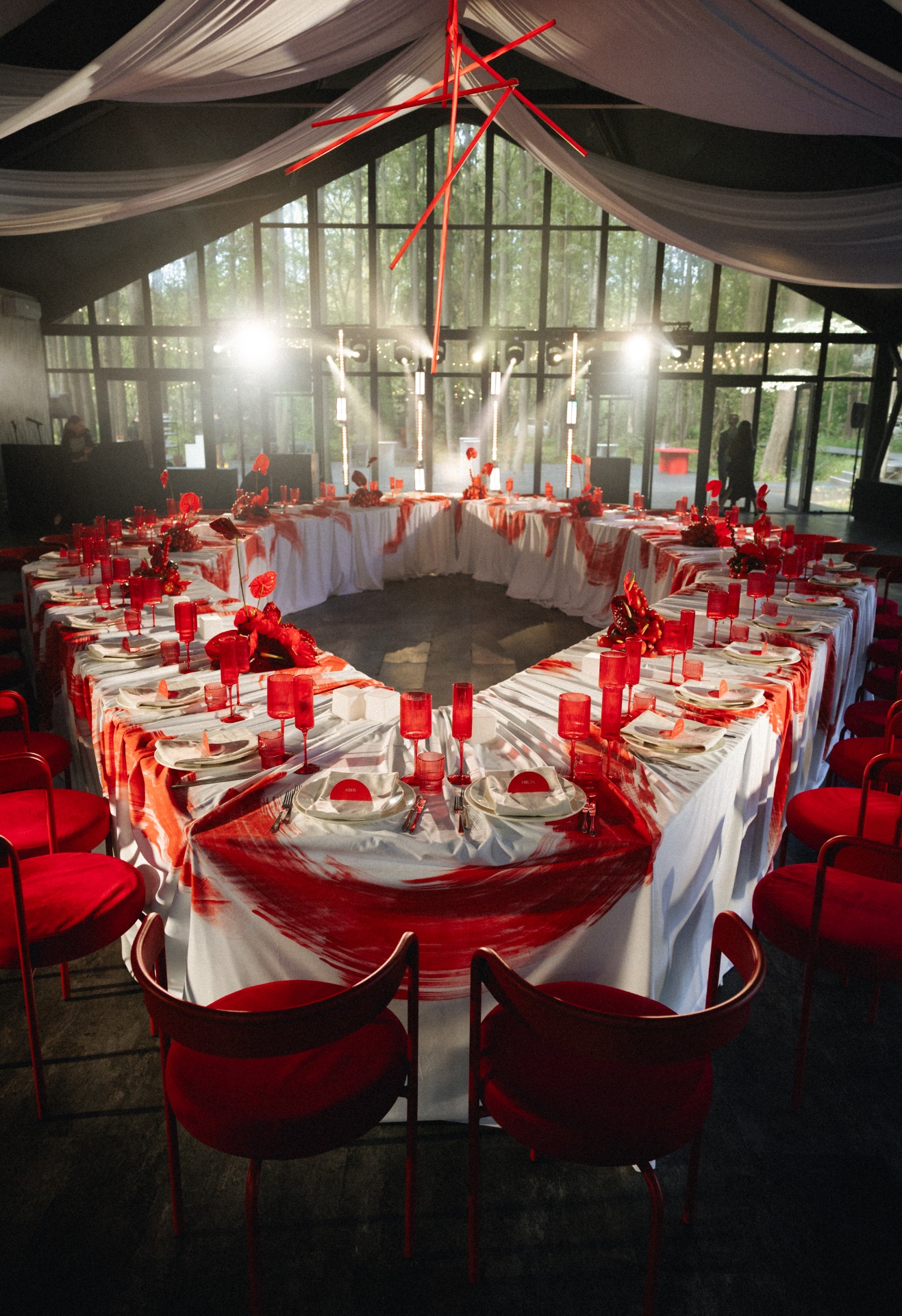 Что касается палитры и декора, у нас не было чёткого видения. Как и многие пары, мы просто отправили референсы с Pinterest — то, что откликалось нам по настроению. Мы знали только одно: нам не хотелось излишней флористики, мы отдавали предпочтение чему-то необычному и смелому, как в сервировке столов, так и в зоне церемонии. Нам хотелось ярких красок, а не нюдовой классики.