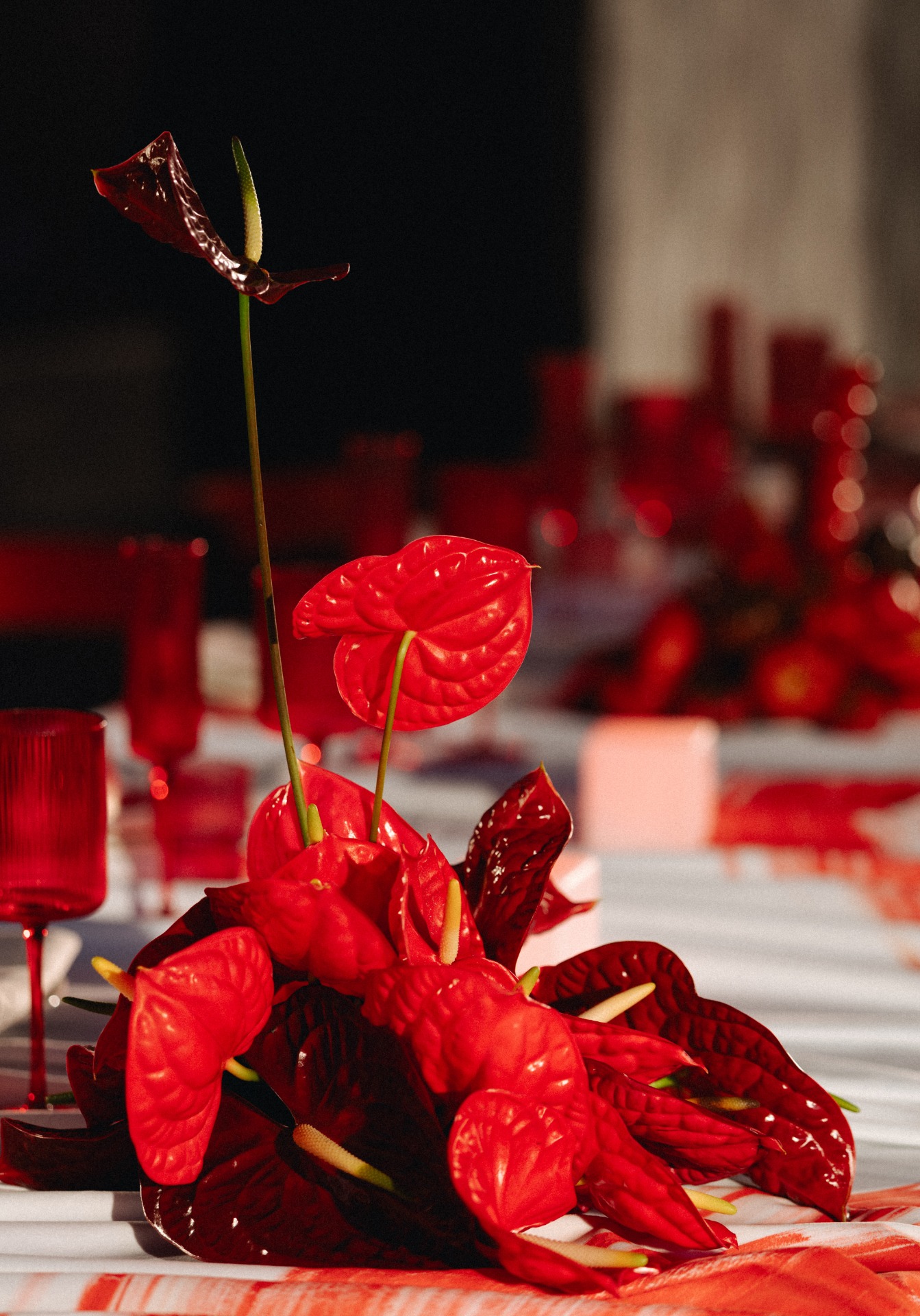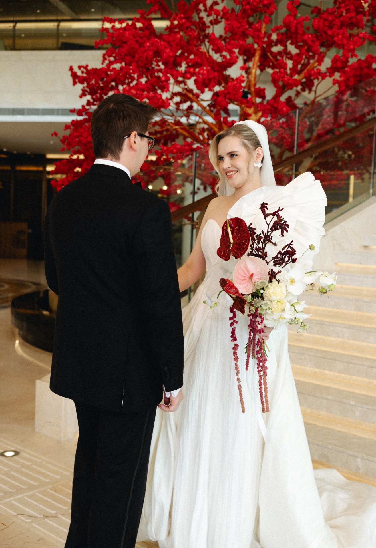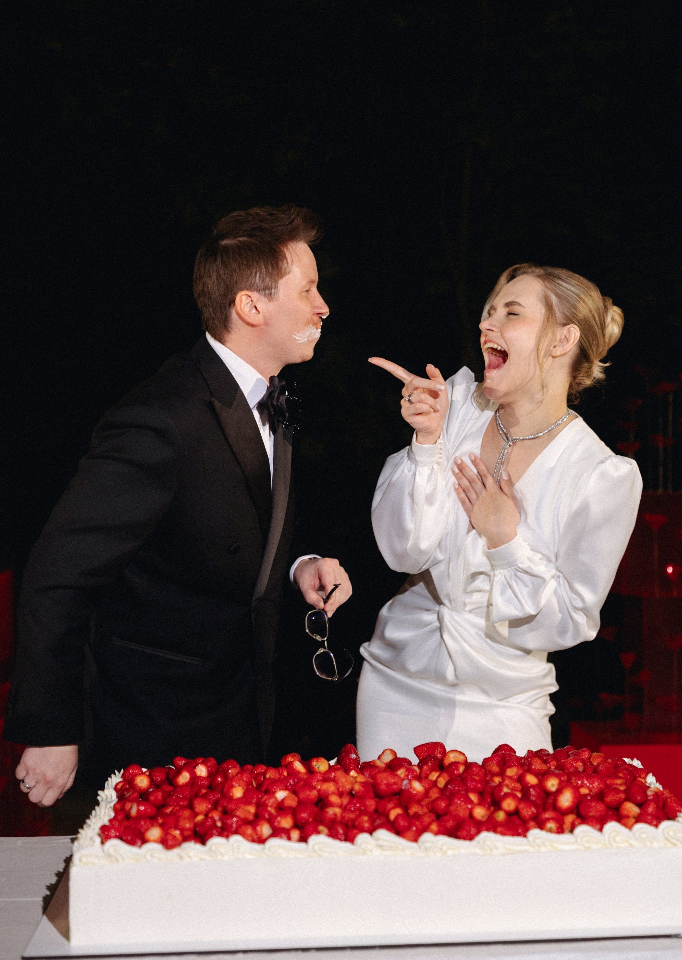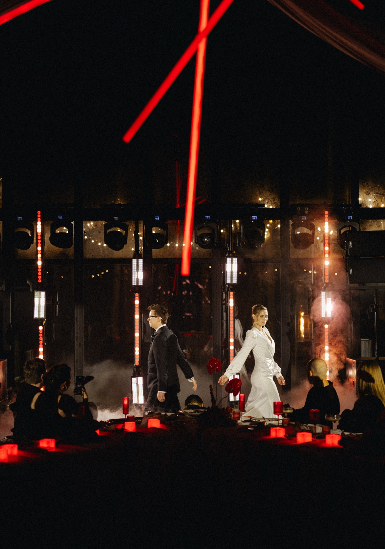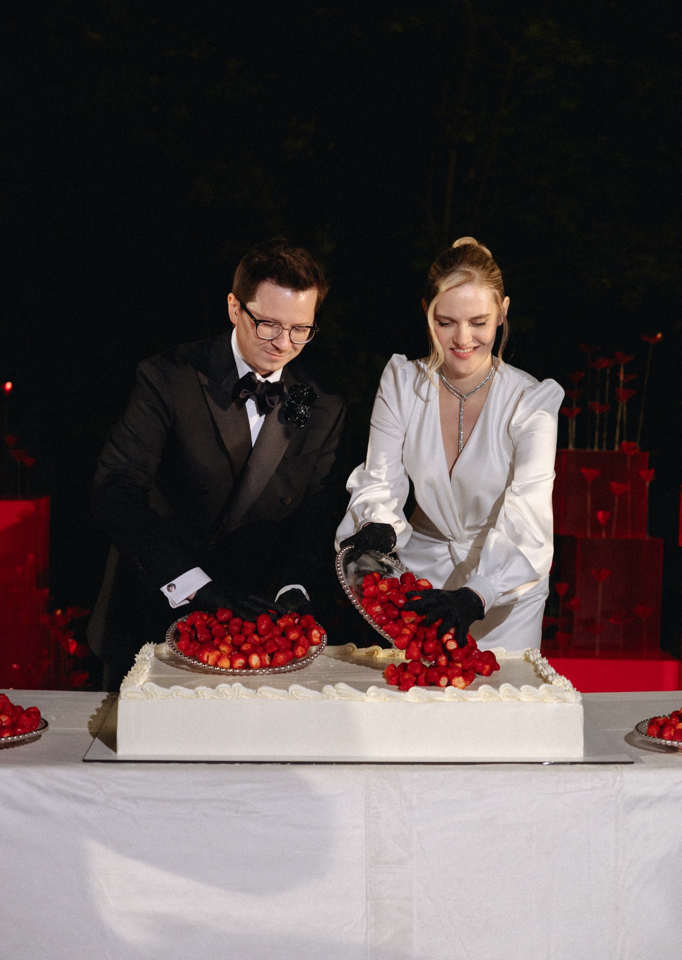 Что касается палитры и декора, у нас не было чёткого видения. Как и многие пары, мы просто отправили референсы с Pinterest — то, что откликалось нам по настроению. Мы знали только одно: нам не хотелось излишней флористики, мы отдавали предпочтение чему-то необычному и смелому, как в сервировке столов, так и в зоне церемонии. Нам хотелось ярких красок, а не нюдовой классики.