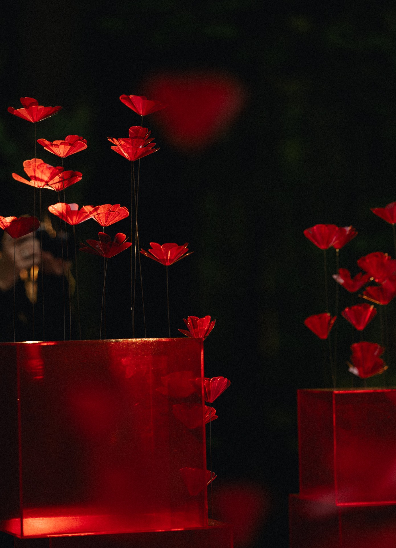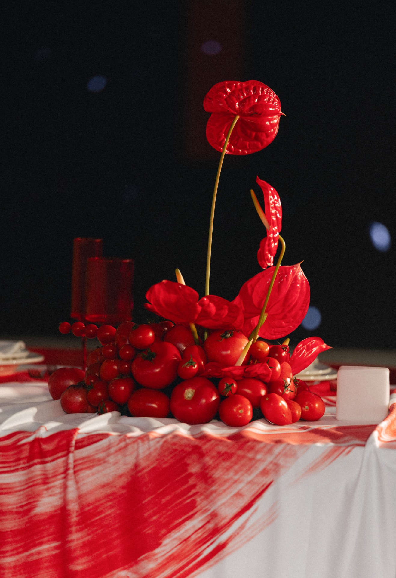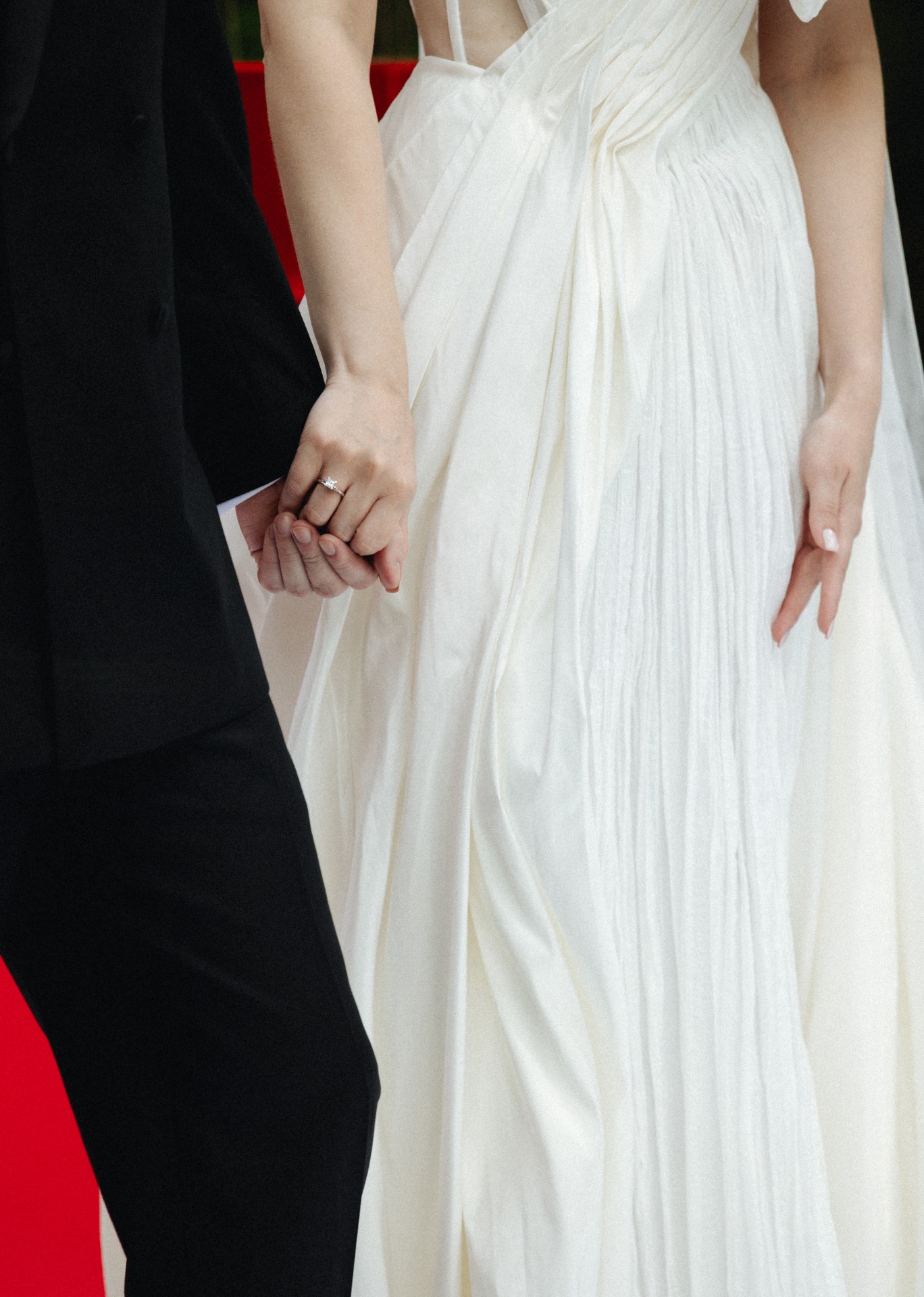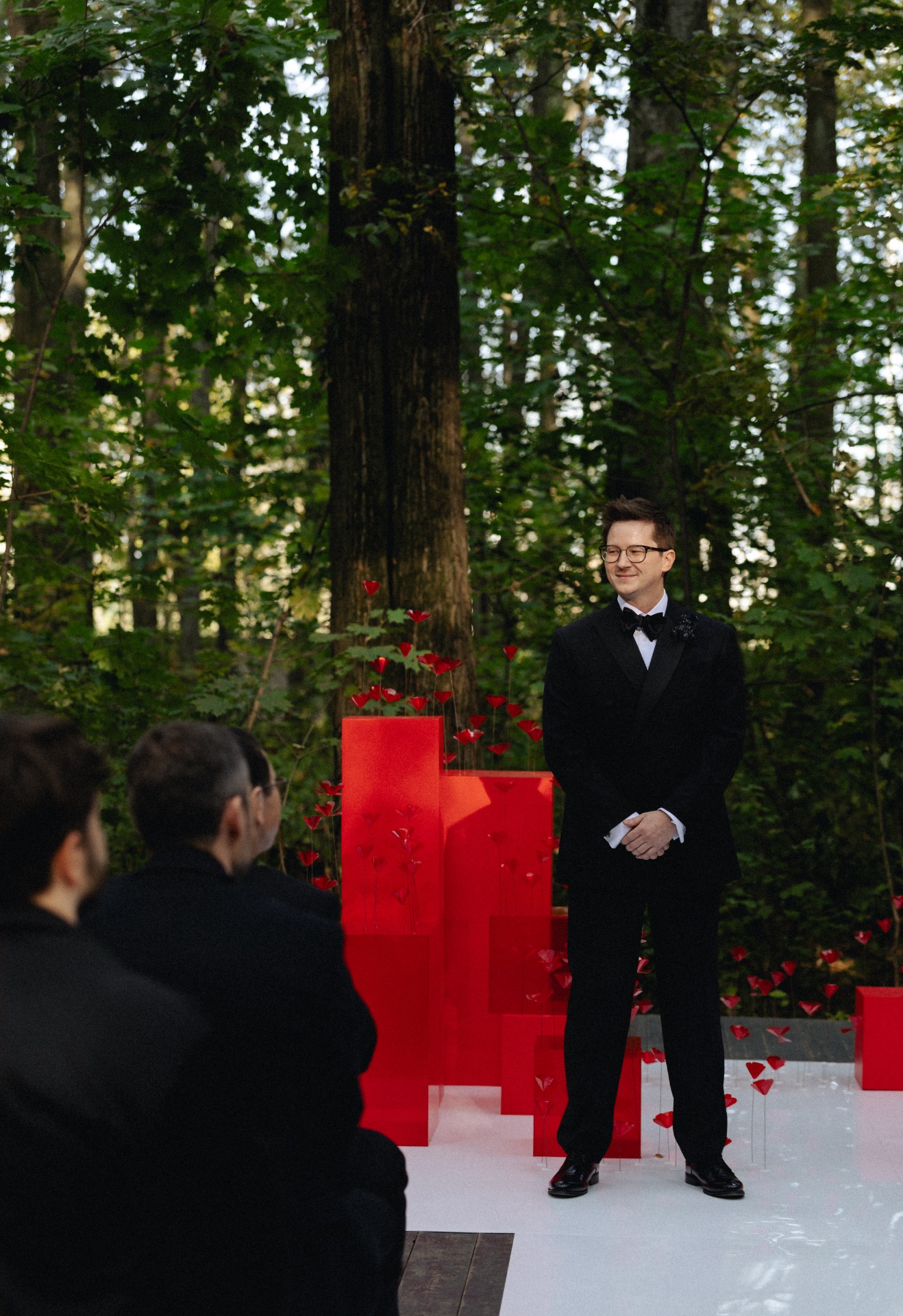 Что касается палитры и декора, у нас не было чёткого видения. Как и многие пары, мы просто отправили референсы с Pinterest — то, что откликалось нам по настроению. Мы знали только одно: нам не хотелось излишней флористики, мы отдавали предпочтение чему-то необычному и смелому, как в сервировке столов, так и в зоне церемонии. Нам хотелось ярких красок, а не нюдовой классики.