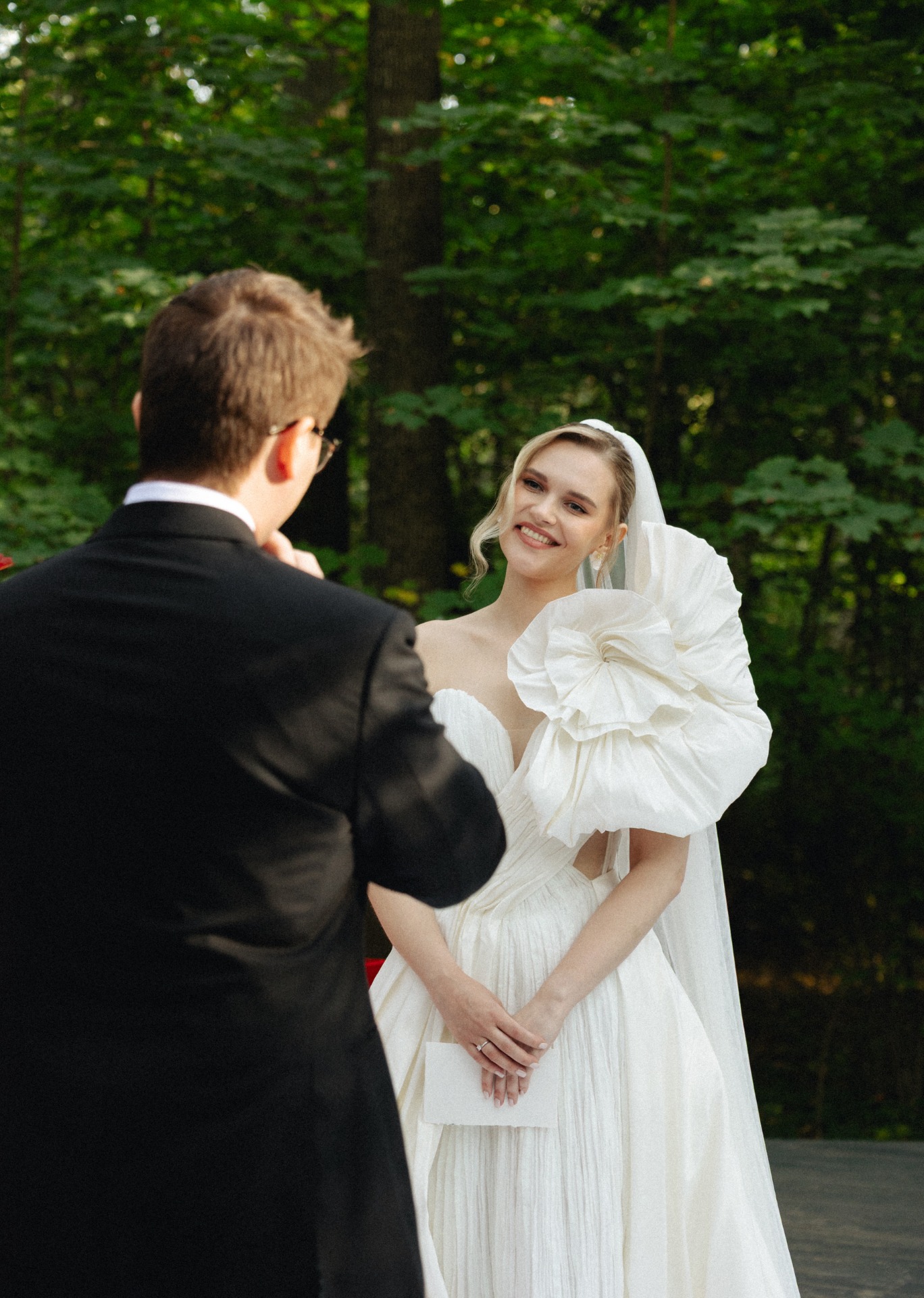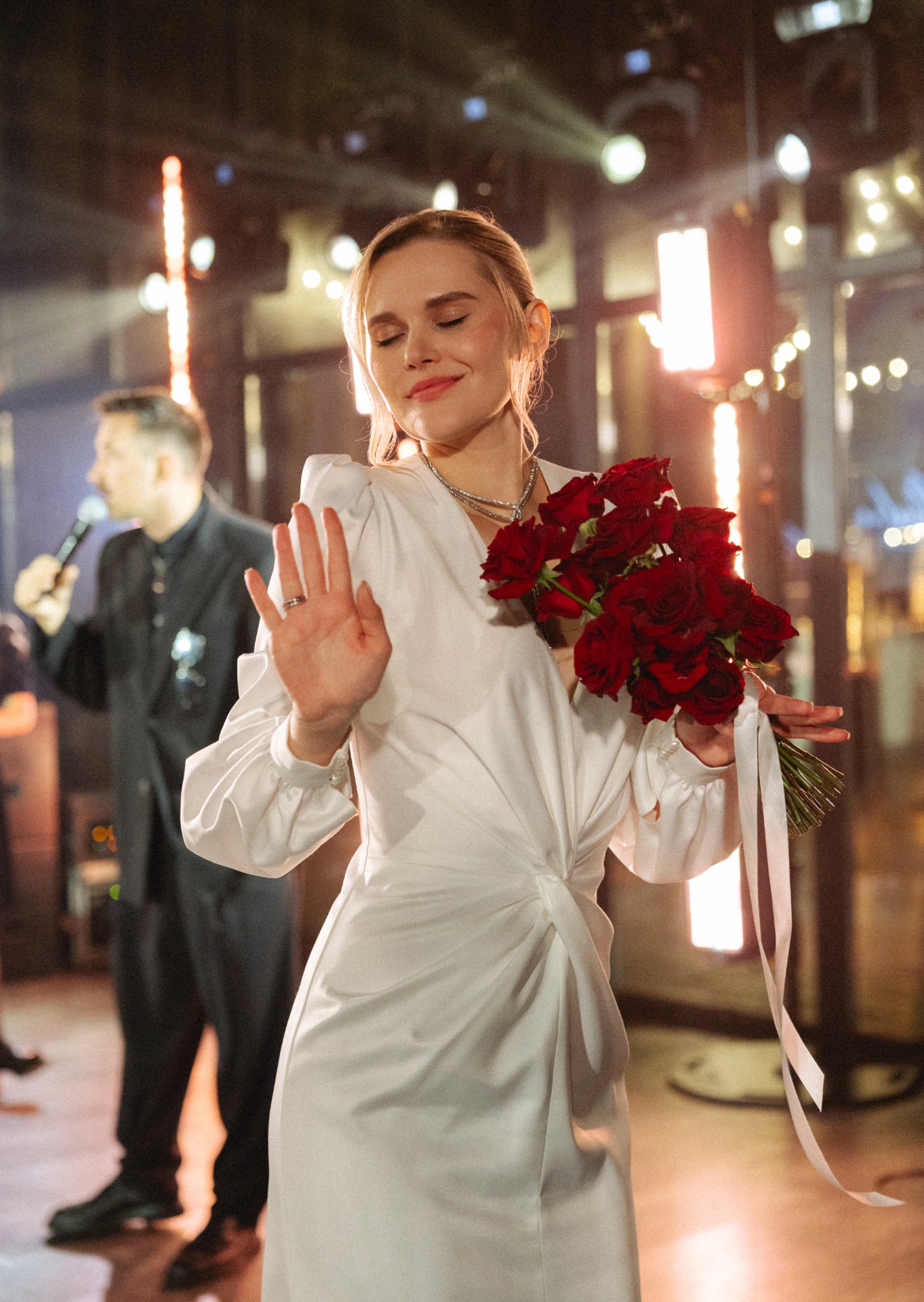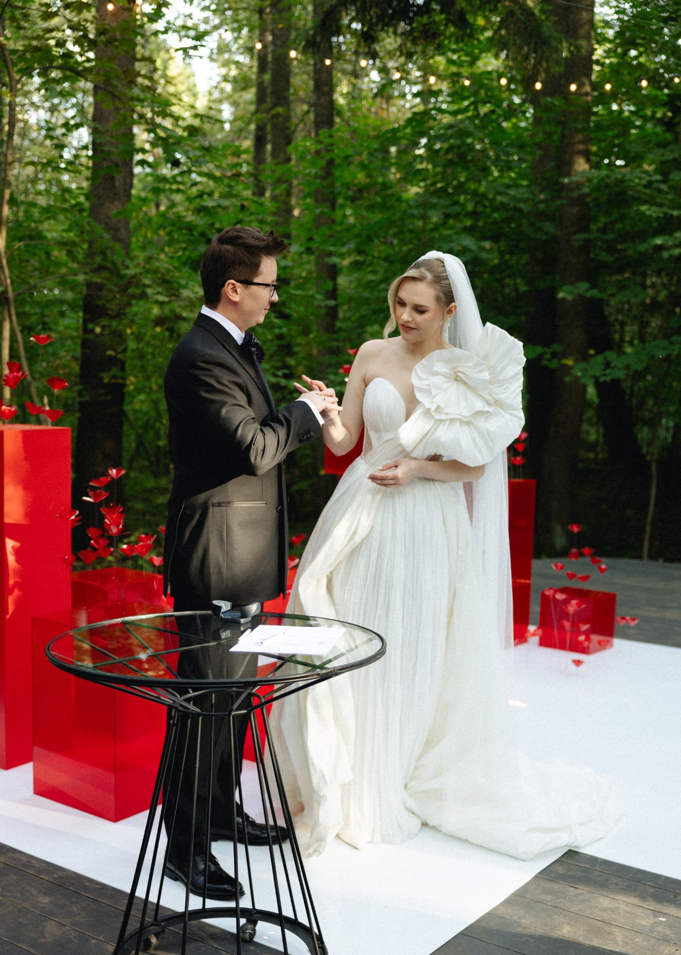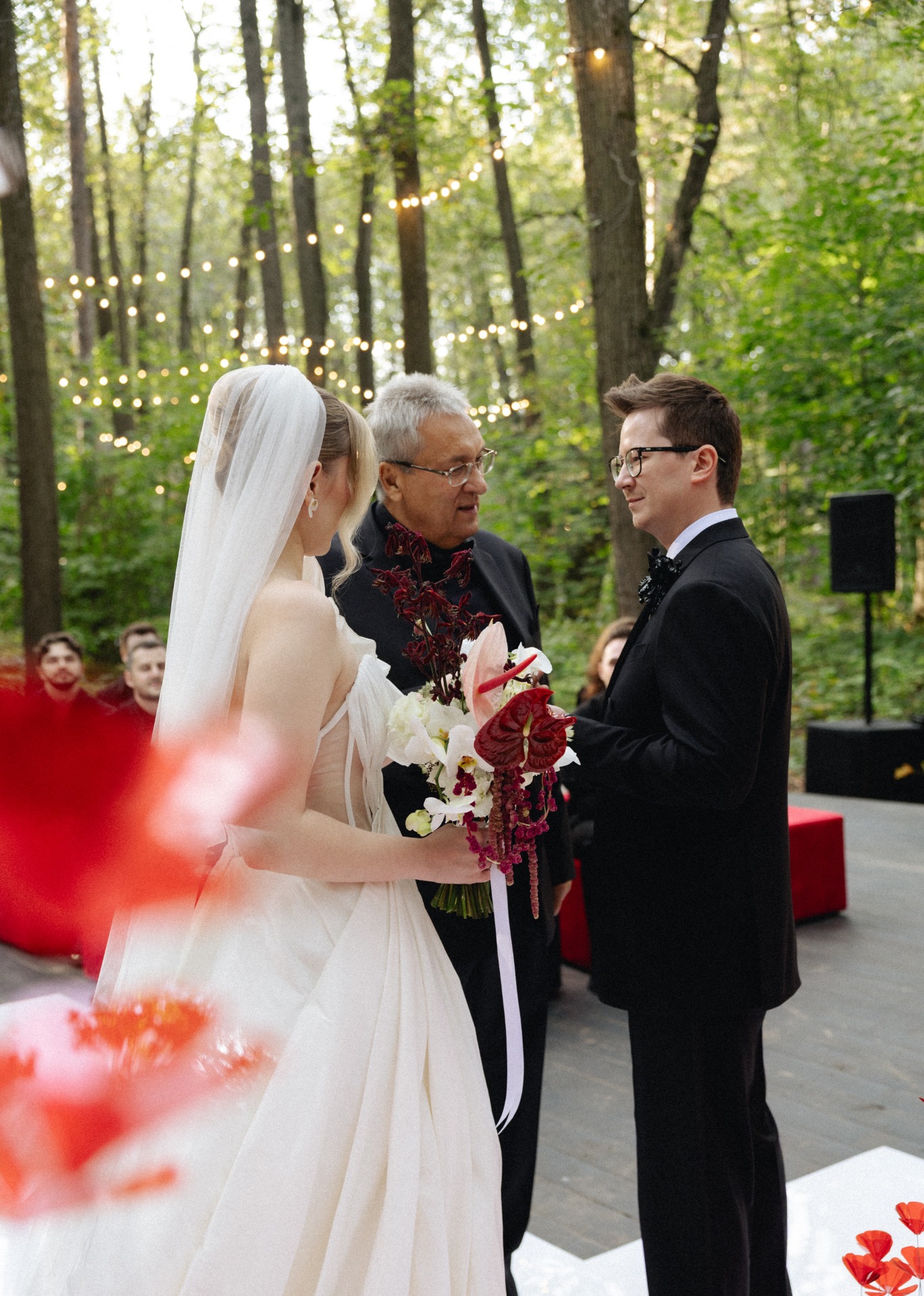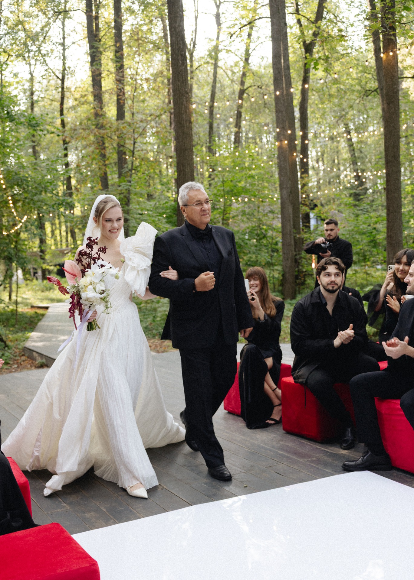 Самым важным моментом для меня стал выход к алтарю с папой. Мы хотели, чтобы всё было по-настоящему, поэтому выбрали официальную регистрацию прямо на площадке. Мне было важно, чтобы этот момент получился трогательным. Пока мы с папой шли к алтарю, звучала музыка, поверх которой были наложены мои заранее записанные слова благодарности — о том, как я счастлива идти рядом с ним к своему будущему. Гости не смогли сдержать эмоций, и даже мужчины растрогались — тут как раз пригодились платочки для слёз счастья.