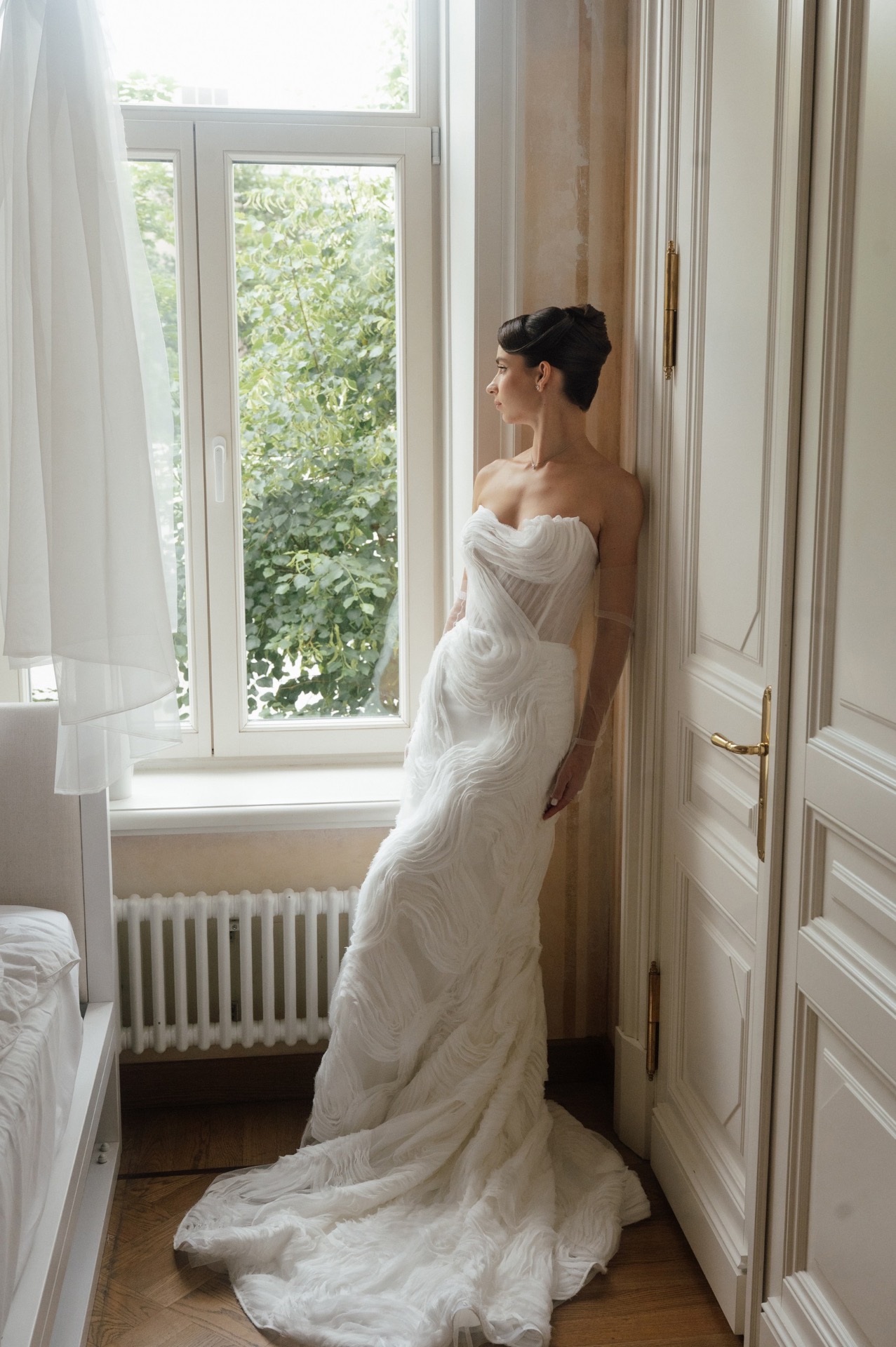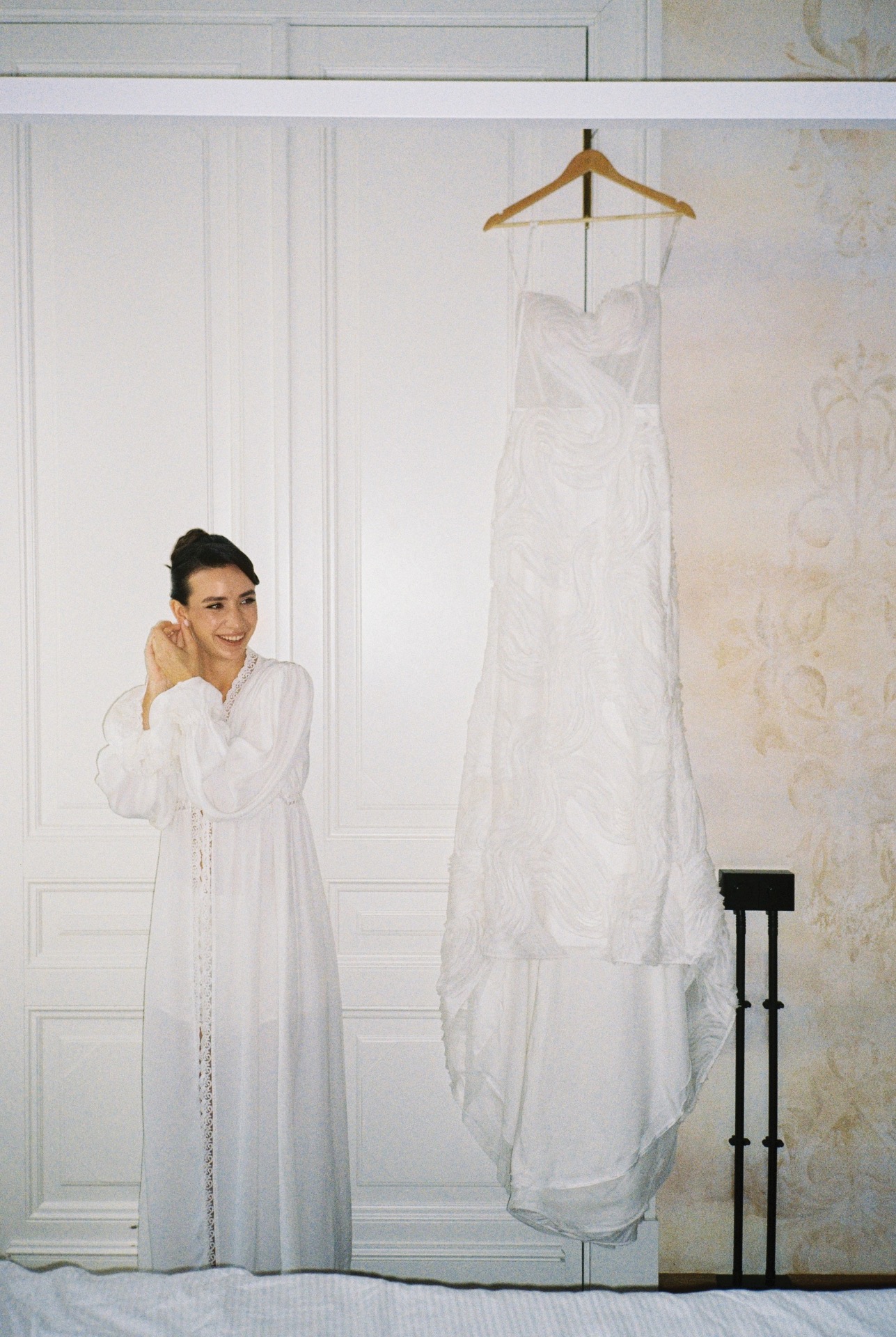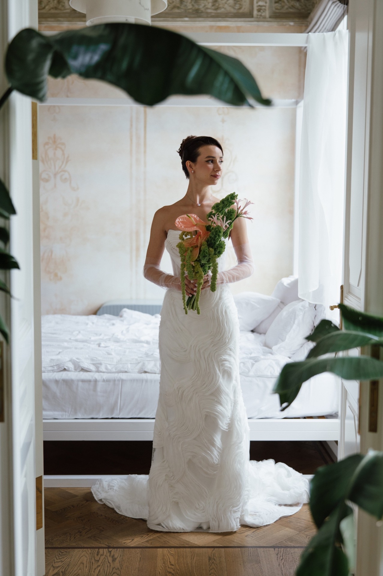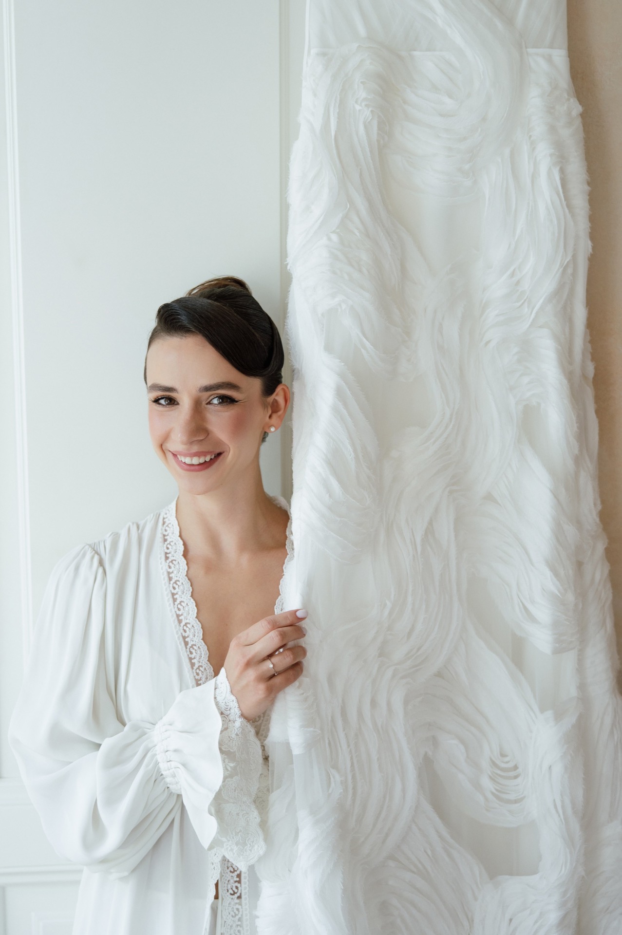 Платье я нашла неожиданно быстро. То самое появилось случайно в рекламном блоке Яндекса. Лёгкое, интересное, именно такое, каким я его представляла. Прическа, которую предложила стилист, идеально перекликалась с рисунком на платье, поэтому образ получился цельным и очень гармоничным. С аксессуарами я долго не могла определиться, но в итоге выбрала серьги — первый подарок от жениха. Это стало очень символичным акцентом.