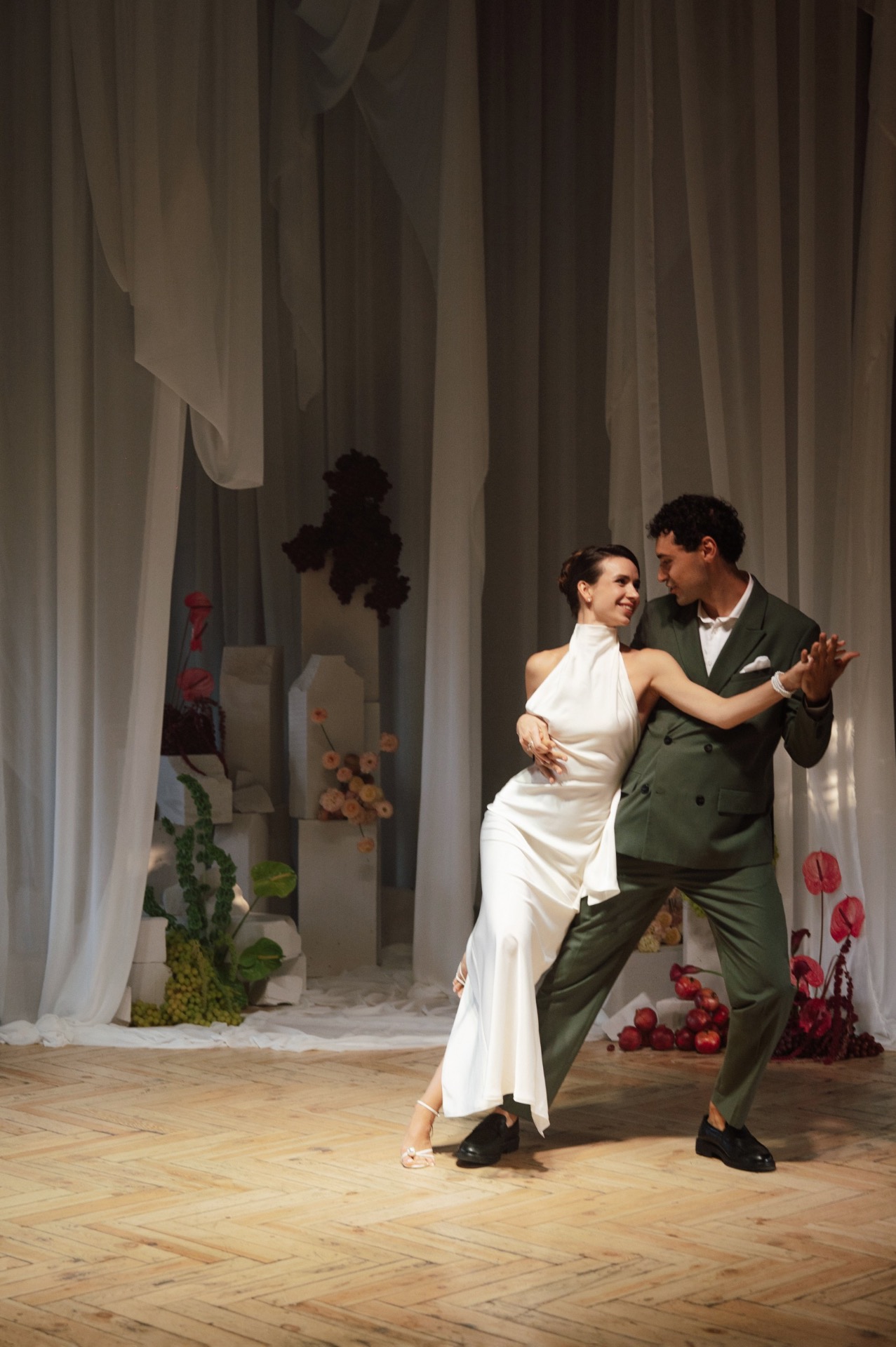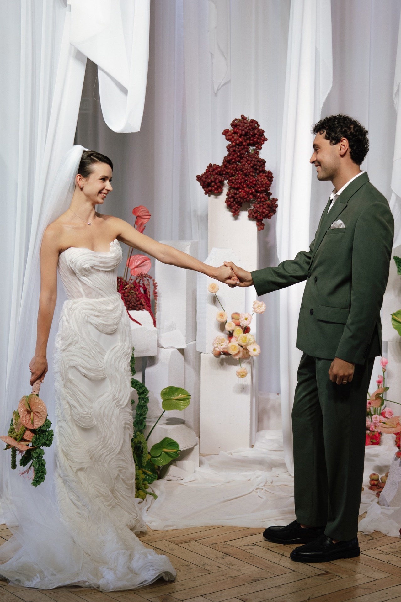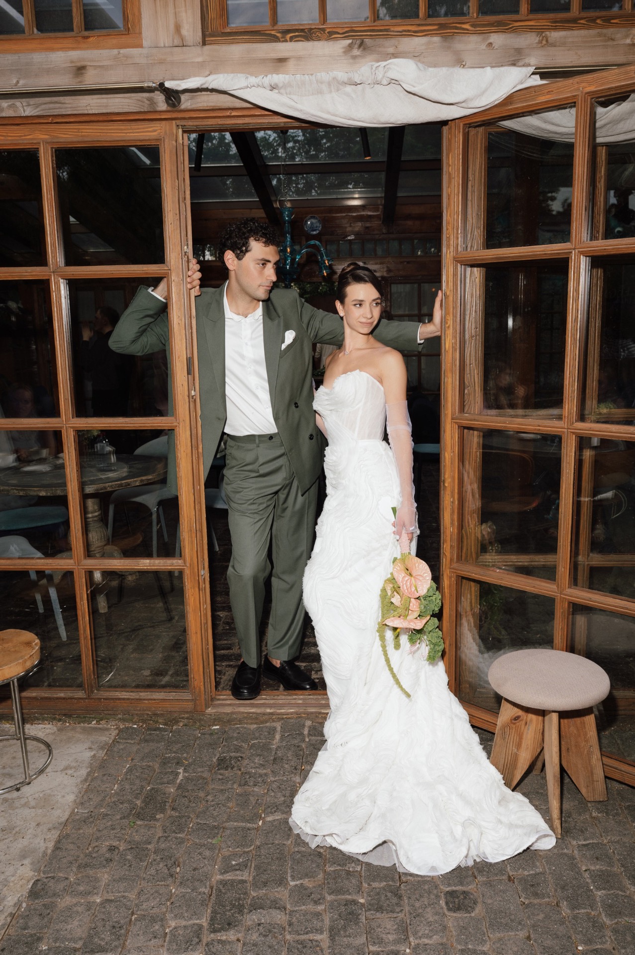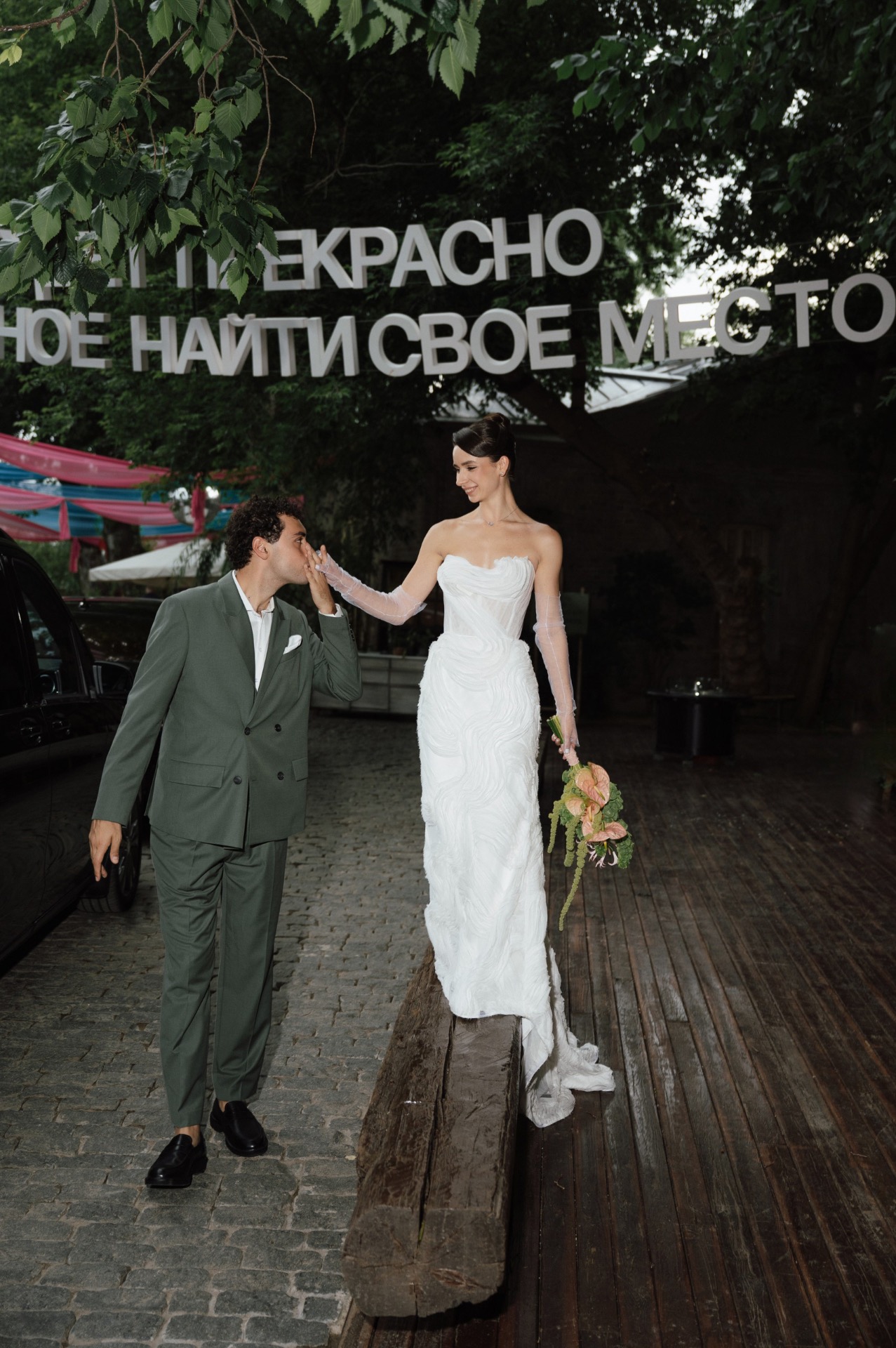 С костюмом жениха история сложилась похожим образом. Мы наткнулись на него случайно, решили примерить и сразу почувствовали: он наш. Он был зелёного цвета — свежий, стильный, идеально вписывающийся в цветовую палитру свадьбы.