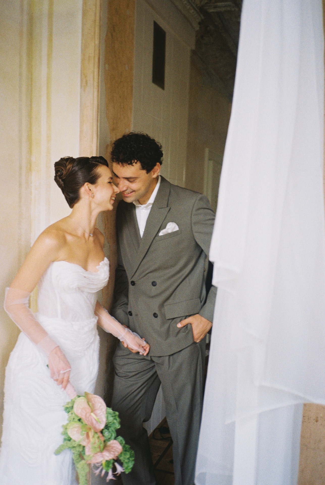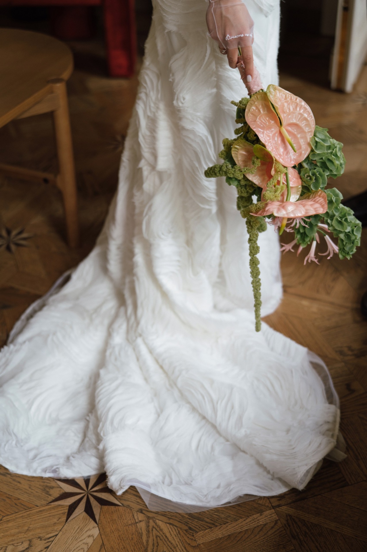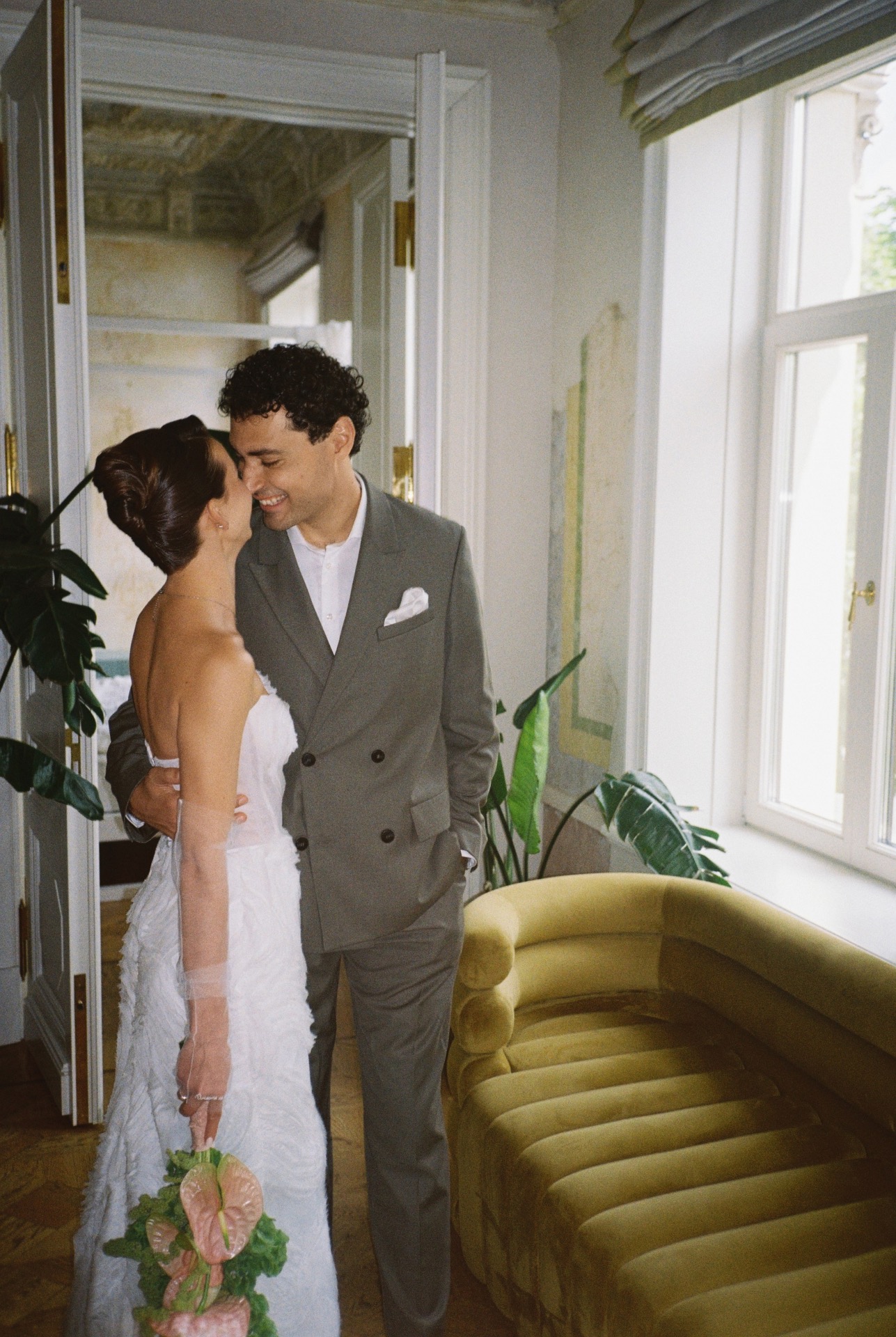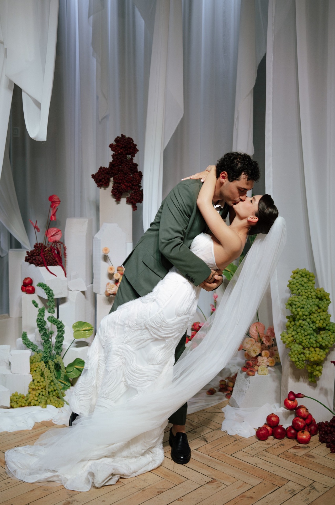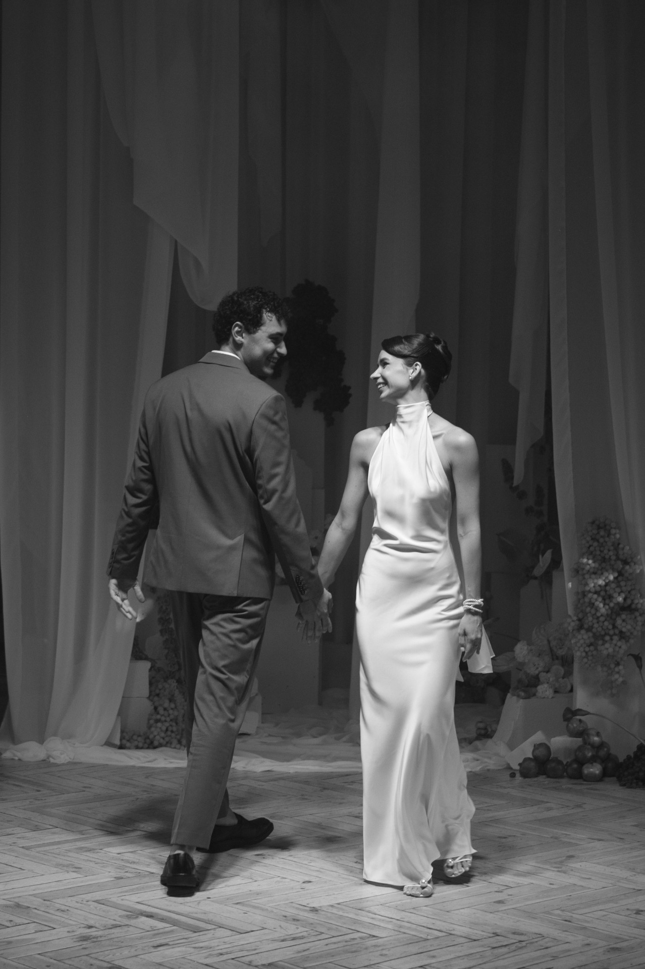С костюмом жениха история сложилась похожим образом. Мы наткнулись на него случайно, решили примерить и сразу почувствовали: он наш. Он был зелёного цвета — свежий, стильный, идеально вписывающийся в цветовую палитру свадьбы.