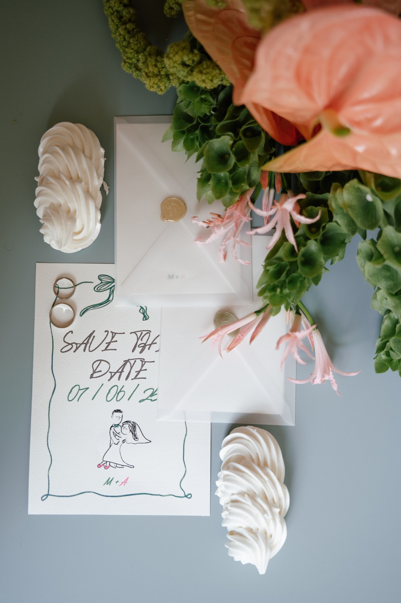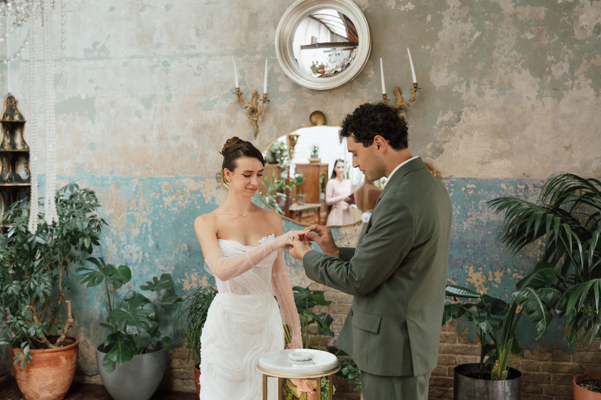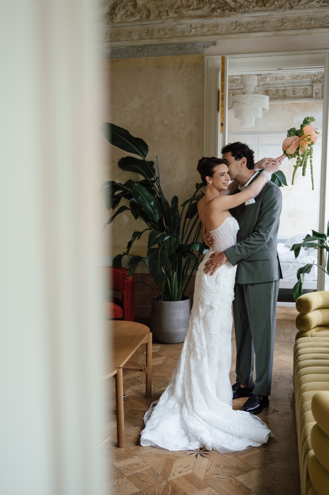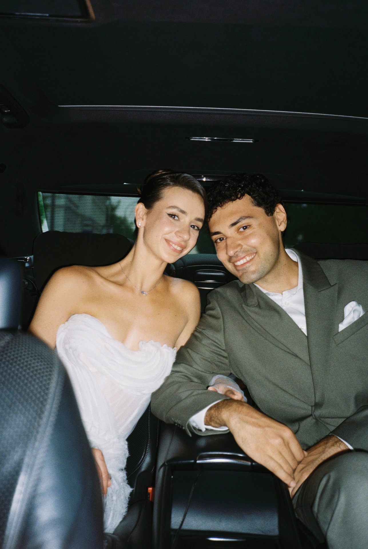 С костюмом жениха история сложилась похожим образом. Мы наткнулись на него случайно, решили примерить и сразу почувствовали: он наш. Он был зелёного цвета — свежий, стильный, идеально вписывающийся в цветовую палитру свадьбы.