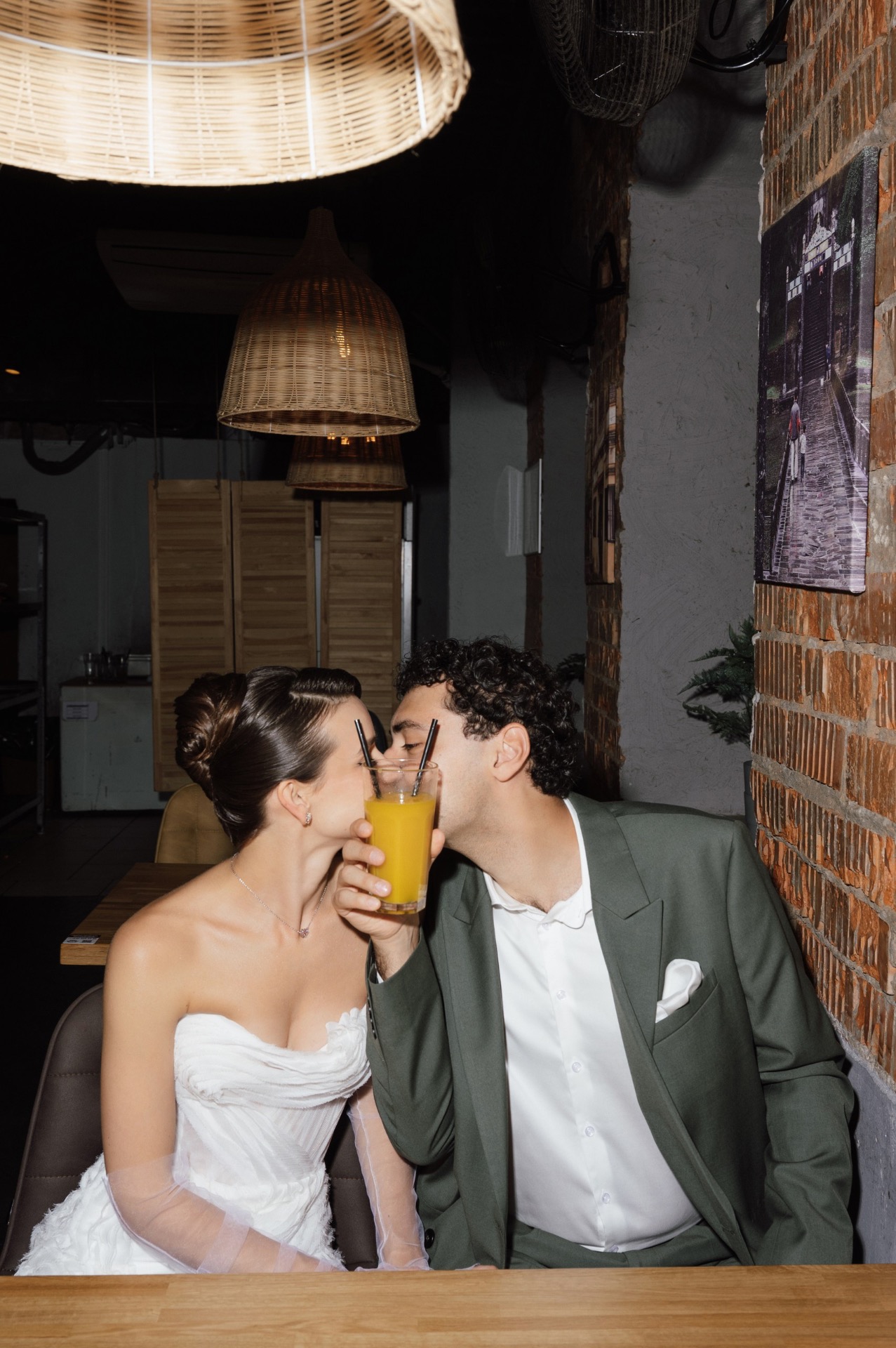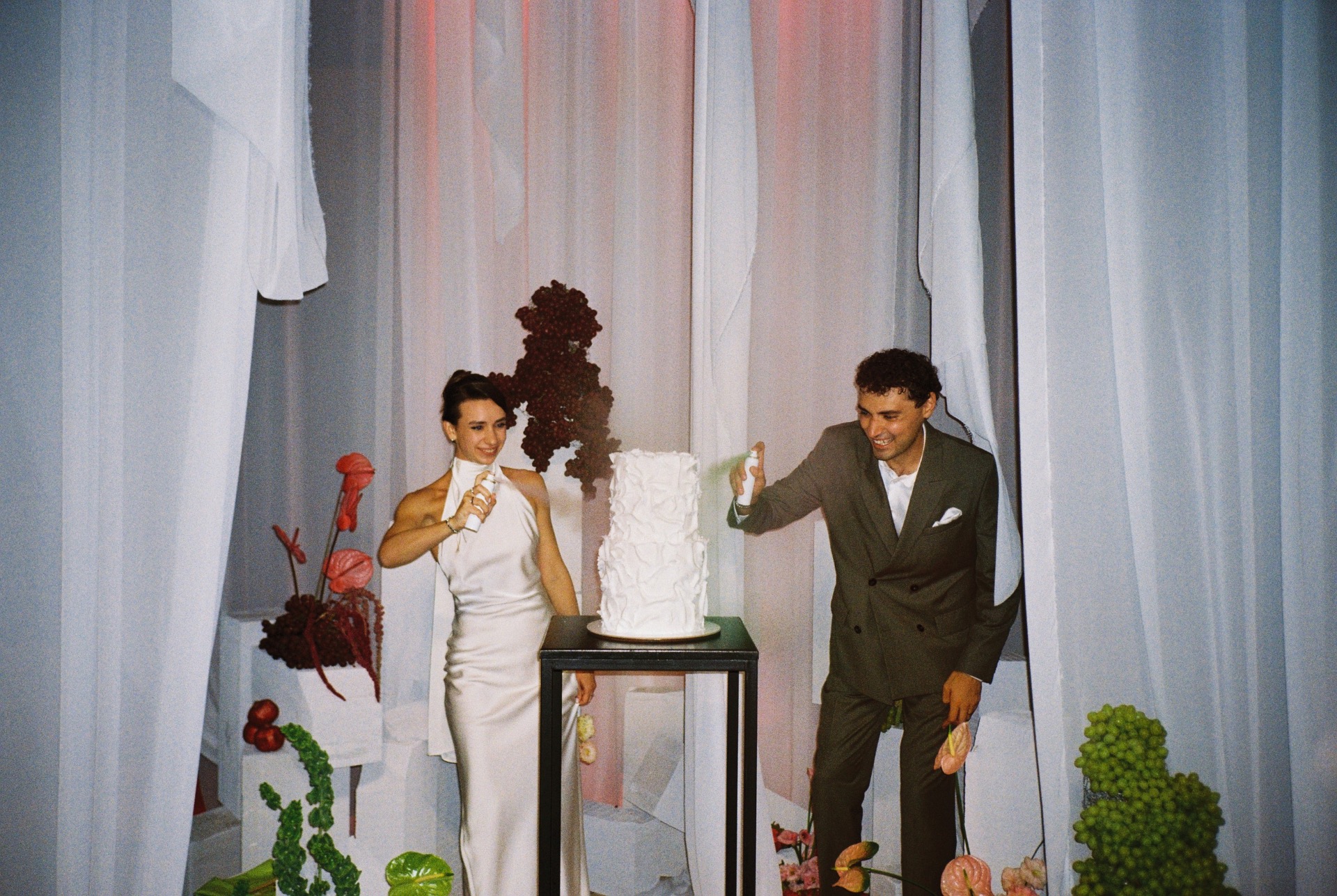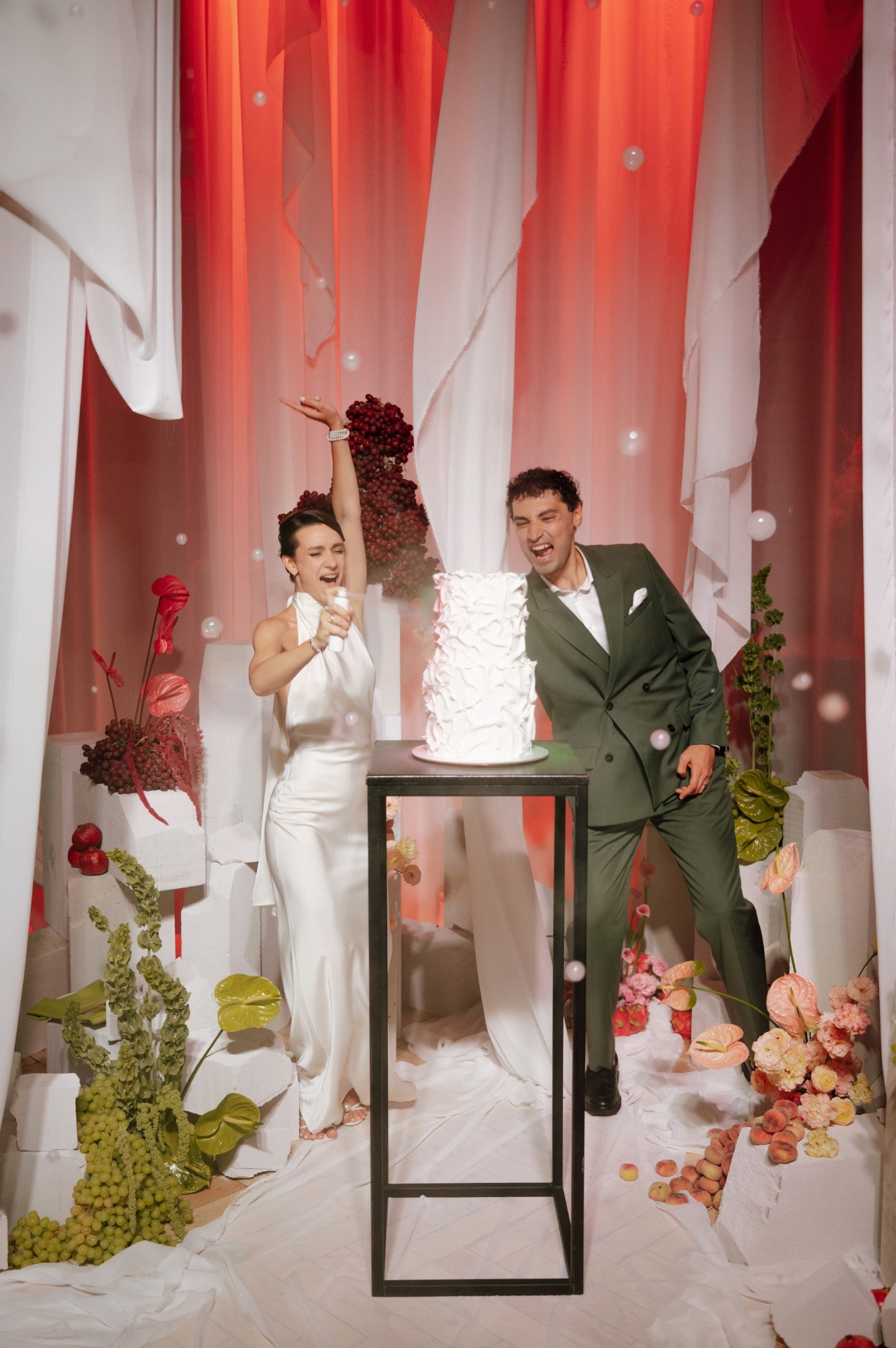 Финалом вечера стал яркий перфоманс с тортом: он был белого цвета, и мы раскрасили его баллончиками с краской в цветах свадьбы, а вокруг кружились мыльные пузыри. Это стало яркой, красочной точкой в нашем дне — живом, стильном и незабываемом.
