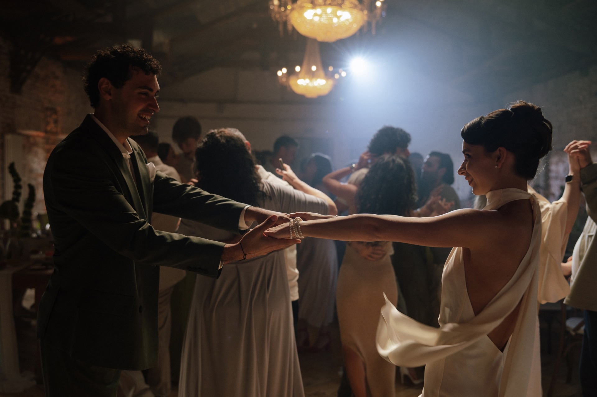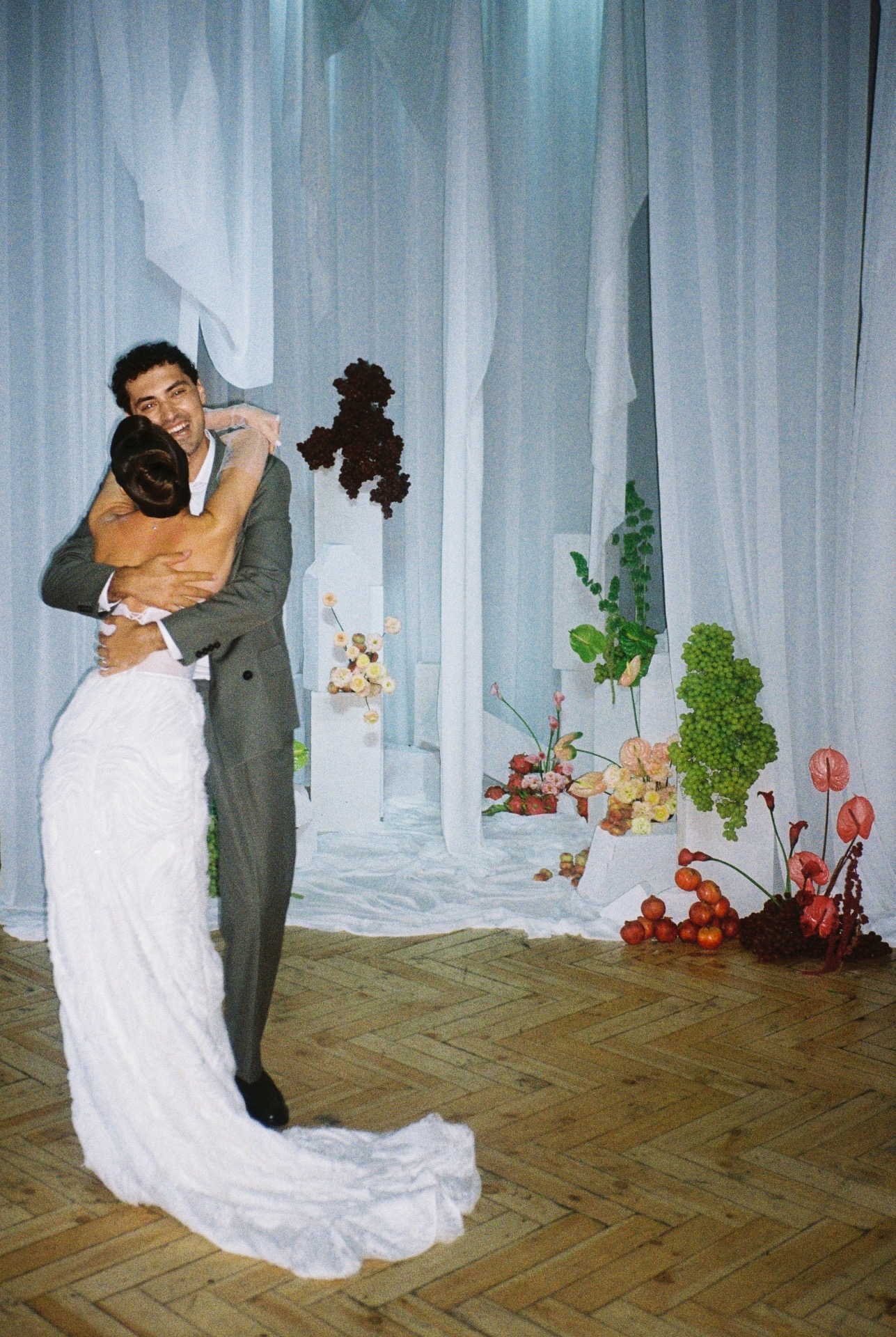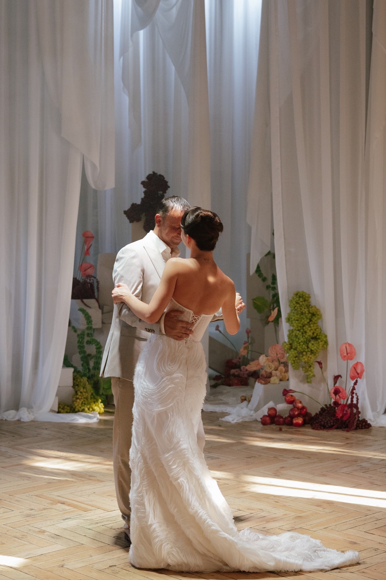Финалом вечера стал яркий перфоманс с тортом: он был белого цвета, и мы раскрасили его баллончиками с краской в цветах свадьбы, а вокруг кружились мыльные пузыри. Это стало яркой, красочной точкой в нашем дне — живом, стильном и незабываемом.