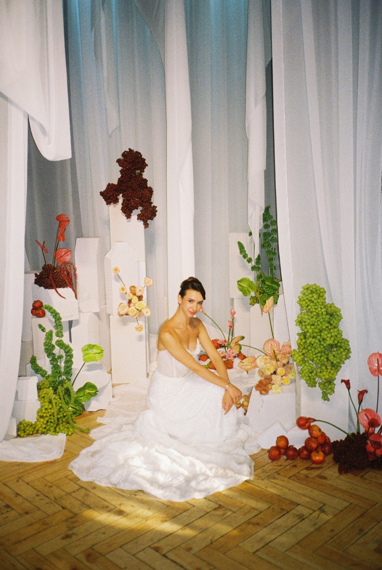 Мы знали, что хотим яркие и акцентные детали в декоре. Наш декоратор Маша предложила использовать строительные блоки, идея нас сразу вдохновила, ведь мы оба строители. На церемонии блоки стали частью центральной композиции, а на столах лежали их миниатюрные версии. Маша также придумала сделать из них вазы: цветы вставлялись прямо в отверстия, создавая ощущение, будто они растут из блоков. Композиции дополняли фрукты и цветы, подобранные по цвету — получилось ярко, живо, стильно и про нас.