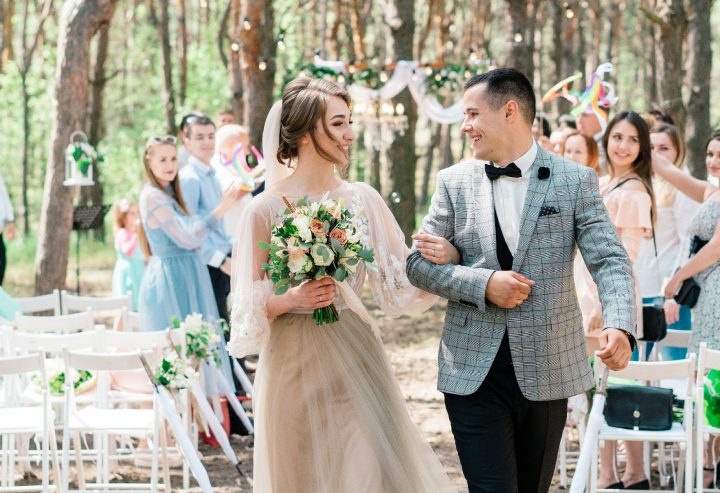 Полина: Я еще задолго до свадьбы знала, как должна выглядеть моя выездная церемония. Мне хотелось, чтобы все проходило в лесу, на свежем воздухе, в бежевых, золотистых и коричневых тонах. Чтобы там было еще и несколько фотозон, специальная площадка с качелями для деток, свадебная арка, декорированная цветами и зеленью, а на столах стояли свечи и живые цветы.