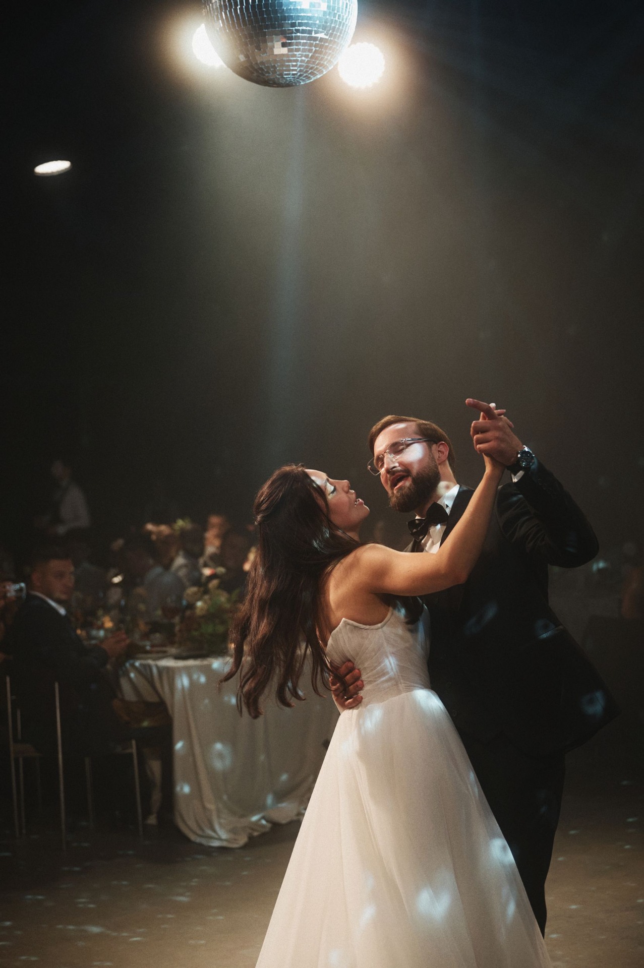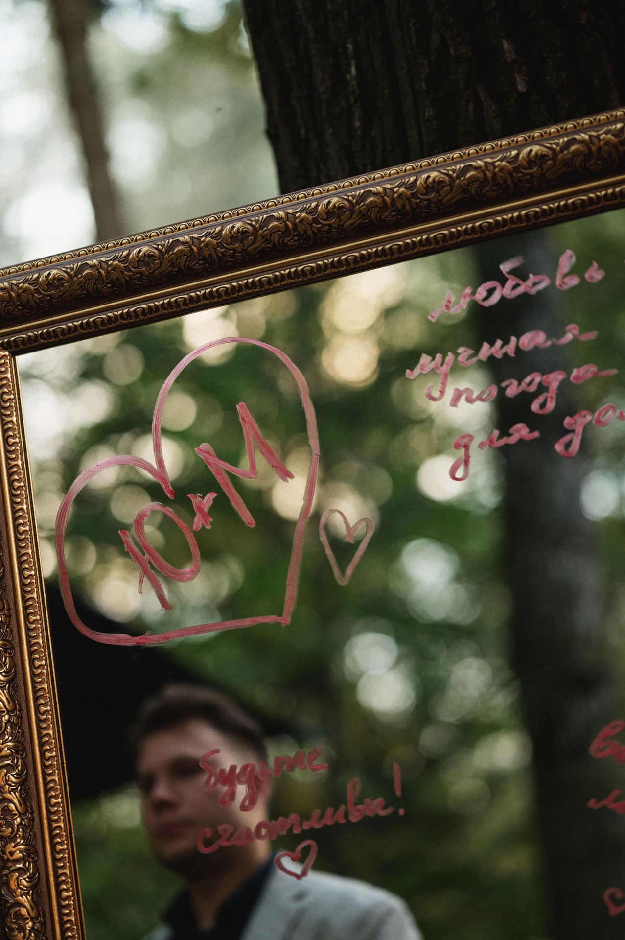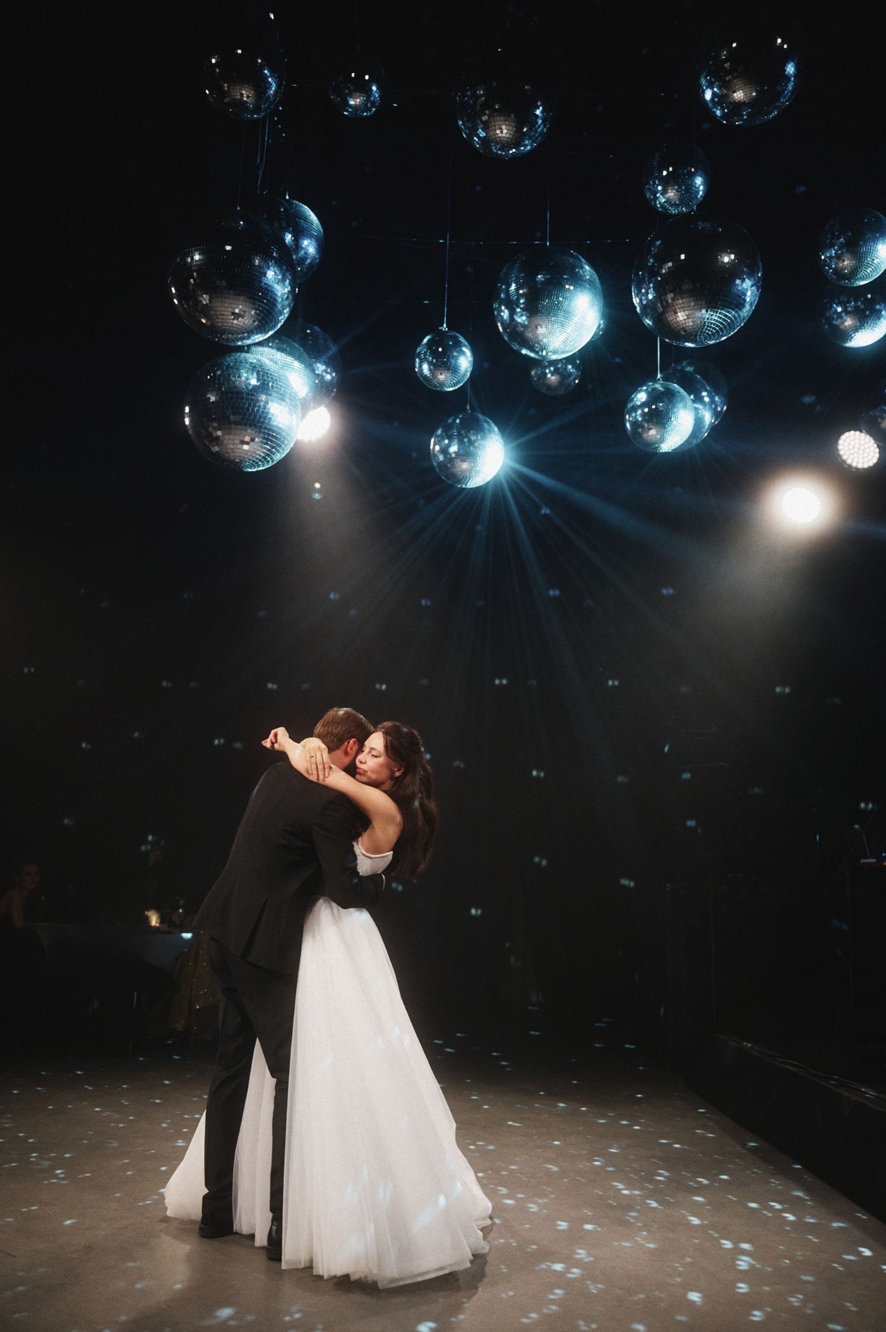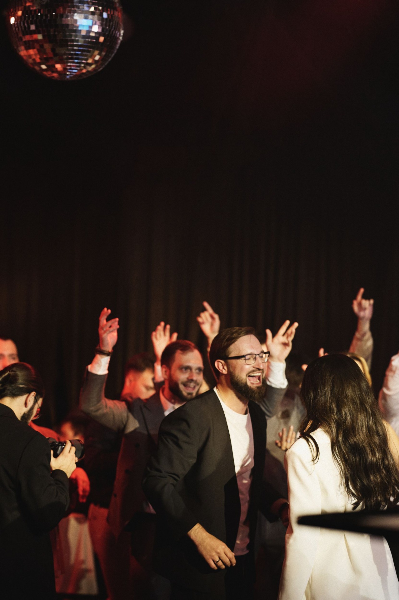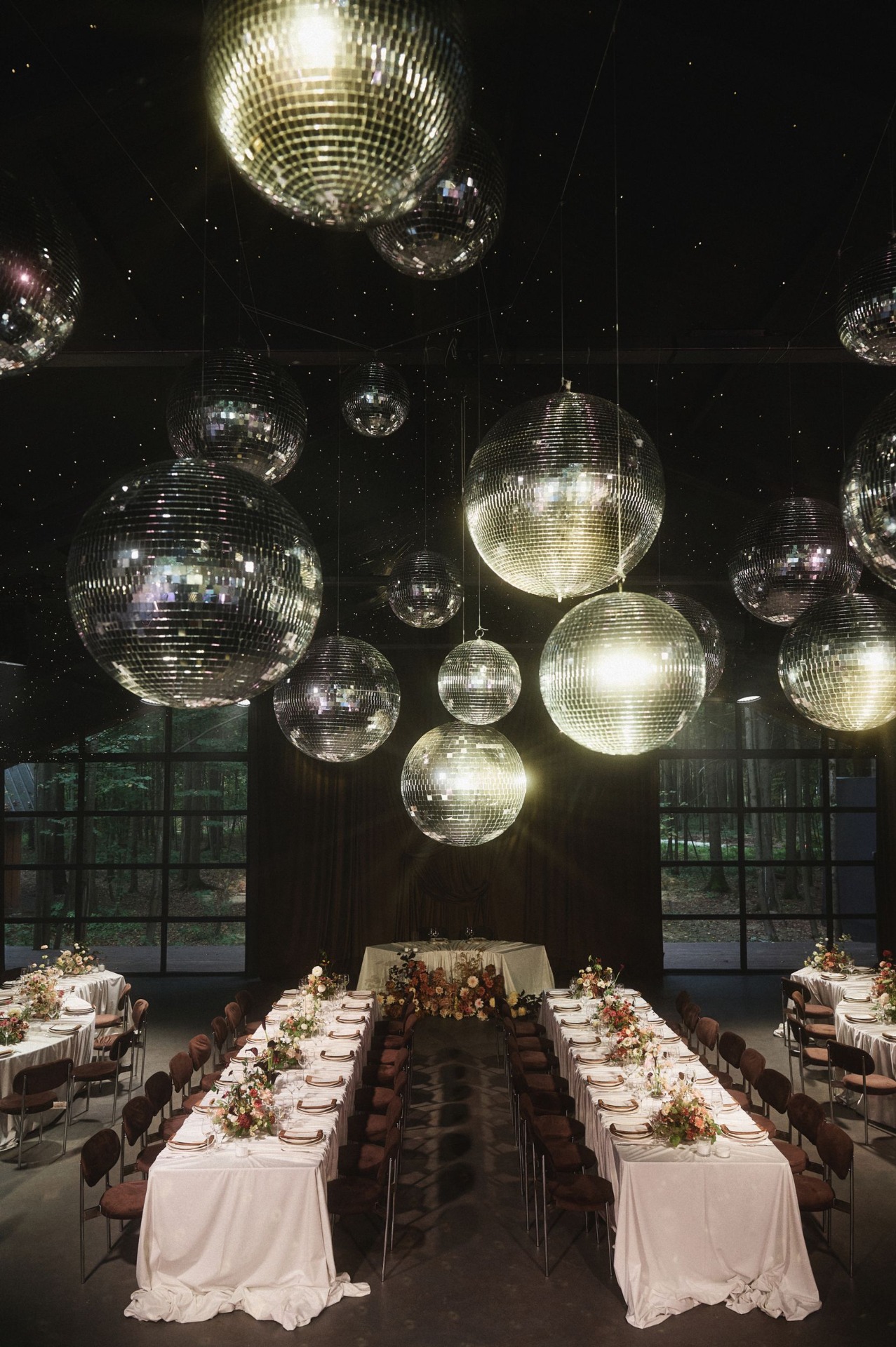Нам хотелось, чтобы всё было нежно, но при этом отражало наш характер. Гостей встречало большое зеркало, на котором можно было писать красной помадой, а над сценой расположился большой арт-объект из разноразмерных дискошаров, который в течение вечера благодаря работе со светом преображал пространство.