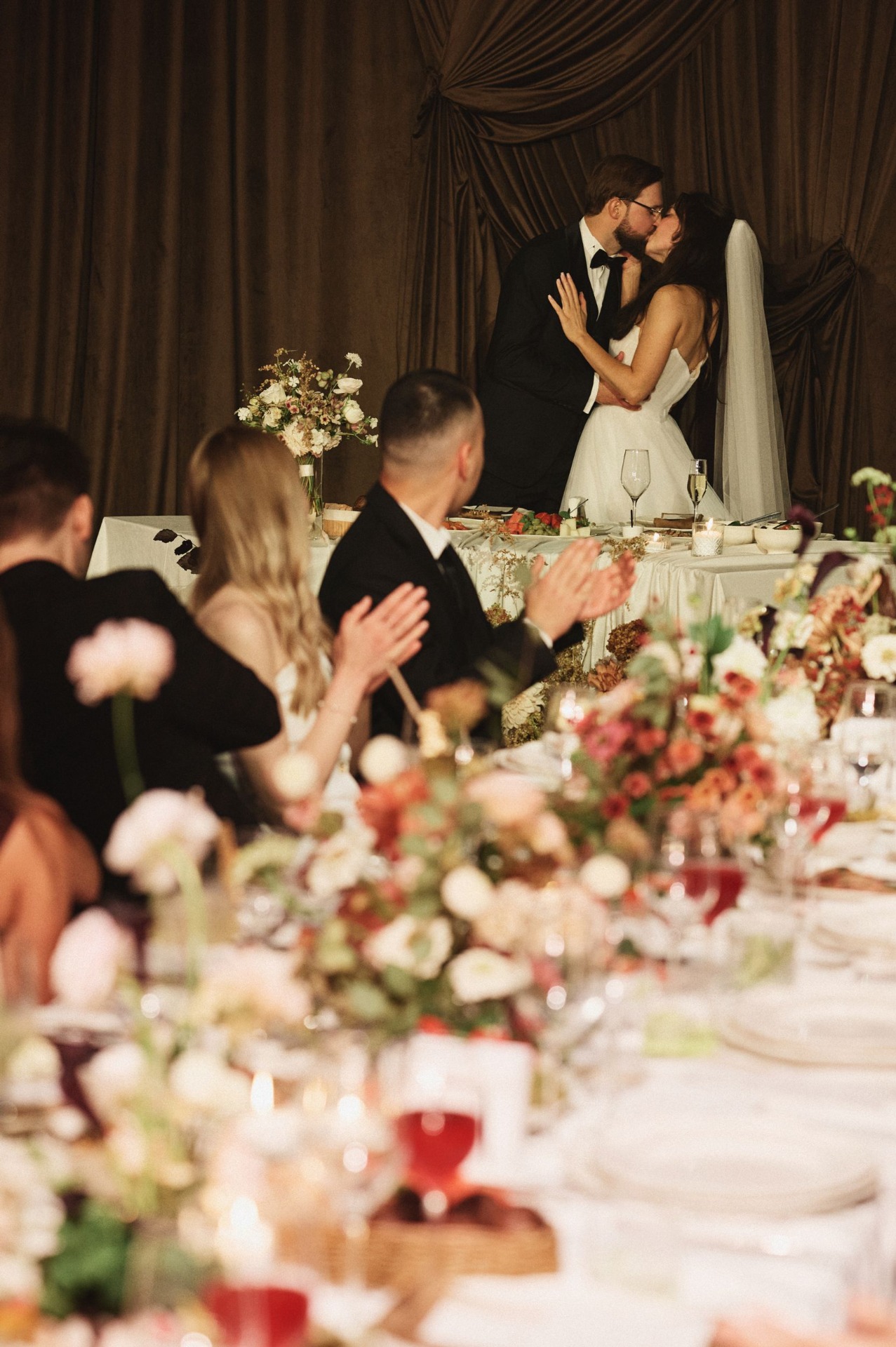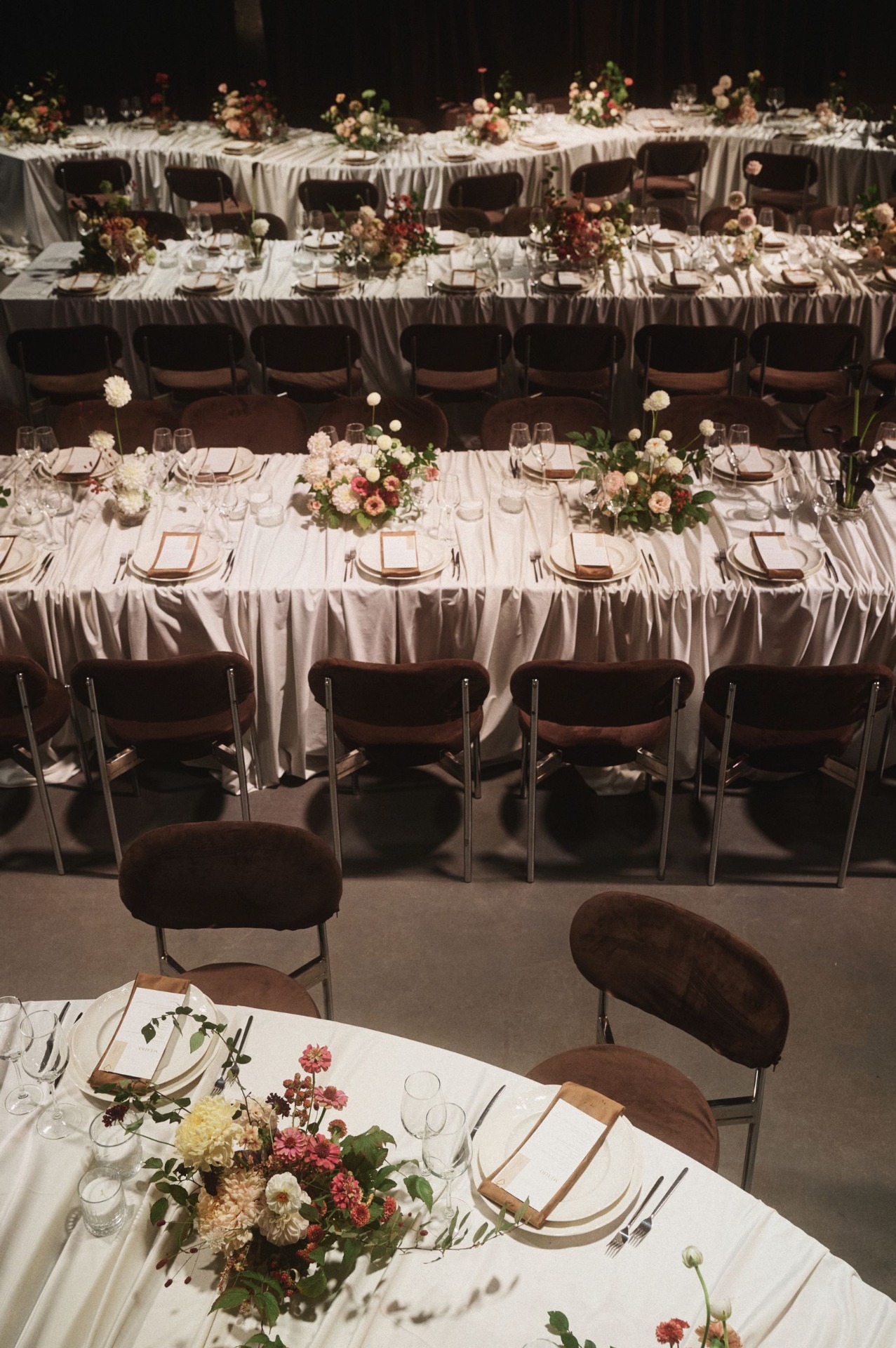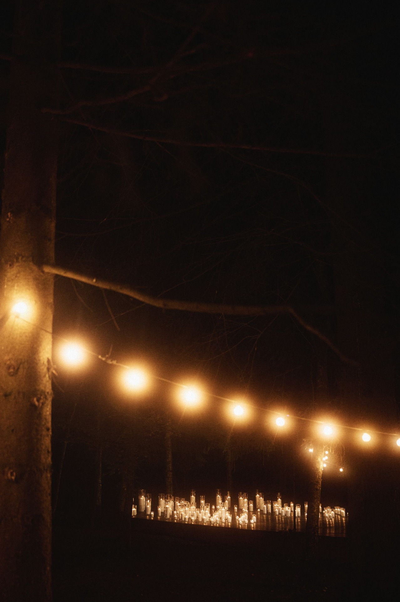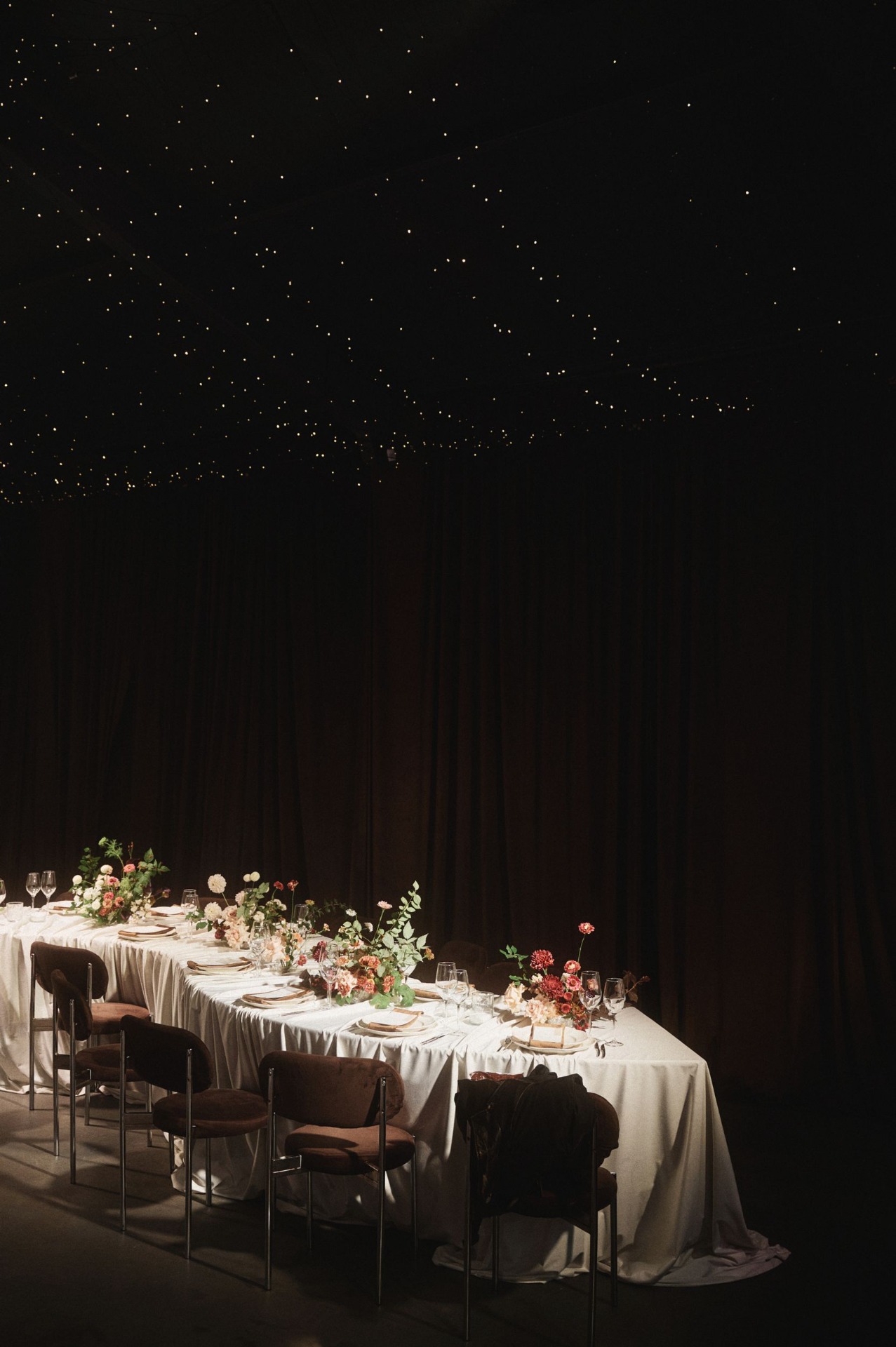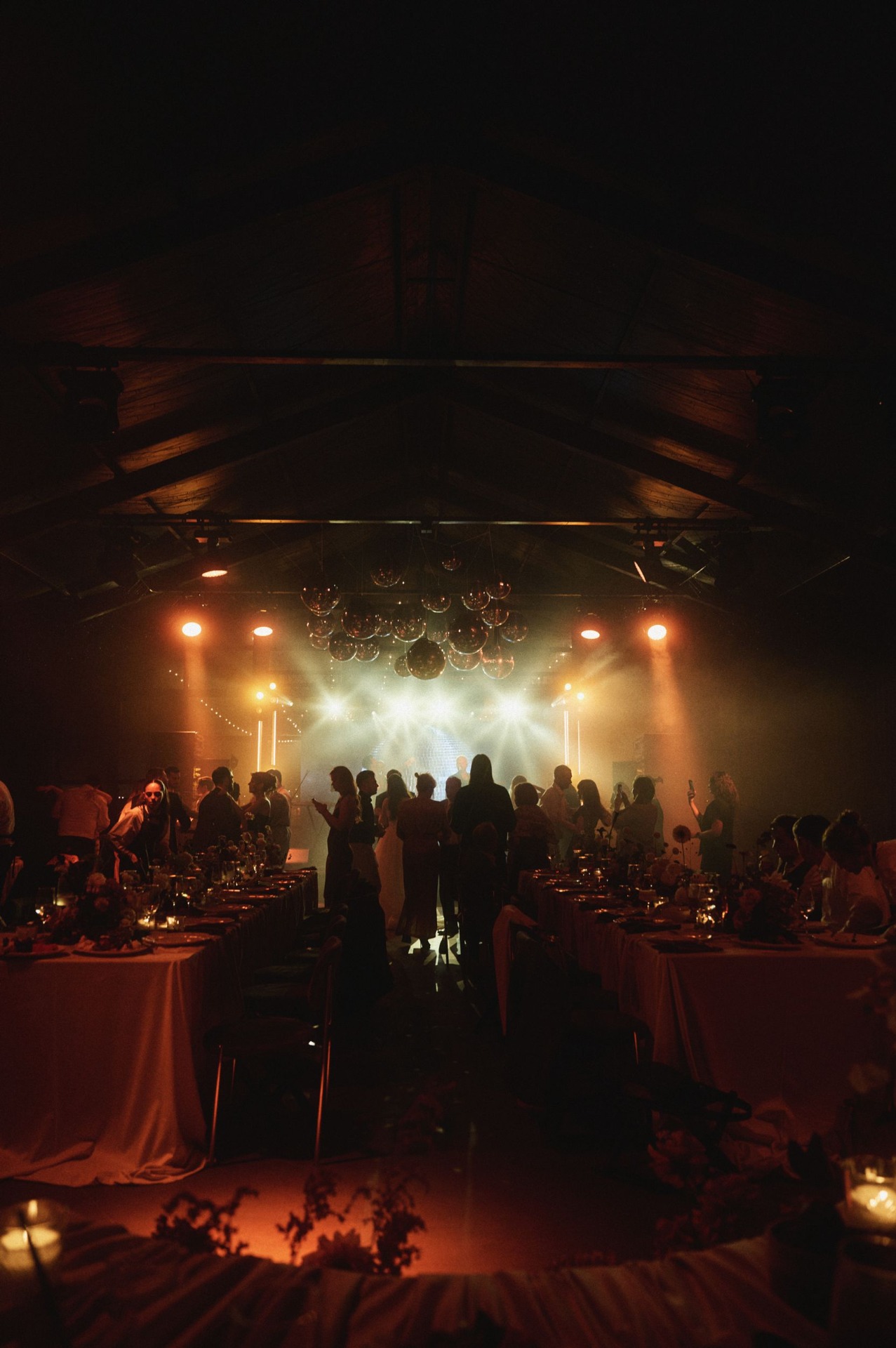 Нам хотелось, чтобы всё было нежно, но при этом отражало наш характер. Гостей встречало большое зеркало, на котором можно было писать красной помадой, а над сценой расположился большой арт-объект из разноразмерных дискошаров, который в течение вечера благодаря работе со светом преображал пространство.
