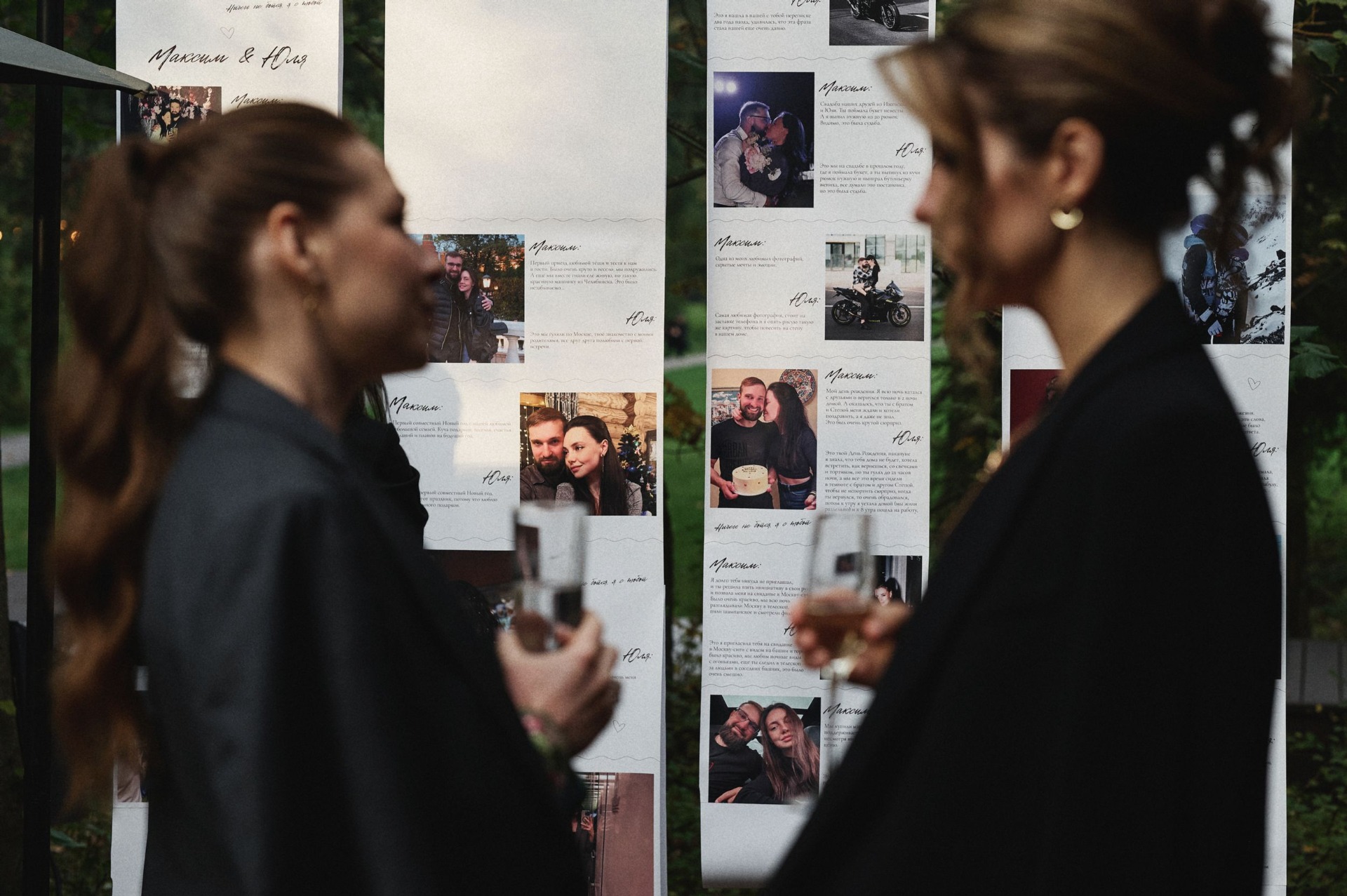За несколько месяцев до свадьбы мы провели фотосессию на нашем мотоцикле с нашей фото- и видеокомандой. Мы использовали этот контент в приглашениях и в течение вечера. Также на веранде мы разместили небольшую галерею с нашими фотографиями и хронологией событий в наших отношениях.