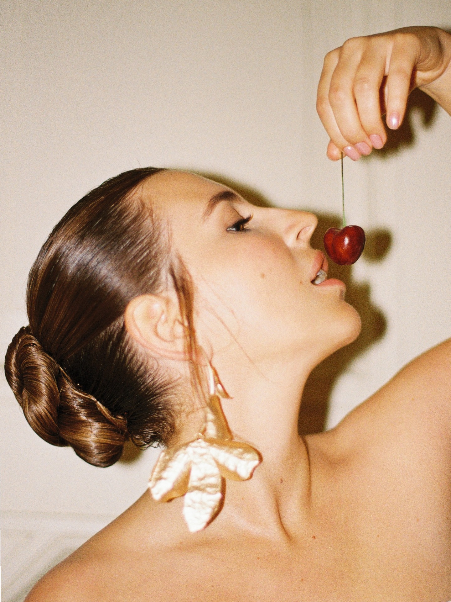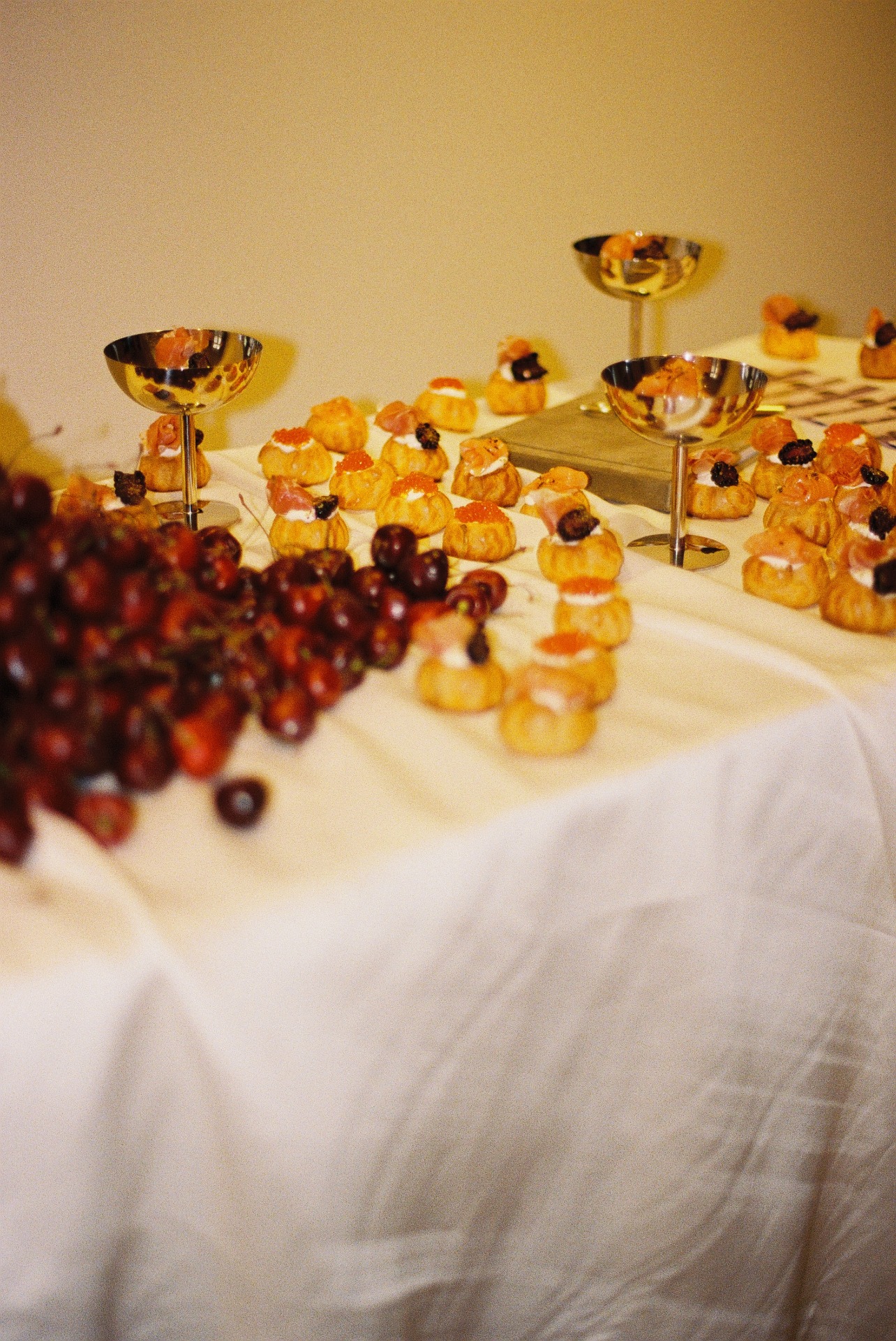 В прошлом гости по очереди открывали локации усадьбы, словно шкатулку. Сначала — эстетичная фуршетная зона с горой черешни и просекко. Далее — выставка о нас: не просто фотографии, а инсталляции с артефактами, билетами из кино и театра и главным экспонатом — тканевой экспликацией с нашей историей.
