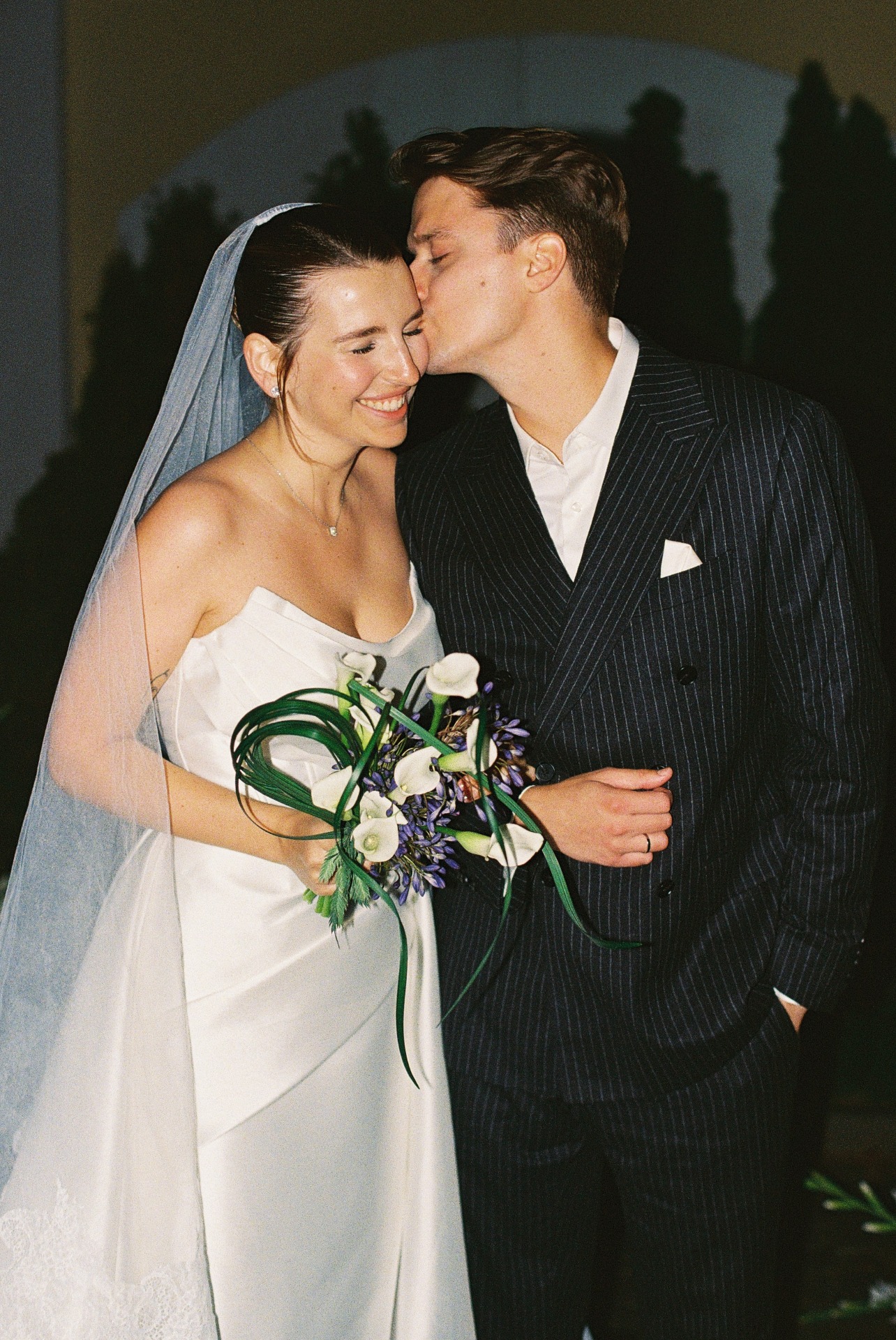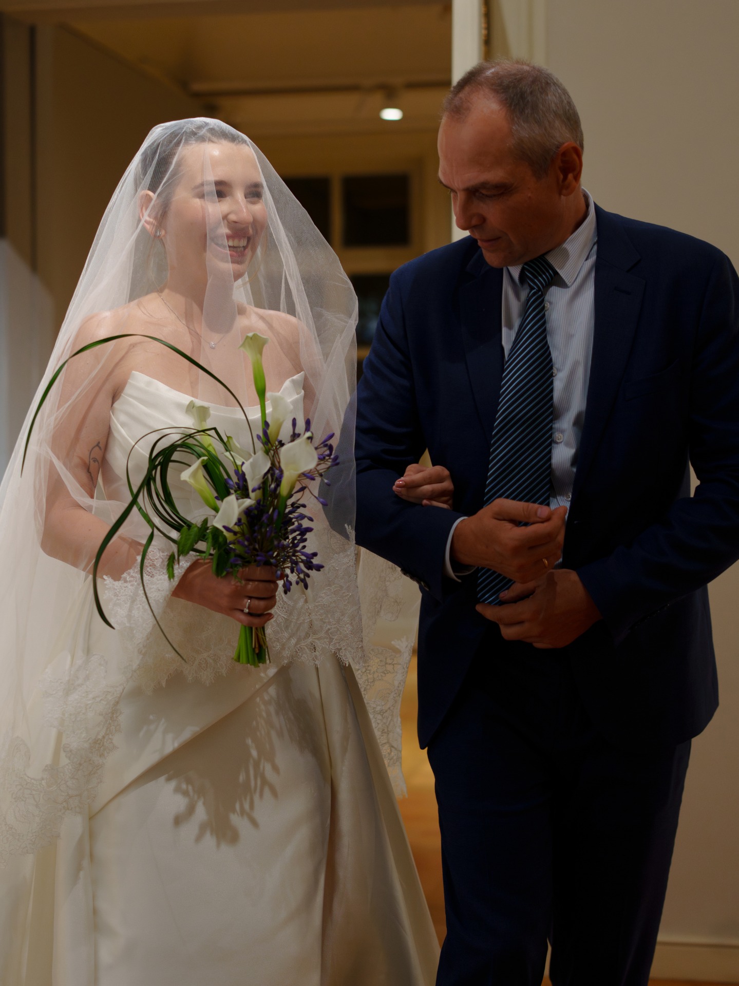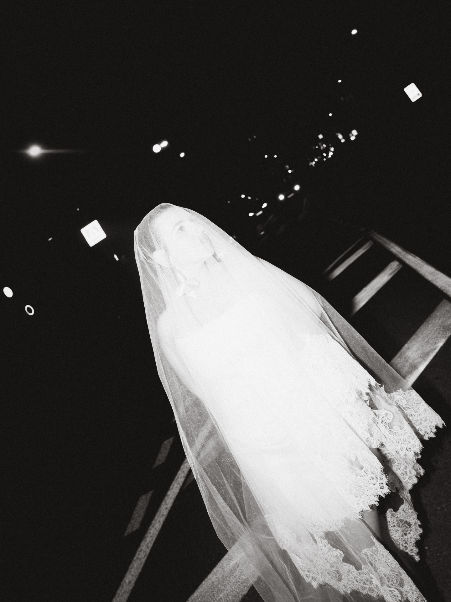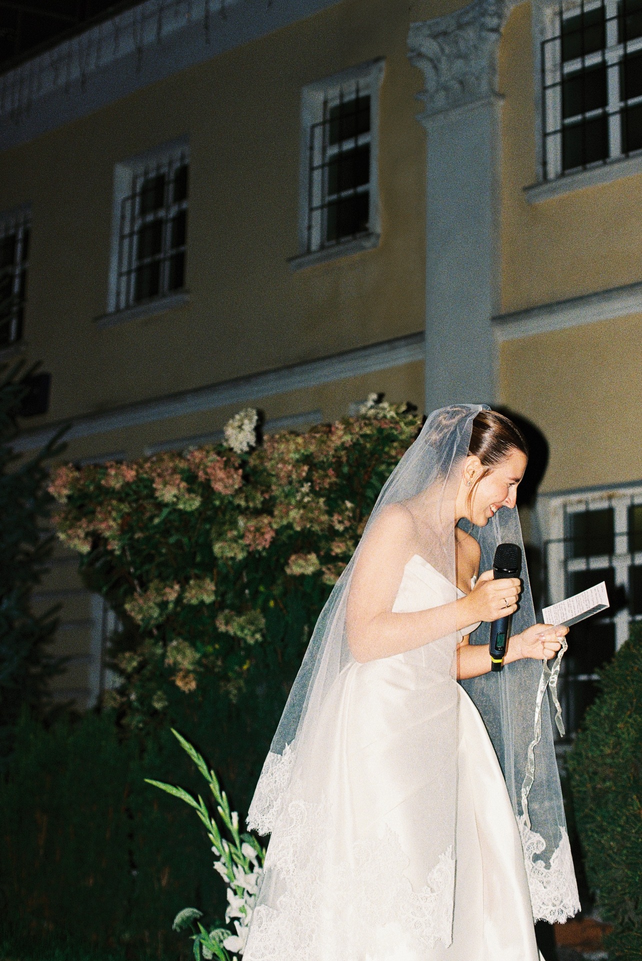 Вечером к образу добавилась фата с деликатным кружевом для церемонии, а позже я переоделась в короткое атласное платье.