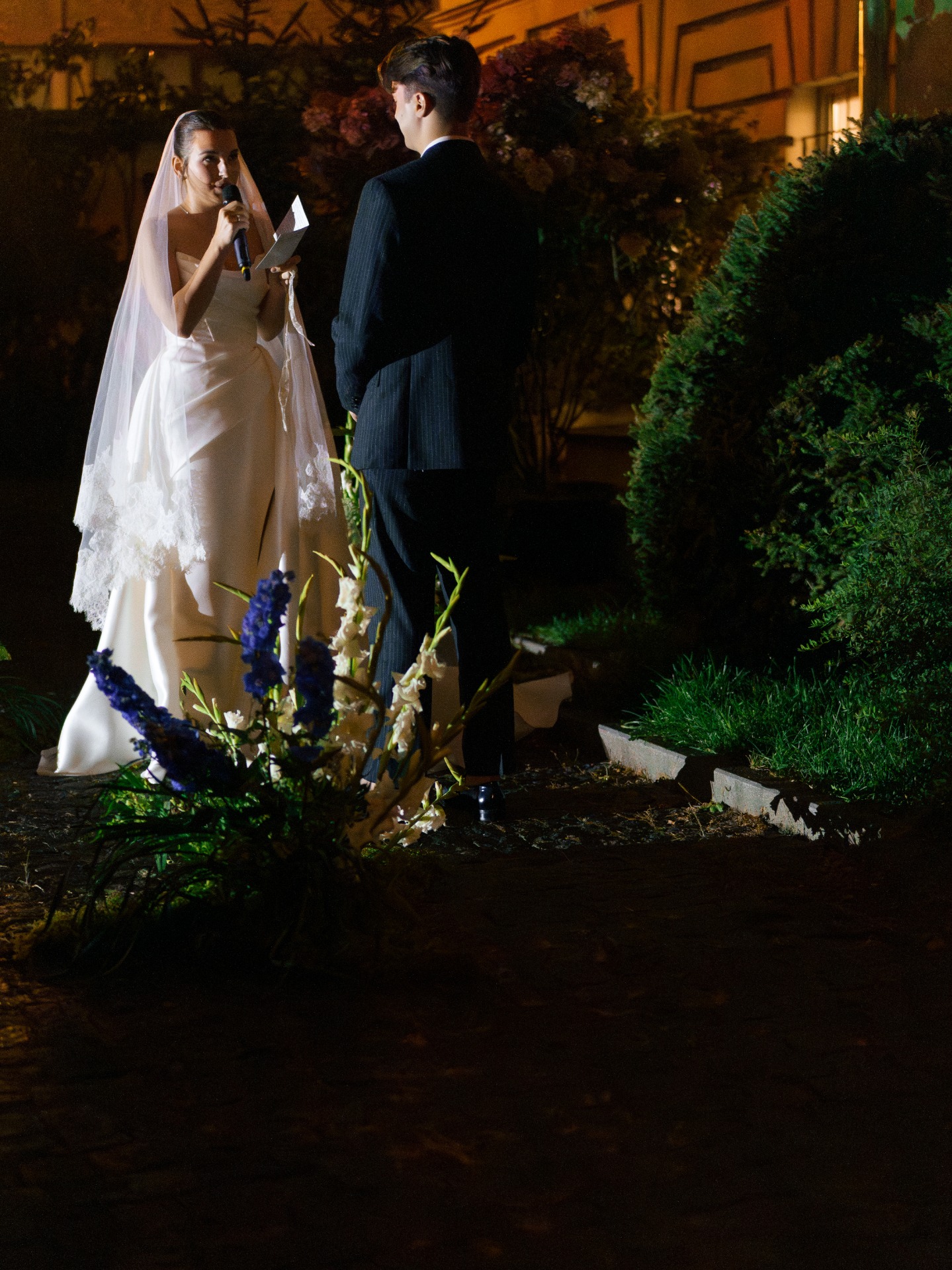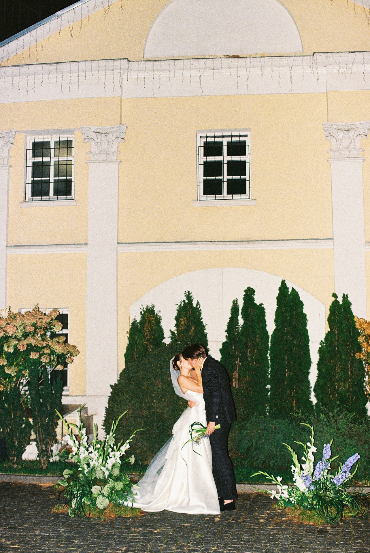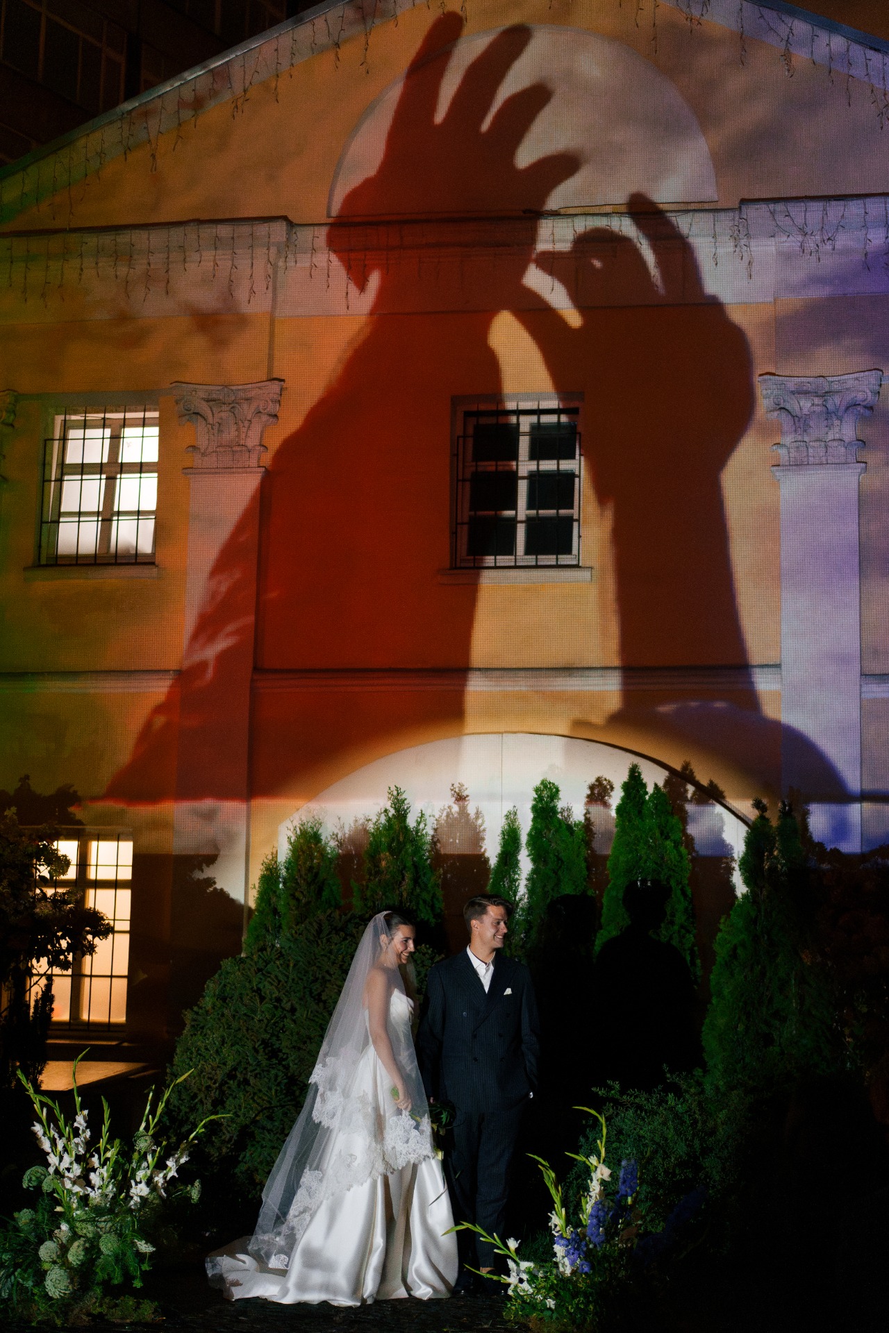 В будущем гостей ждал двор усадьбы, украшенный гирляндами. На фасаде шла проекция плёночного фильма о нас, а в центре стояла арка из света — наш алтарь. Мы с Даниилом вышли по очереди, обменялись клятвами, после чего на улицу вынесли торт.
