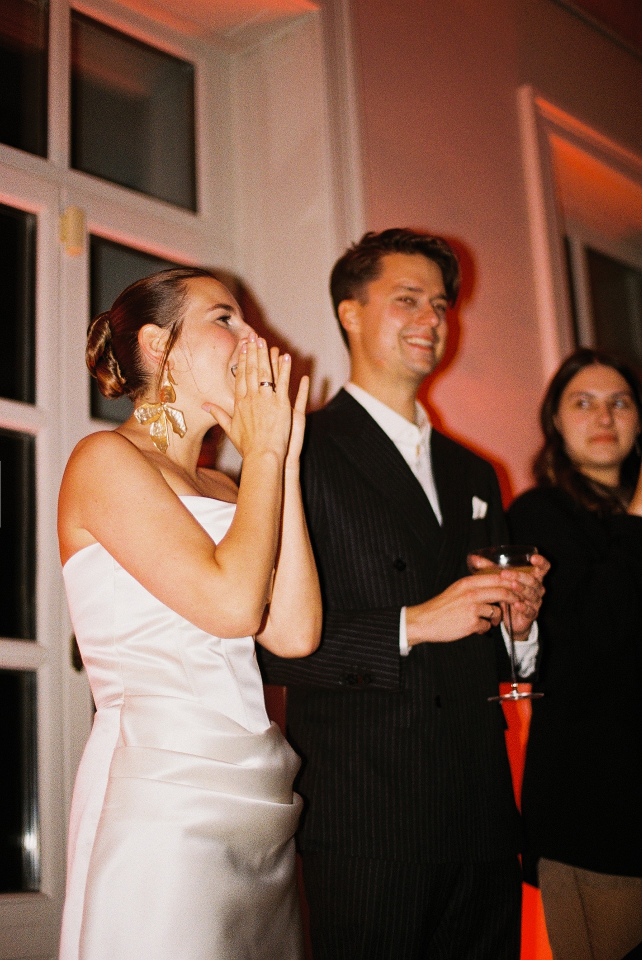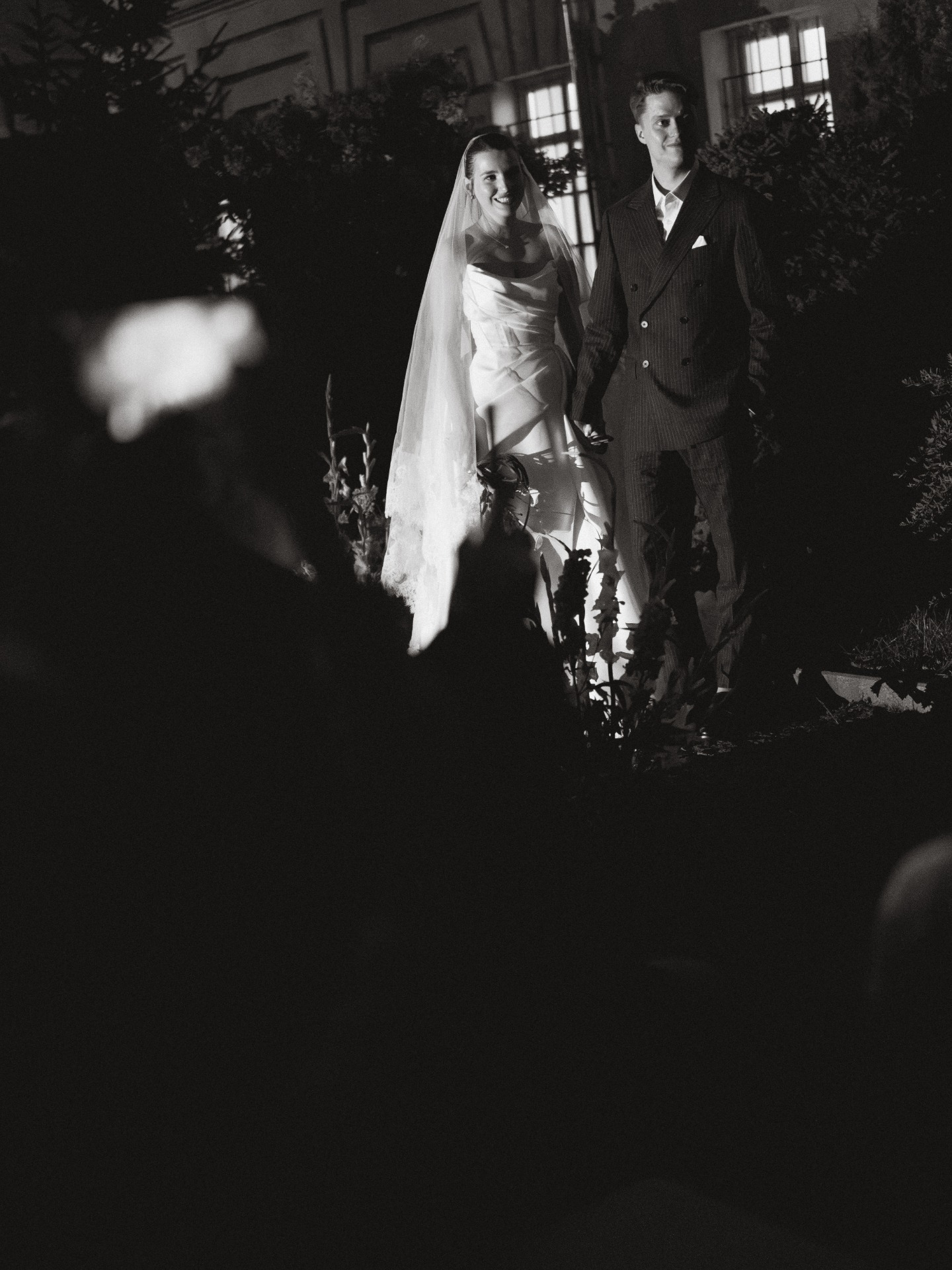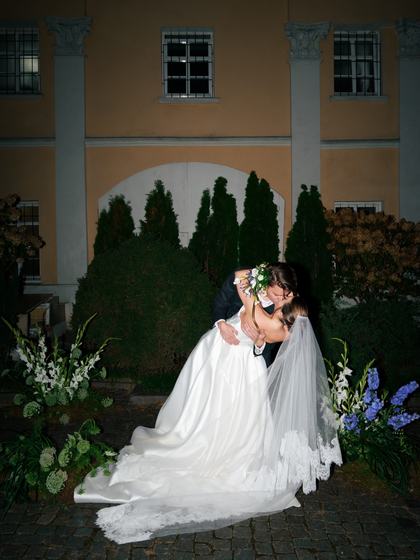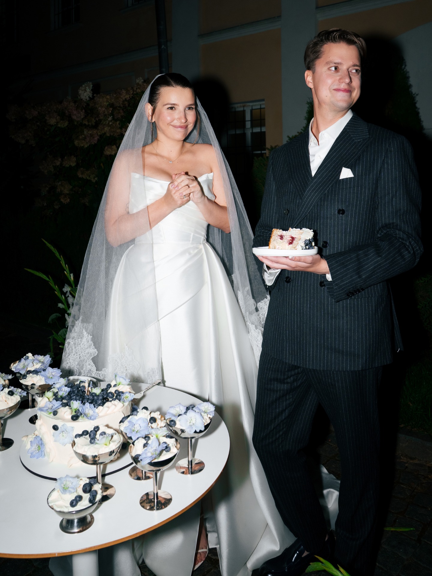 В будущем гостей ждал двор усадьбы, украшенный гирляндами. На фасаде шла проекция плёночного фильма о нас, а в центре стояла арка из света — наш алтарь. Мы с Даниилом вышли по очереди, обменялись клятвами, после чего на улицу вынесли торт.