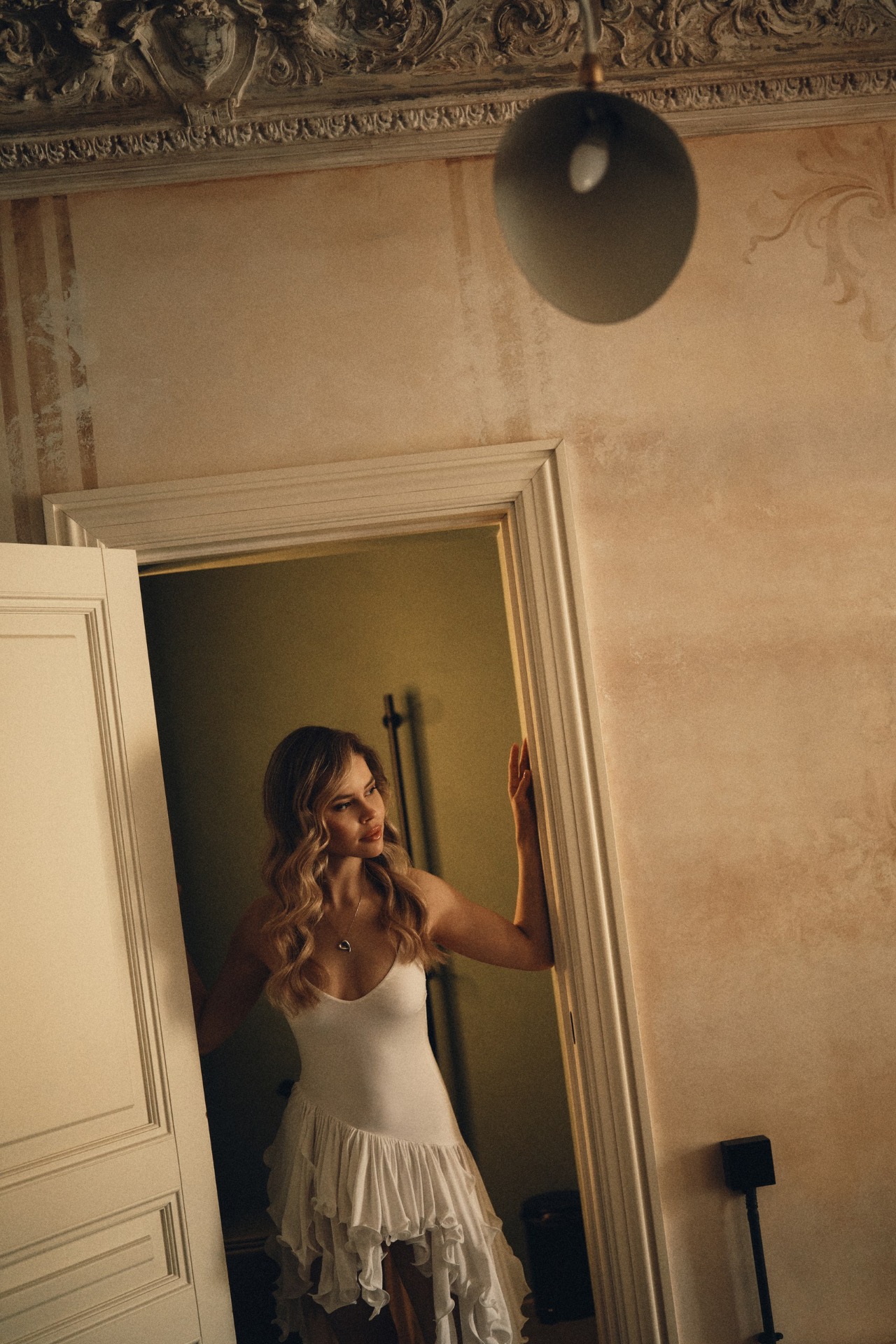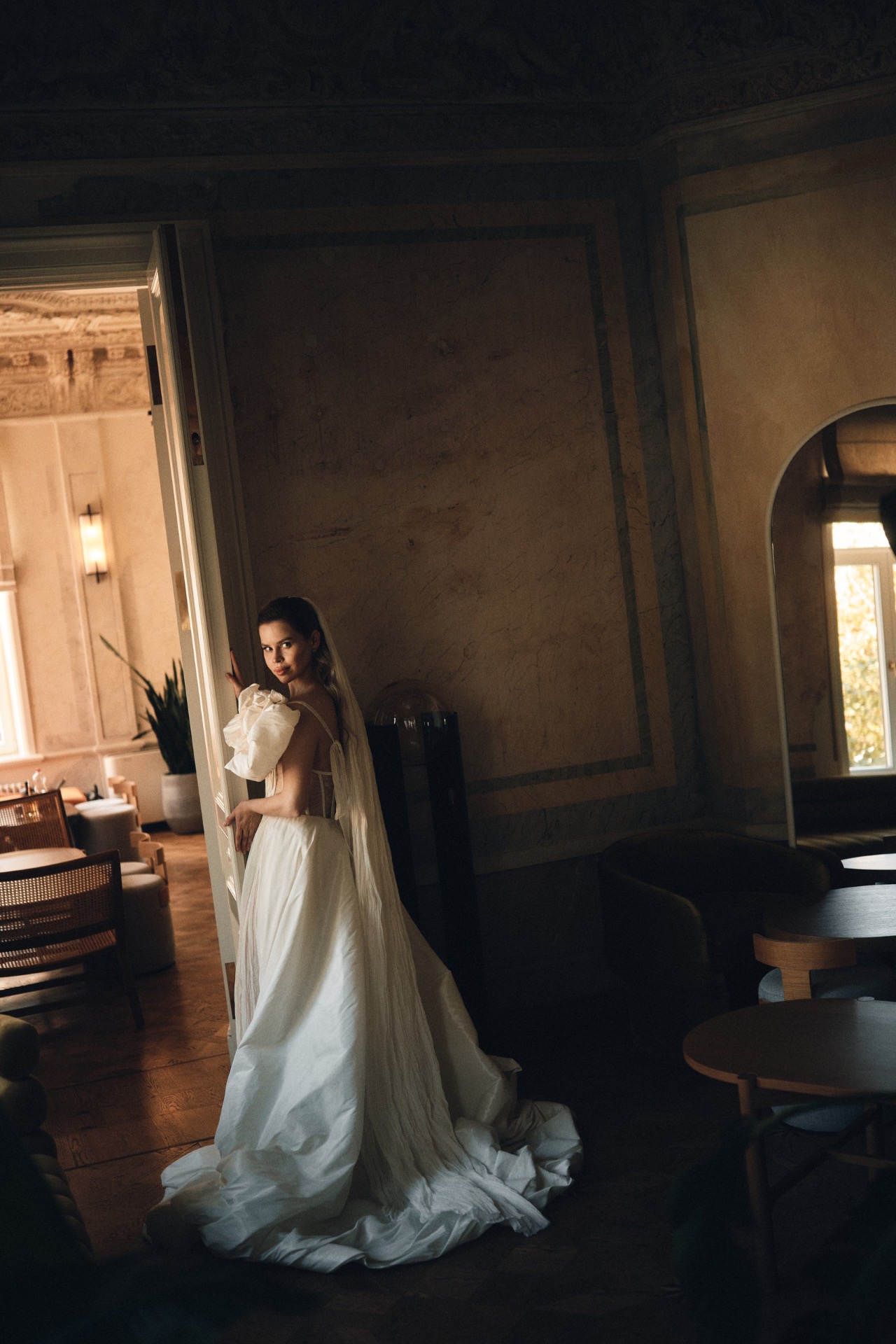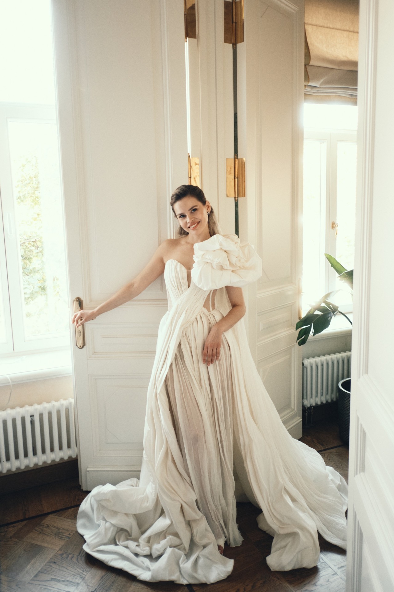 Основное платье Регины было выбрано в салоне «Кураж» от бренда Rara Avis: лаконичное, утончённое, идеально вписанное в эстетику вечера. А туфли Jimmy Choo идеально завершили образ невесты.