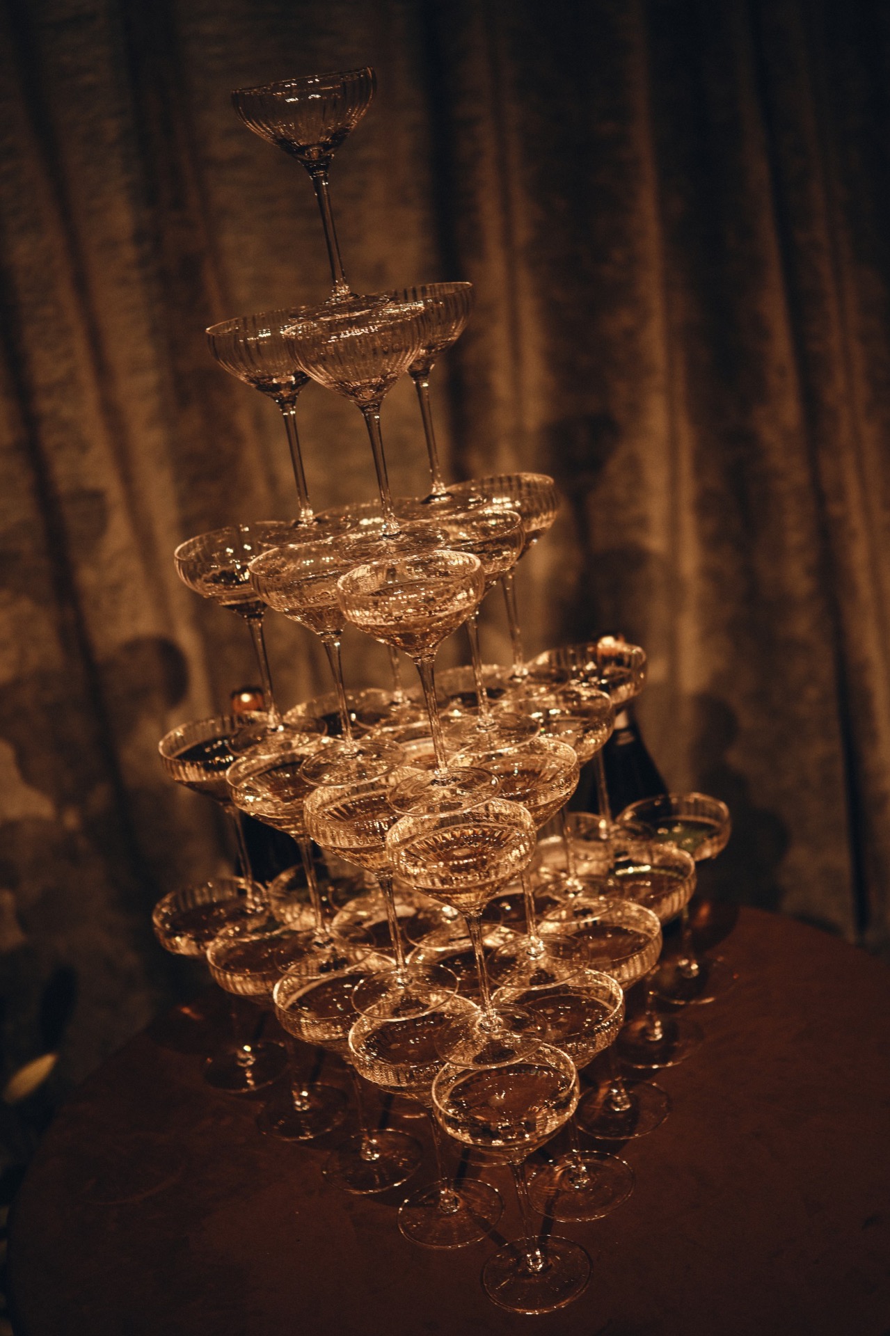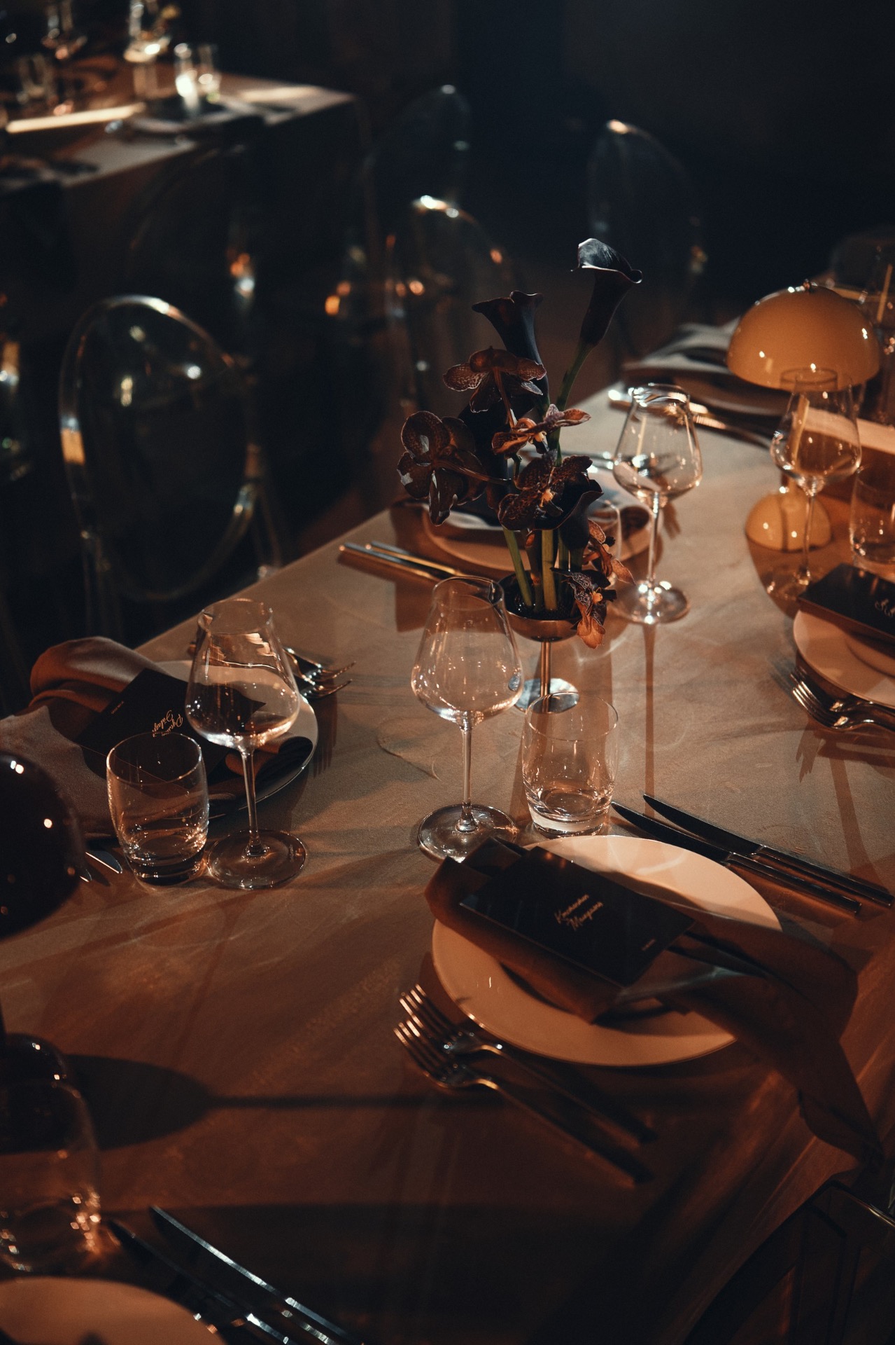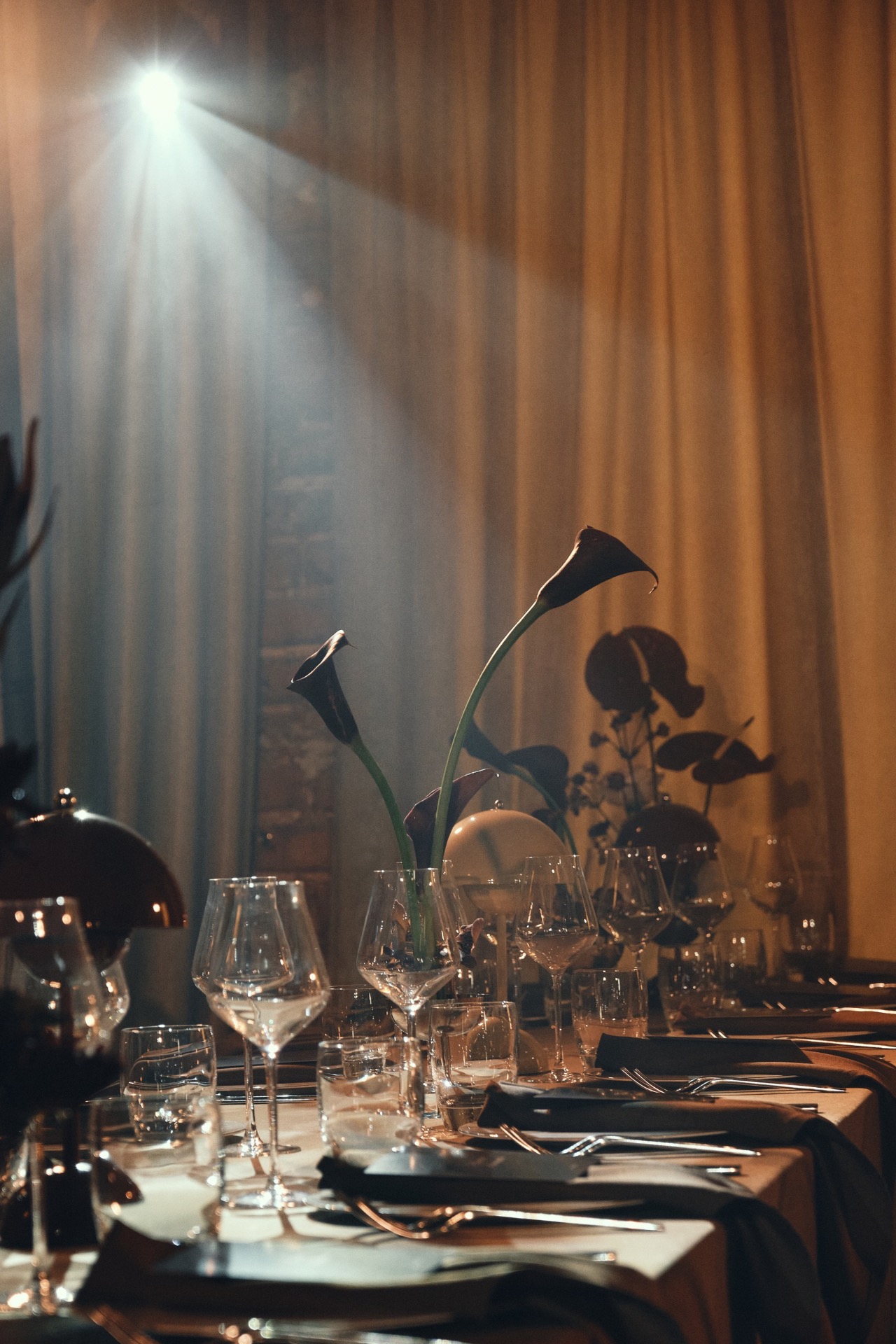 Флористика была выбрана в винных и кремовых оттенках, собранная в стальные креманки, как из реквизита кинокартины. Детали не кричали, а тихо работали на атмосферу.