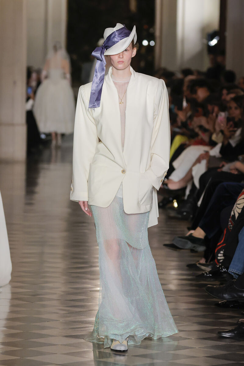 Андреас Кронталер, креативный директор дома и партнёр легендарной Вивьен, снова говорит языком дерзости и провокации: розы с гравюр XVIII века, мягкий тюль, поэтичный шифон и строгий корсет. Среди главных мотивов — цветы апельсина, как символ чистоты, переосмысленные через архитектурную графику улочек Барселоны. Особенно сильным моментом стало появление Симонетты Джанфеличи в платье «Madame de Pompadour» — оно стало личной отсылкой к картине Буше, горячо любимого самой Вивьен.