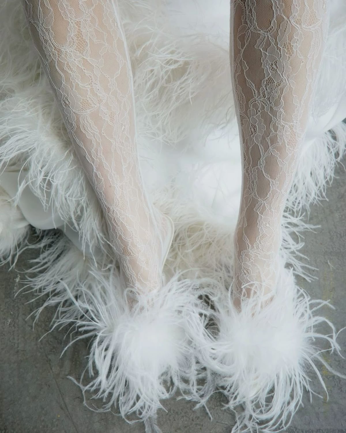 Кружевные колготки это очень красивый акцент, который добавляет образу детали, особенно если платье короткое или с разрезом. Лучше выбирать тонкое кружево в молочных или айвори оттенках без активного узора, так образ остаётся элегантным и не перегруженным.