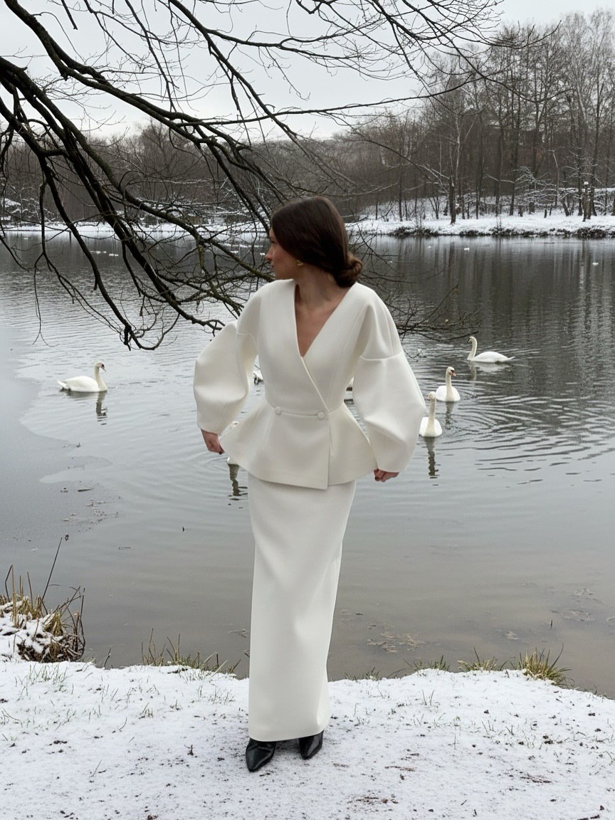 Идеальная альтернатива классическому свадебному платью — комплект из макси юбки и жакета плотной ткани. Если вы планируете камерную роспись или небольшую свадьбу, советуем приглянуться к этому варианту.