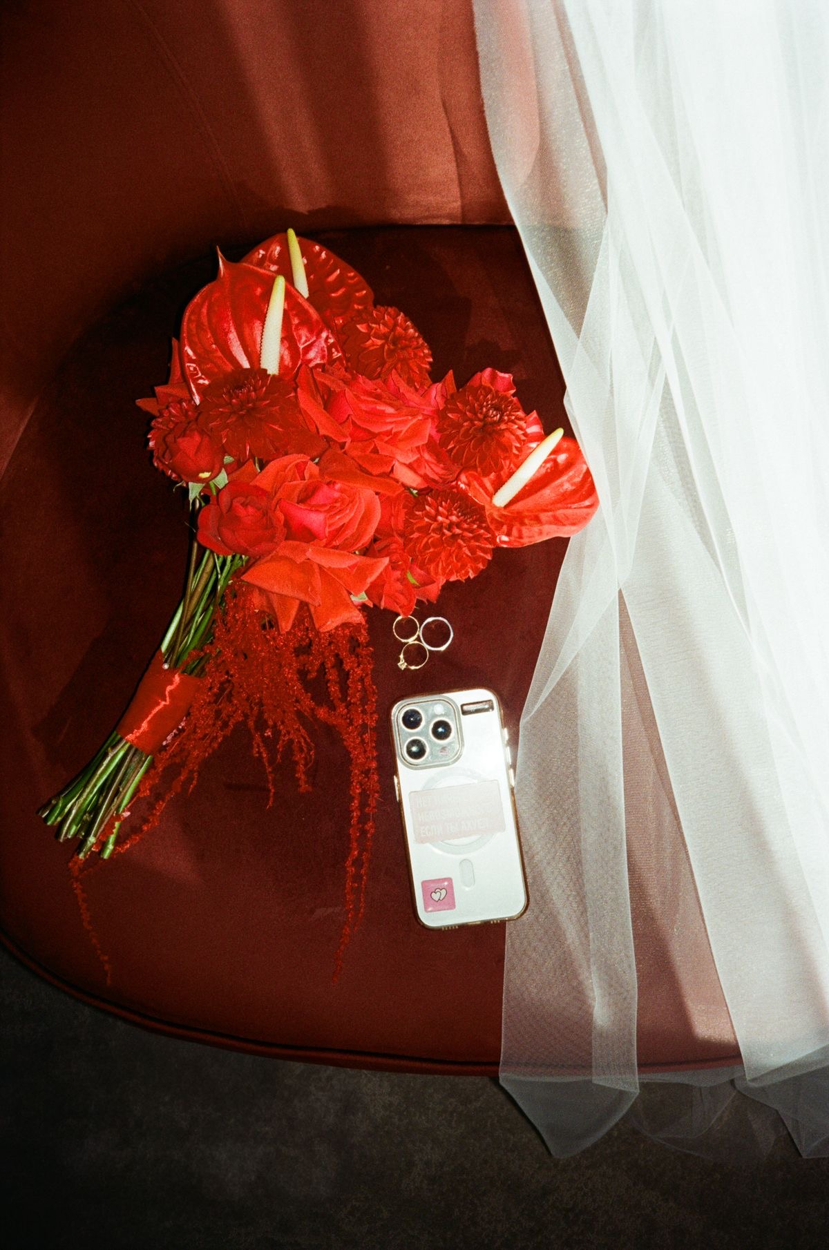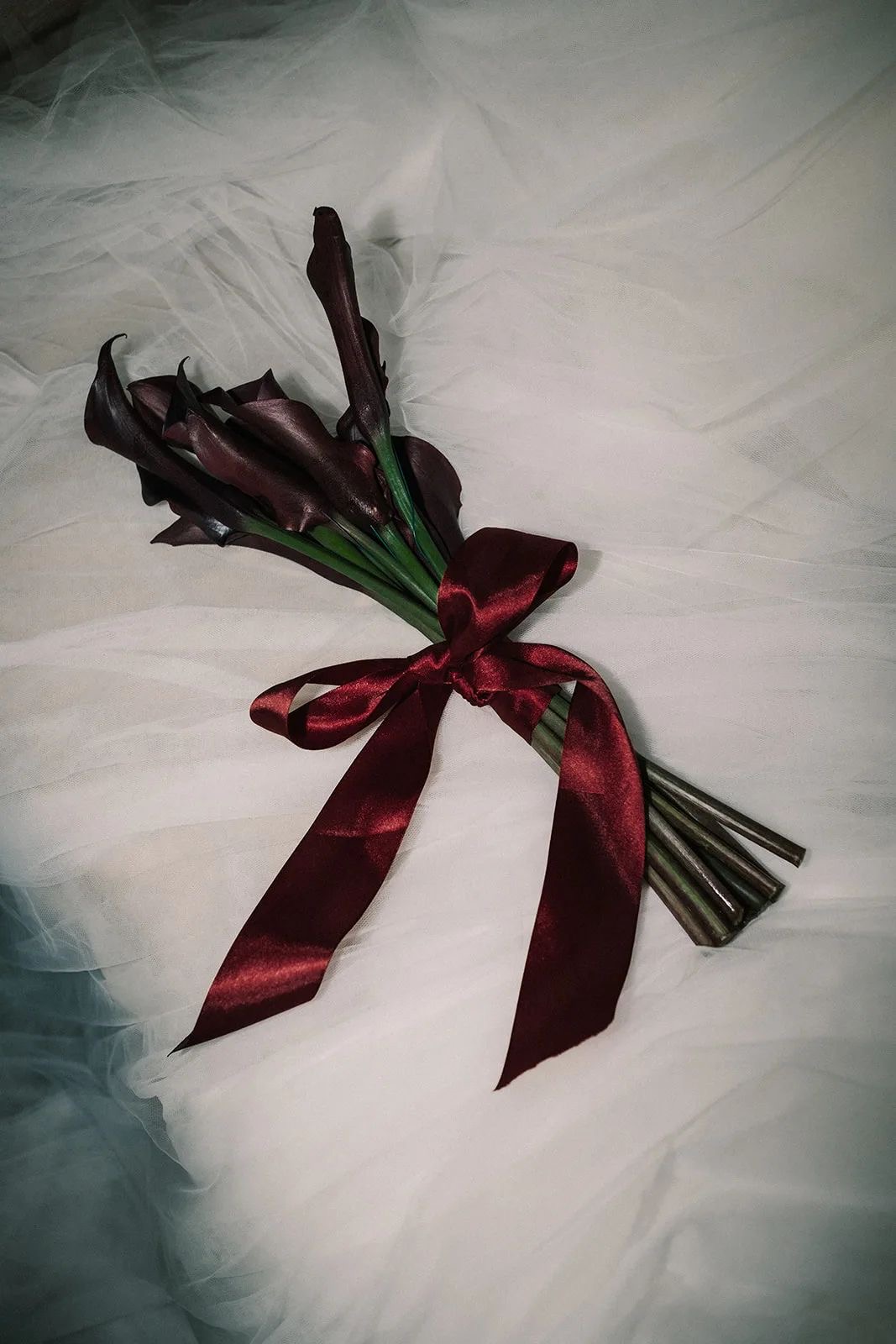 Нам очень нравятся букеты с глубокими красными, винными, фиолетовыми и тёмно-бордовыми оттенками, и особенно нравятся в зимних образах невесты, где букет становится полноценным акцентом, который сразу притягивает внимание и контрастирует с белоснежной палитрой вокруг.