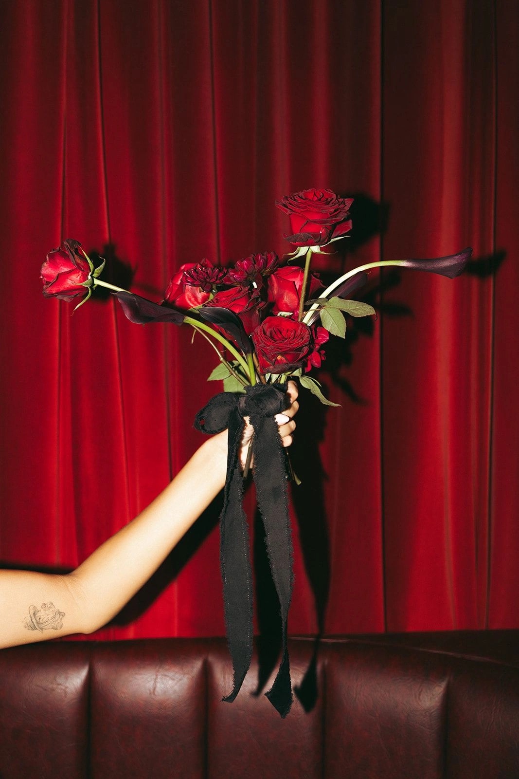 Букеты из атласа стали новым трендом и неслучайно — это идеальный вариант для зимнего образа, ведь такой букет хорошо держит форму, не боится холода и одинаково эффектно смотрится на улице и в помещении.