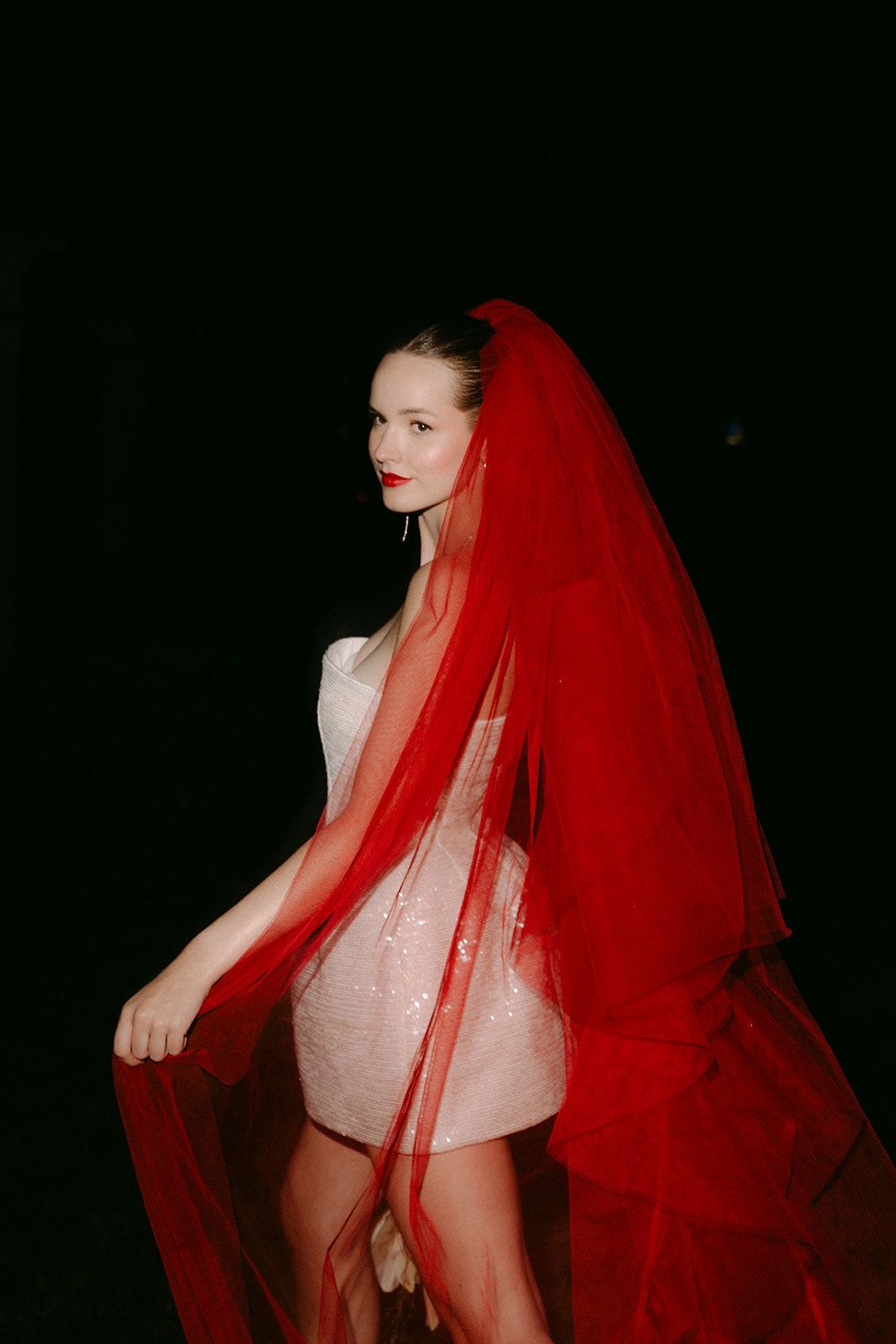 Необычная идея, закрывающая наш список — яркая фата, которая мгновенно привлекает внимание и делает образ запоминающимся.