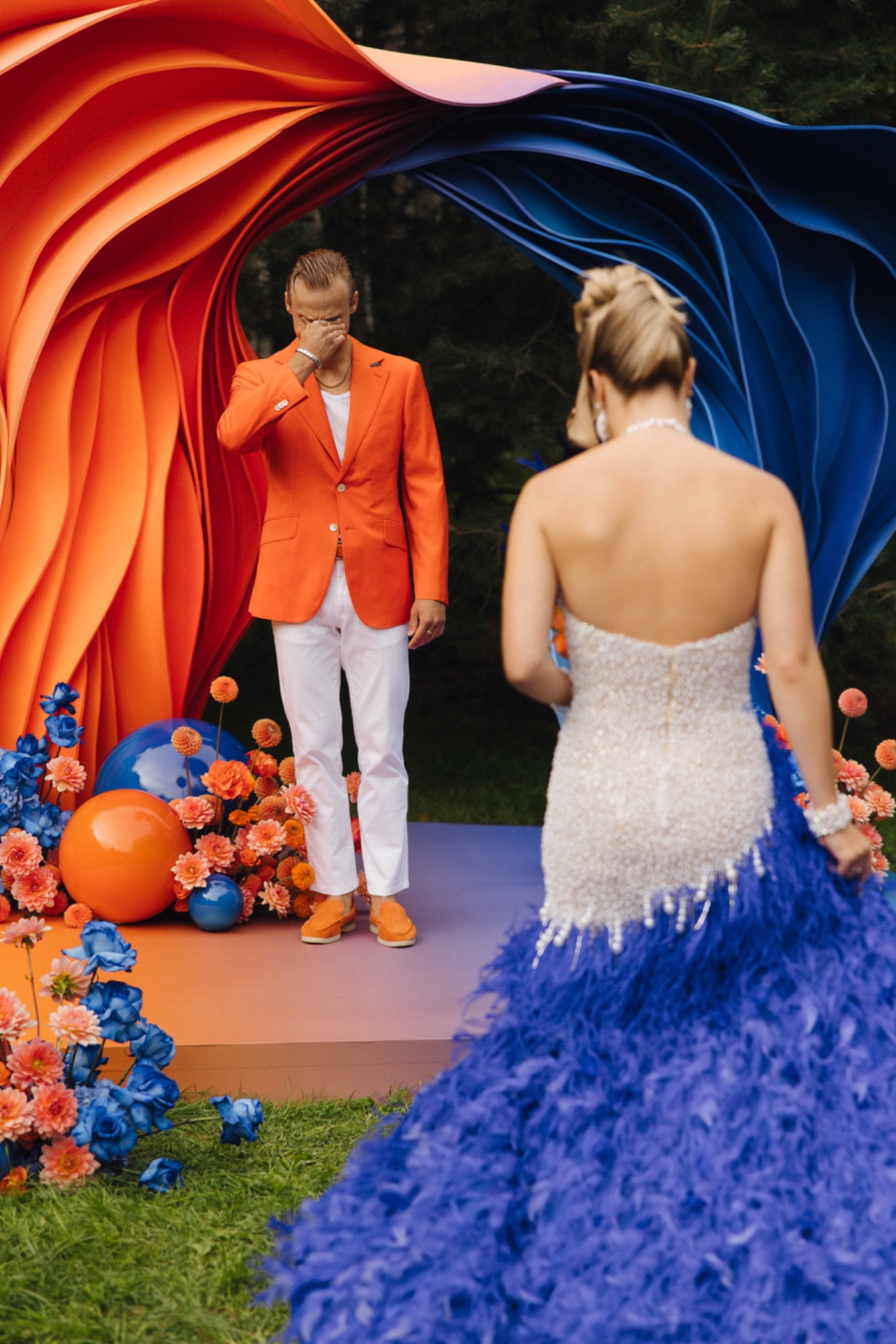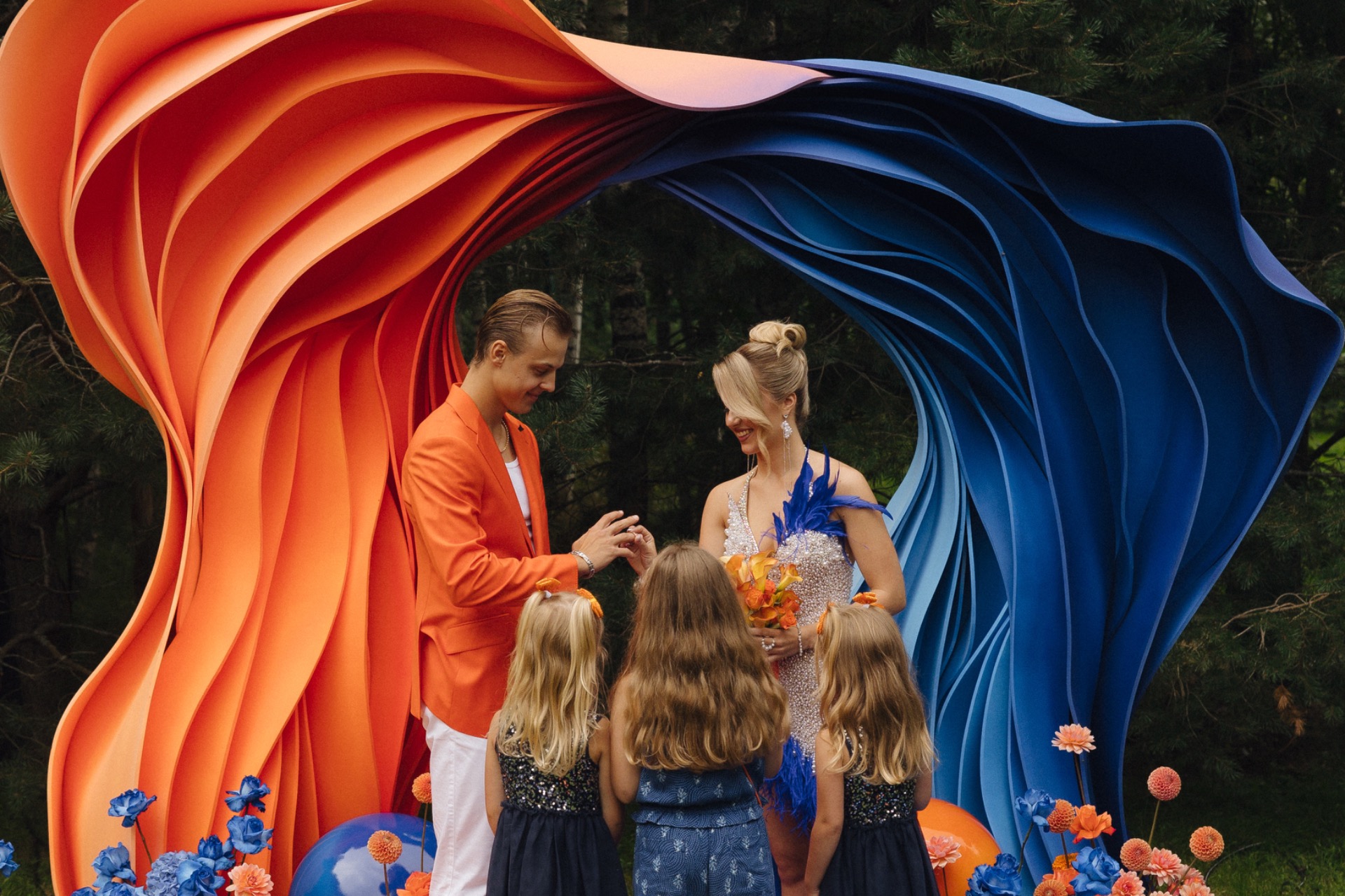 Мы хотели яркую свадьбу. Палитру мы выбрали исходя из любимого цвета Влада и цвета нашей машины. А к этим оттенкам отлично подошла концепция огня и воды.