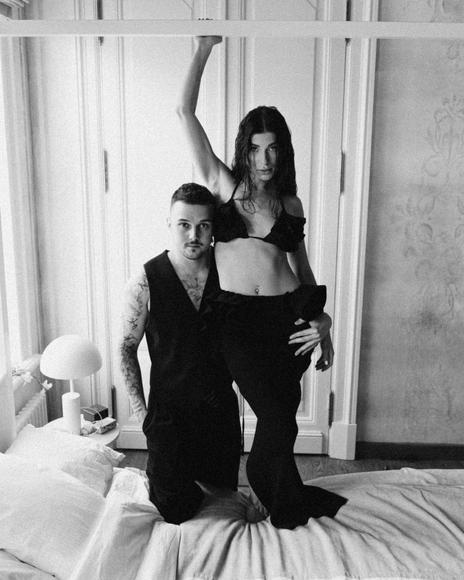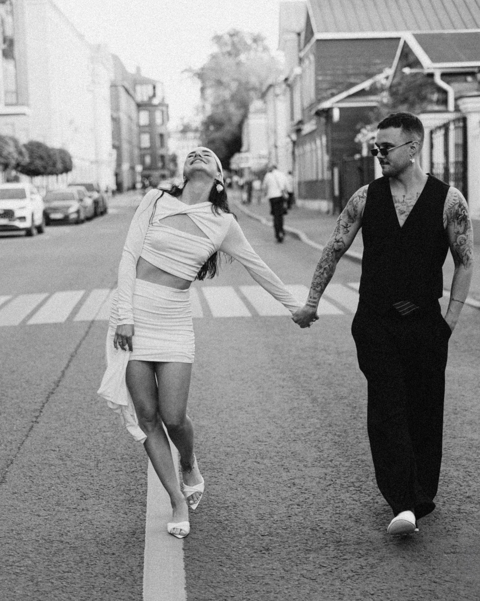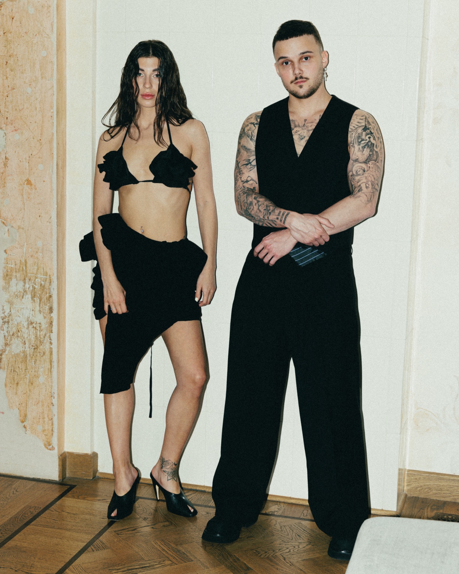 Для Никиты мы выбрали жилет, открывающий его татуировки на руках, а также брюки бренда Chernim cherno. В качестве обуви для него мы остановились на грубых туфлях с металлическими элементами.