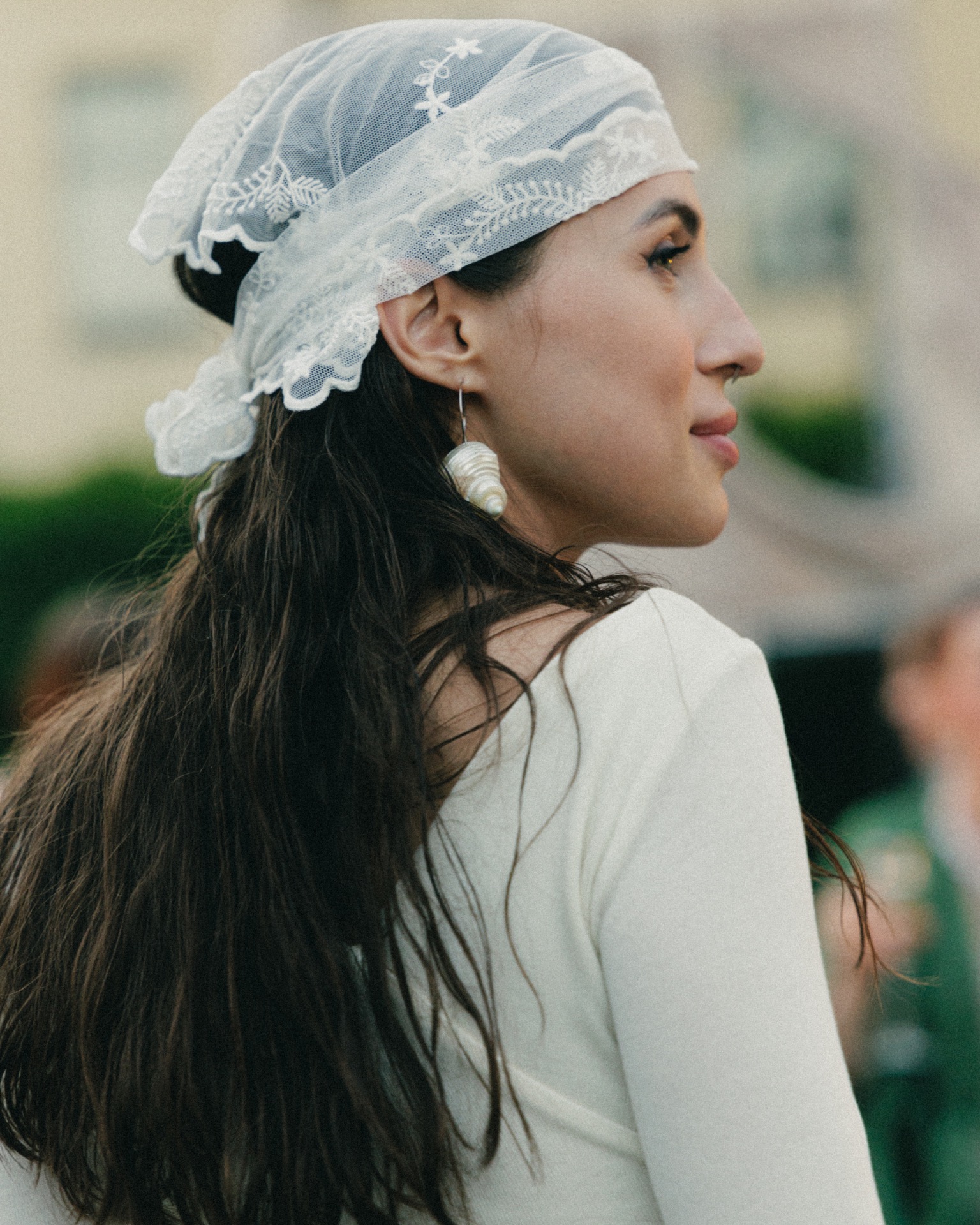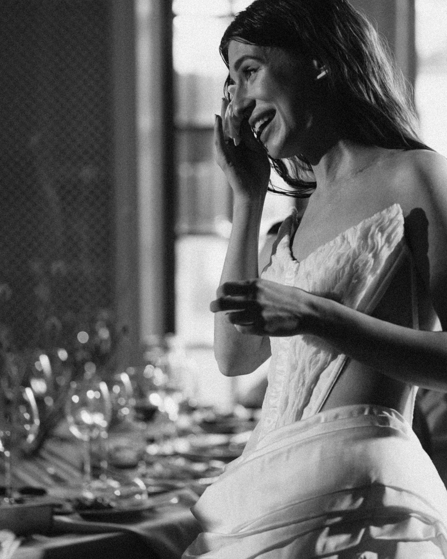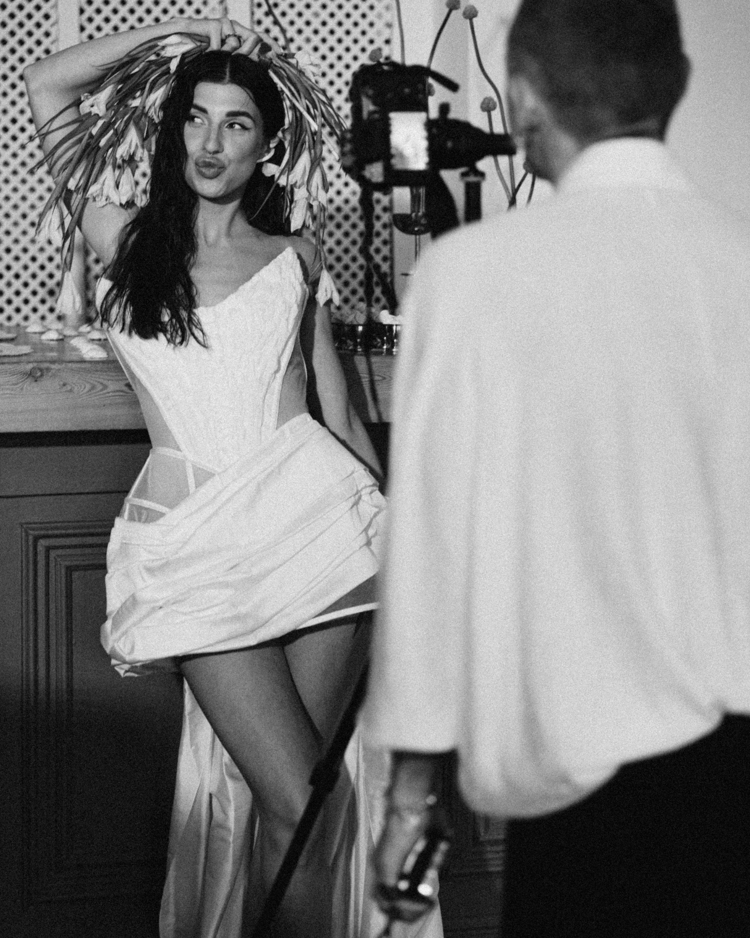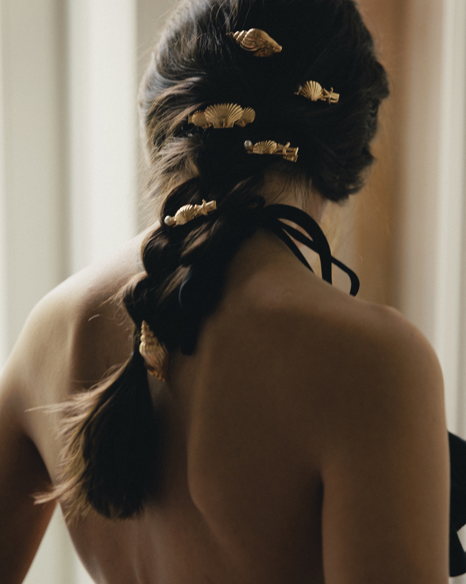 На утро у Сони была юбка низкой посадки с цветами по бокам от бренда korobeynikov и цветочный лиф. Волосы также имели влажную текстуру, и прямо во время съёмки её причёска трансформировалась в косу, украшенную металлическими заколками в виде ракушек, морских звёздочек, коньков и прочих морских обитателей.