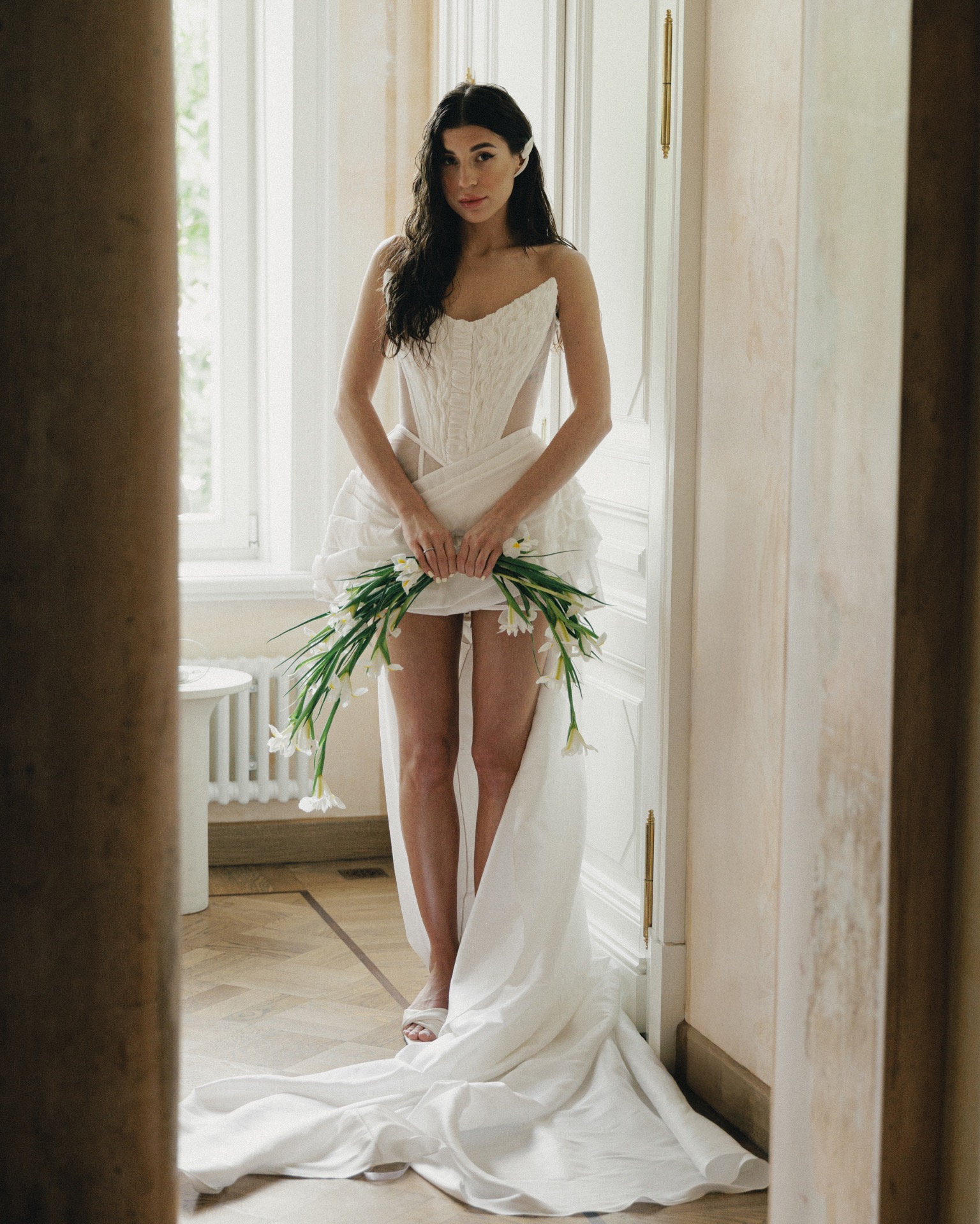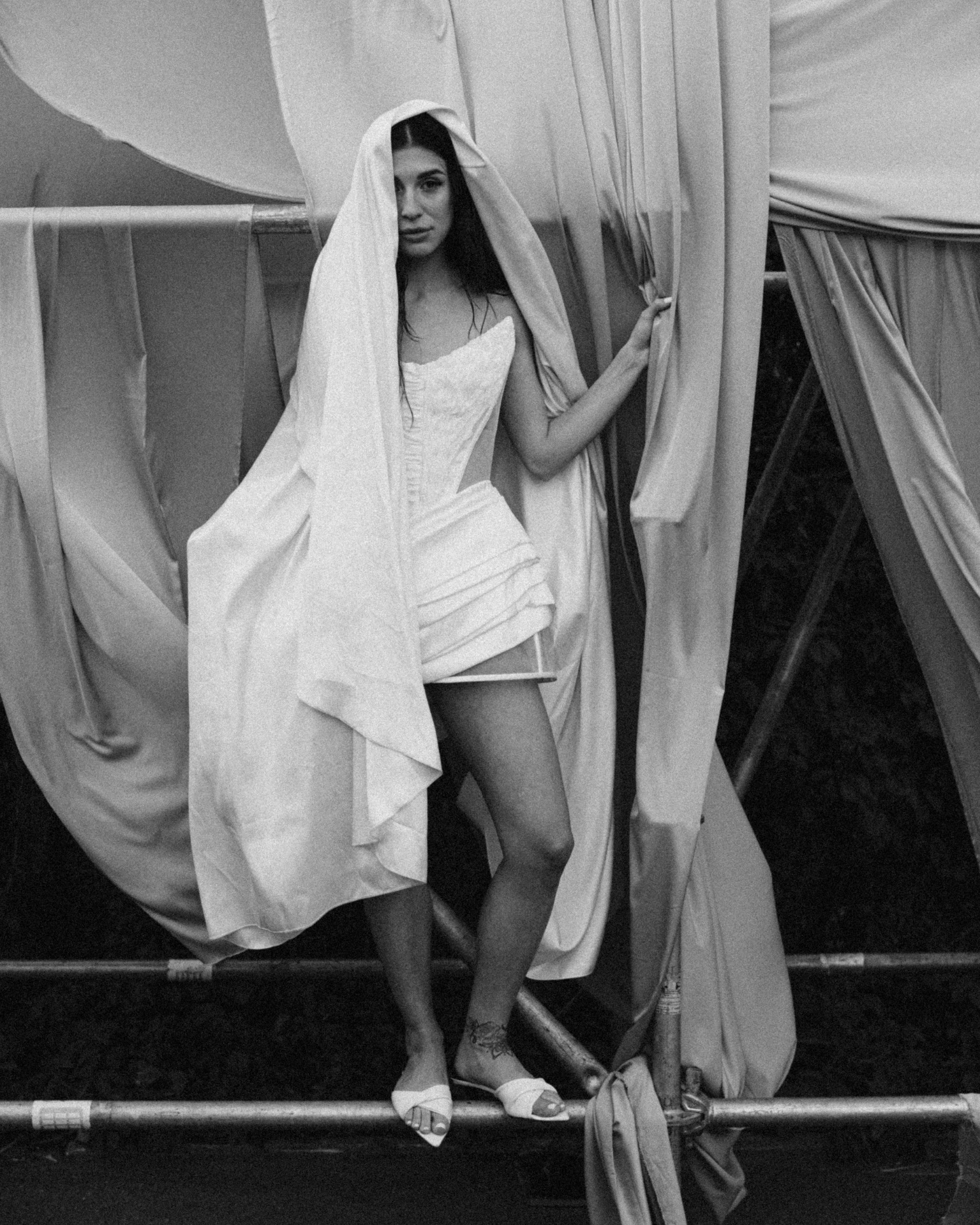 Платье было выбрано в салоне «Кураж»: короткая модель с длинным шлейфом, полупрозрачным корсетом, украшенным драпировками, вызывающими ассоциации с морской пенящейся волной. На ногах у Сони были открытые сабо с острым мысом и драпировками из кожи. Завершали её образ каффы российского бренда RESobjects, повторяющие рисунок на корсете. А влажная текстура в волосах, акцентные глаза и нюдовые влажные губы отлично дополняли весь образ.
