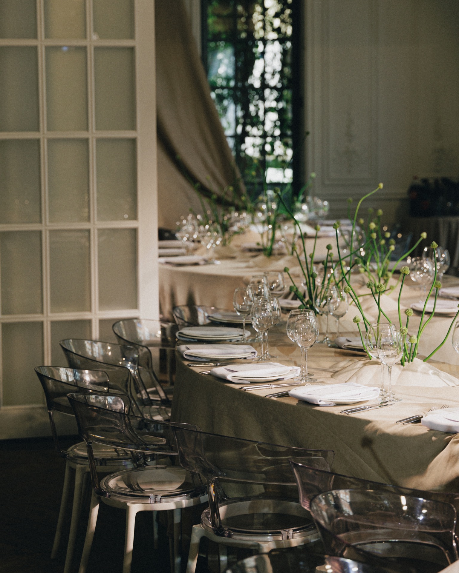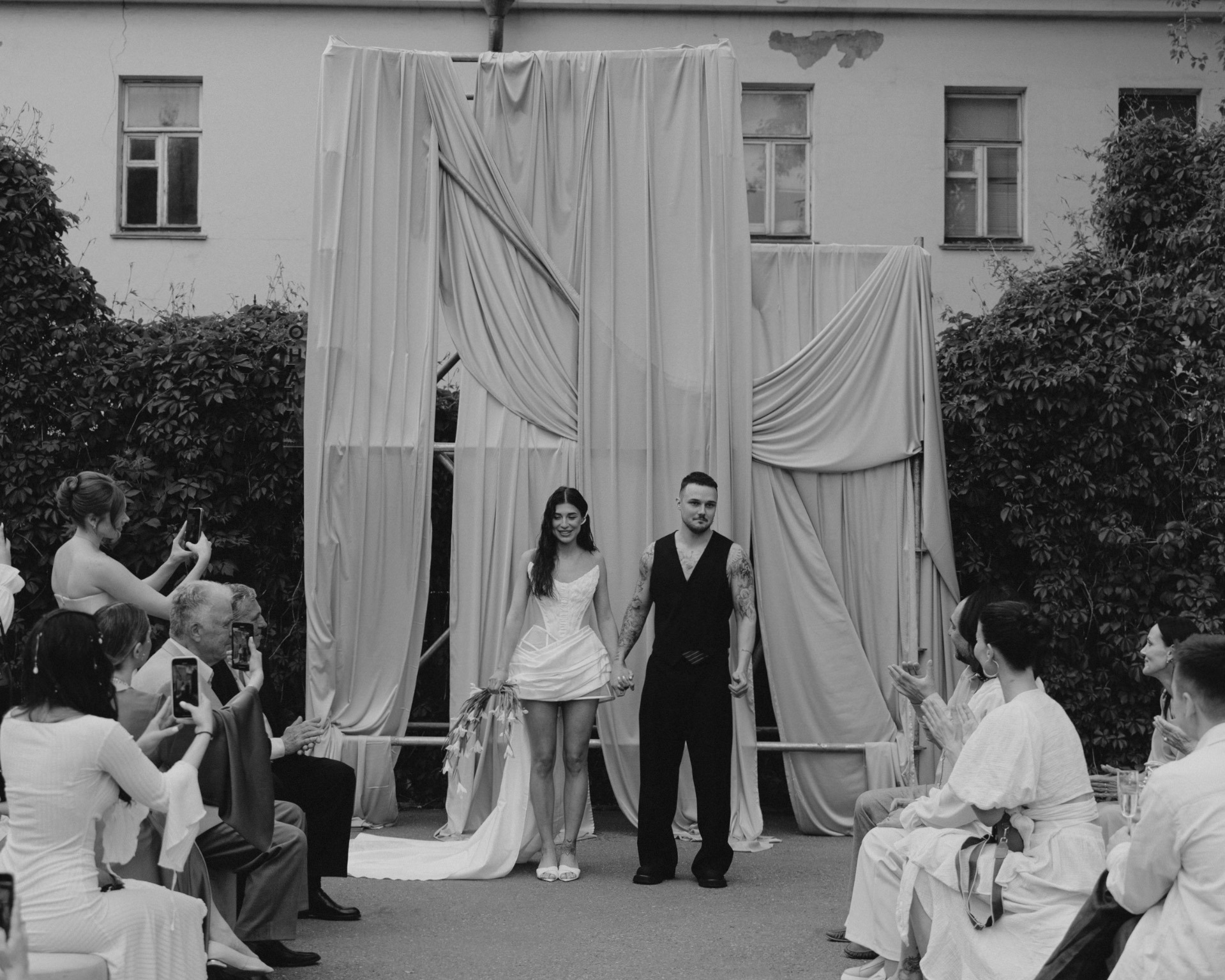 Зону церемонии мы оформили с использованием строительных лесов, на которых парили лёгкие ткани пудрового оттенка. Этот контраст стал отражением самой пары: двух сильных личностей, объединённых нежностью и любовью.