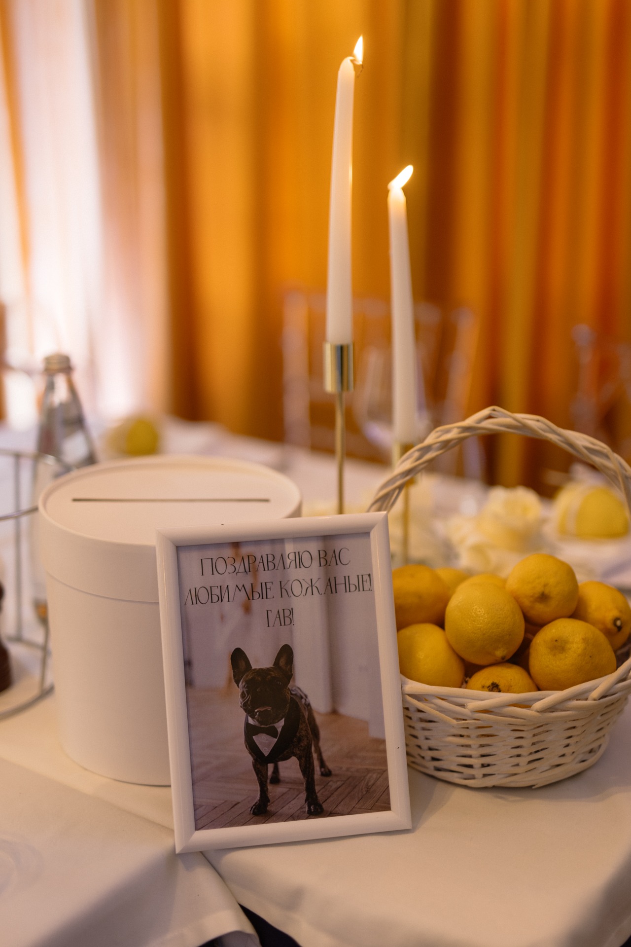 Ресторан мы выбрали в историческом районе Москвы — на Таганке. Во дворе расположился Ткацкий корпус золотоканительной фабрики Алексеевых, наших однофамильцев. В зале, который мы забронировали, были жёлтые шторы, и мы решили сделать их основой декора. Мы очень любим жёлтый цвет, поэтому всё сложилось лучшим образом. Лимоны, белые розы и свечи поддержали торжественную атмосферу и добавили праздничное настроение. У каждого гостя на столе лежал «именной» лимон — так мы обыграли план рассадки.