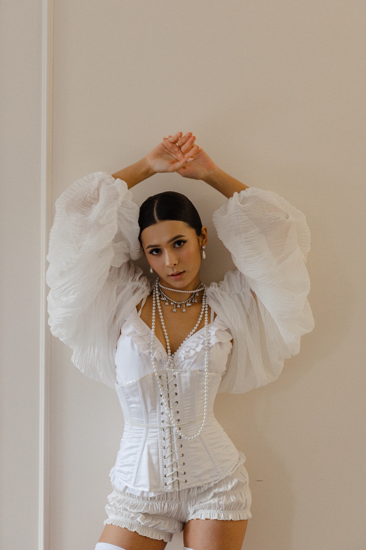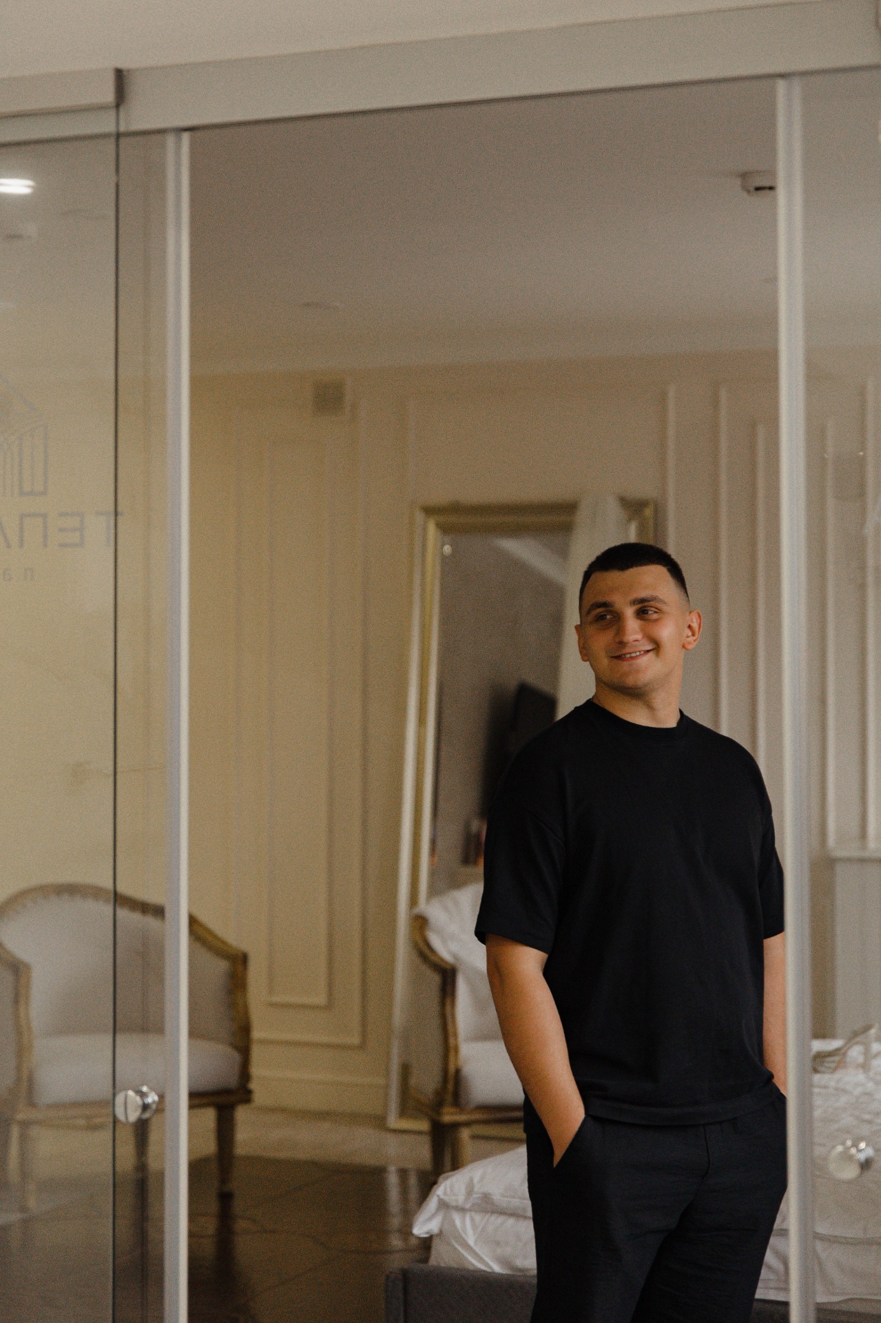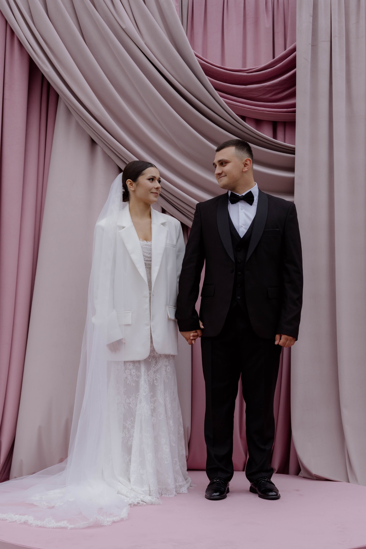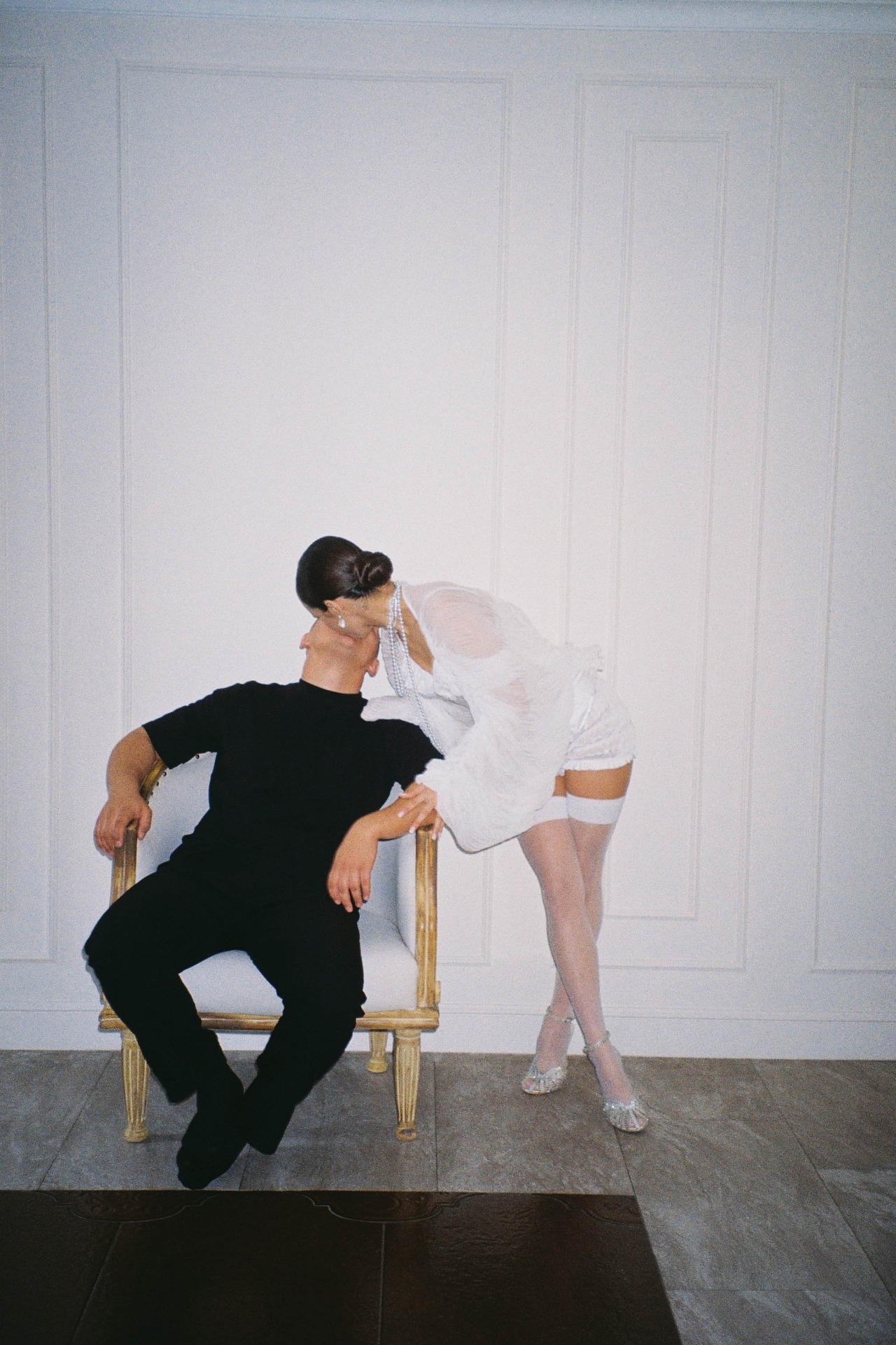 Никите мы подобрали тотал-чёрный лук, чтобы он контрастировал с моим полностью белым образом.