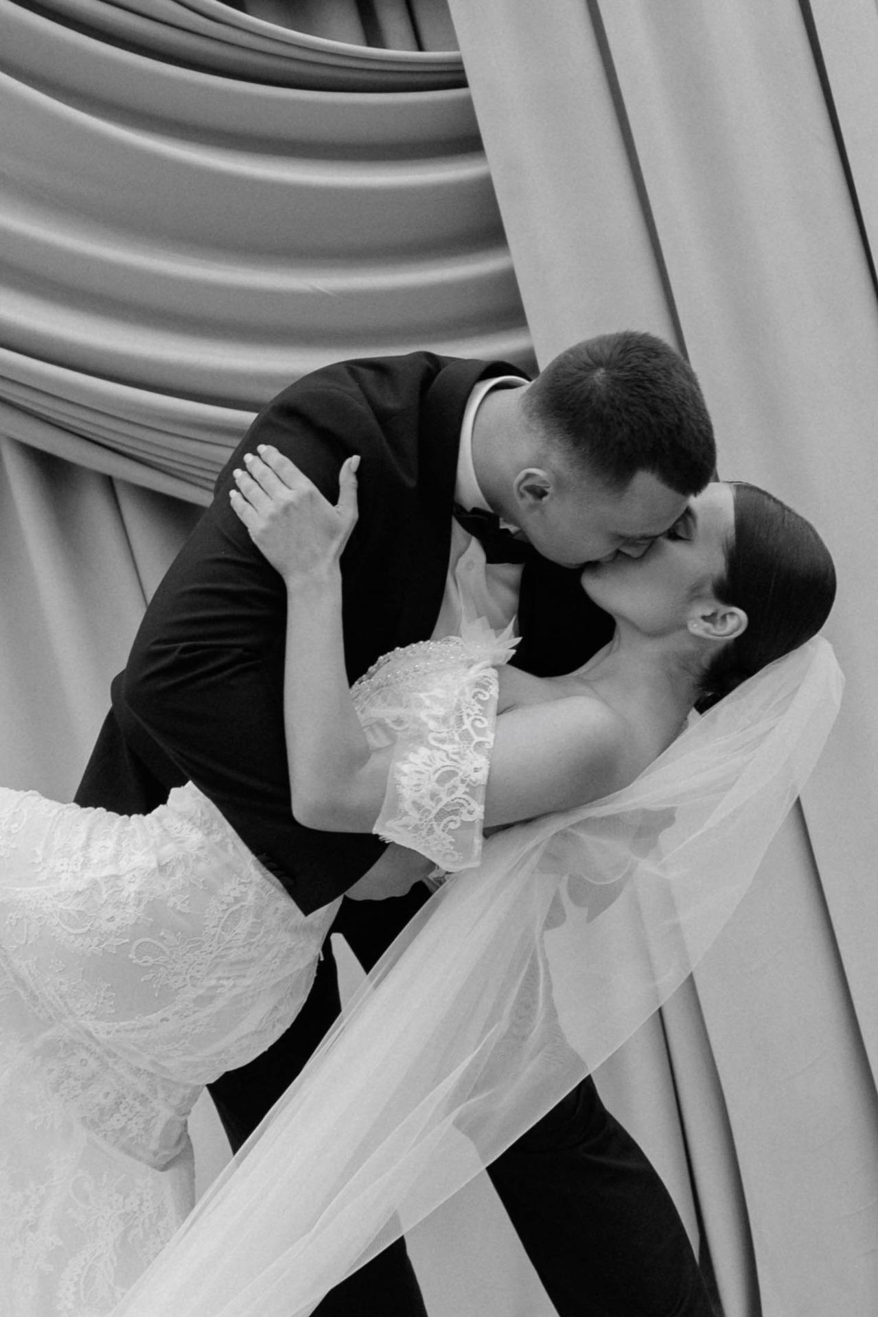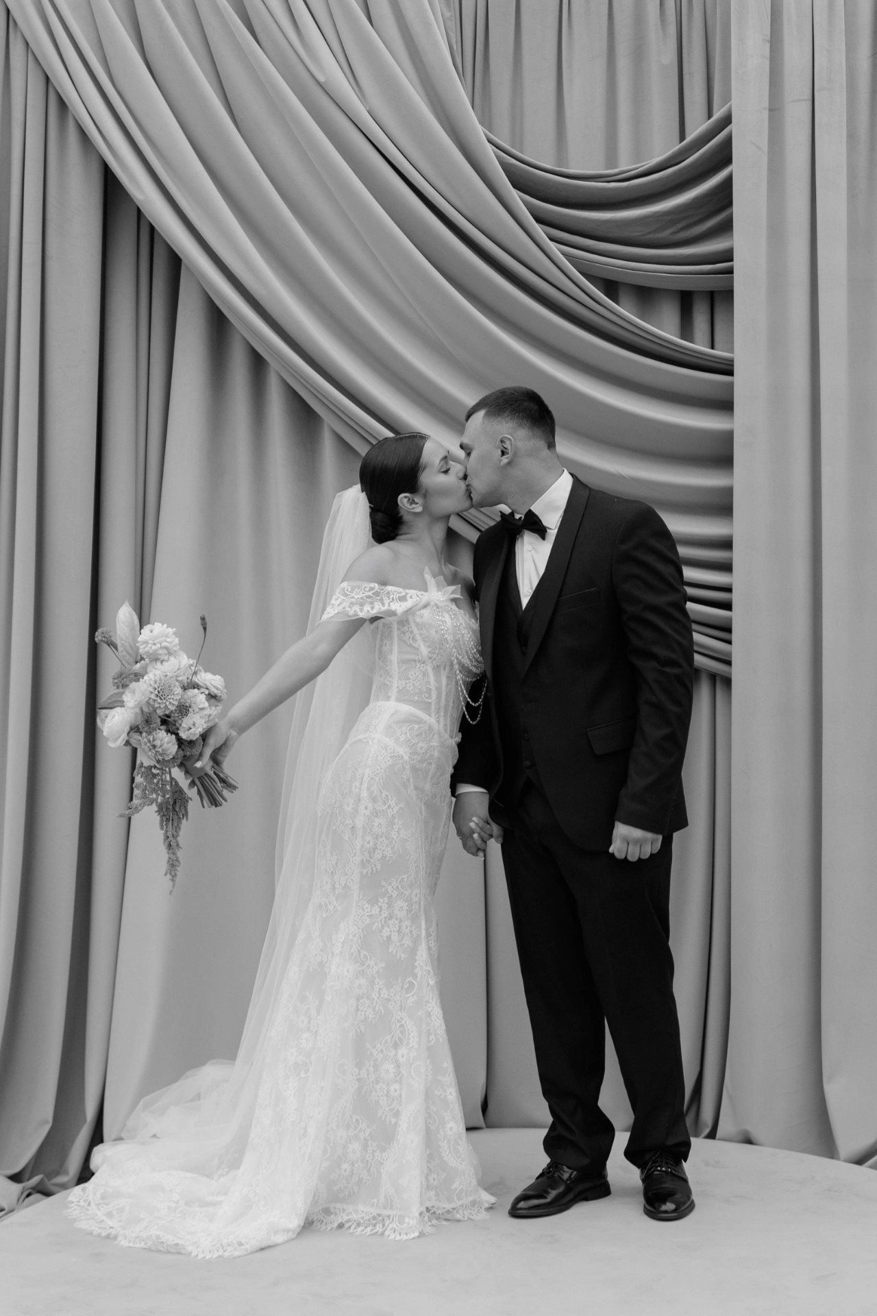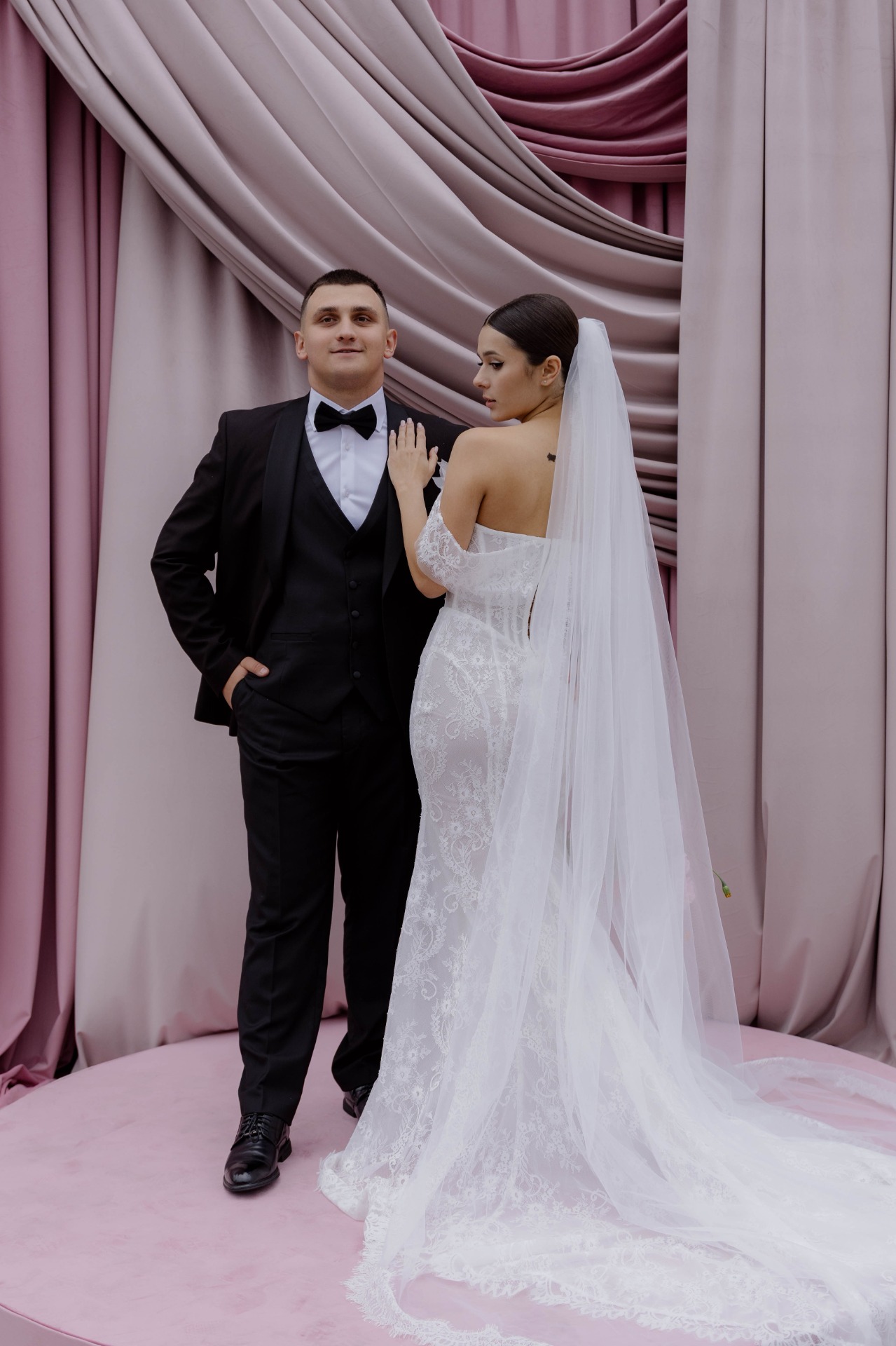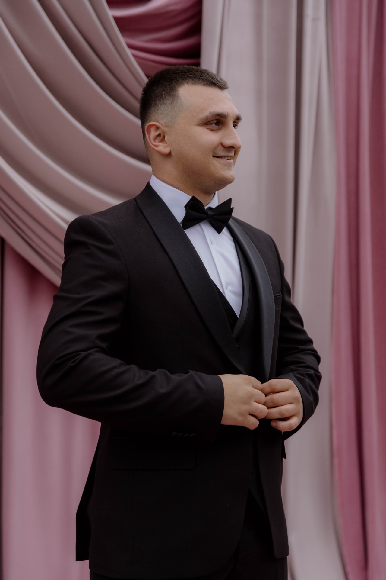 Никита до самой церемонии не знал, каким будет моё платье, но я сразу понимала, что для его основного образа нам понадобится классический смокинг с кипенно-белой рубашкой.