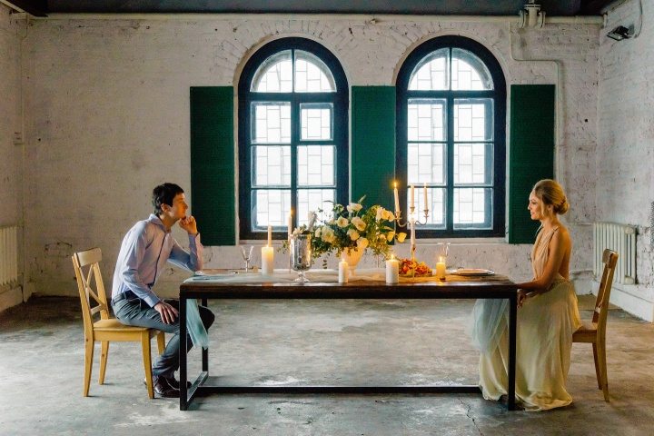 Мы подобрали отличное лофтовое пространство, которое помогло нам подчеркнуть камерную атмосферу события. Нам хотелось воплотить достаточно простые и в то же время элегантные и утонченные образы. Для отражения этого в романтическом антураже мы подготовили стол для двоих с использованием воздушной ткани, свечей в медных подсвечниках, красивой посуды и приборов. А главным украшением ужина стала растрепанная композиция в вазоне из зелени и пионовидных роз. Ну и какой же романтический ужин может обойтись без шампанского, клубники и фруктов?