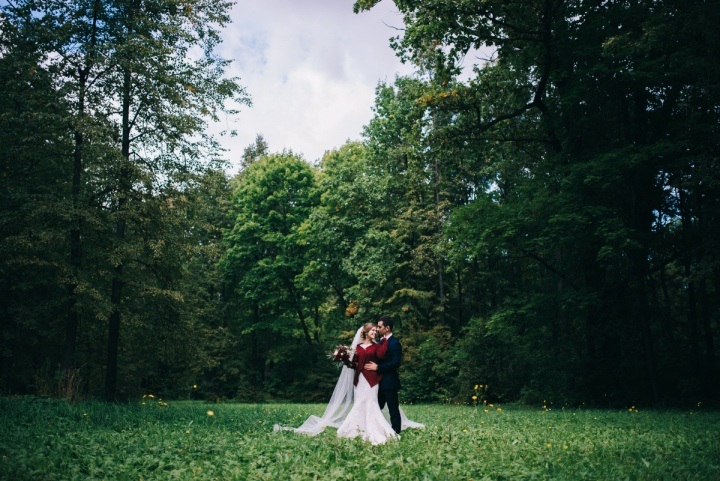 Осенние пейзажи и мы влюбленные. Без какой-либо наигранности. Для нас было важно сочетать натуральность природы и красоту мелочей. Мы выбрали винные оттенки — с ними у меня ассоциируются осенние вечера рядом с домом, виноградная лоза и лучи солнца, пробивающиеся сквозь листву.