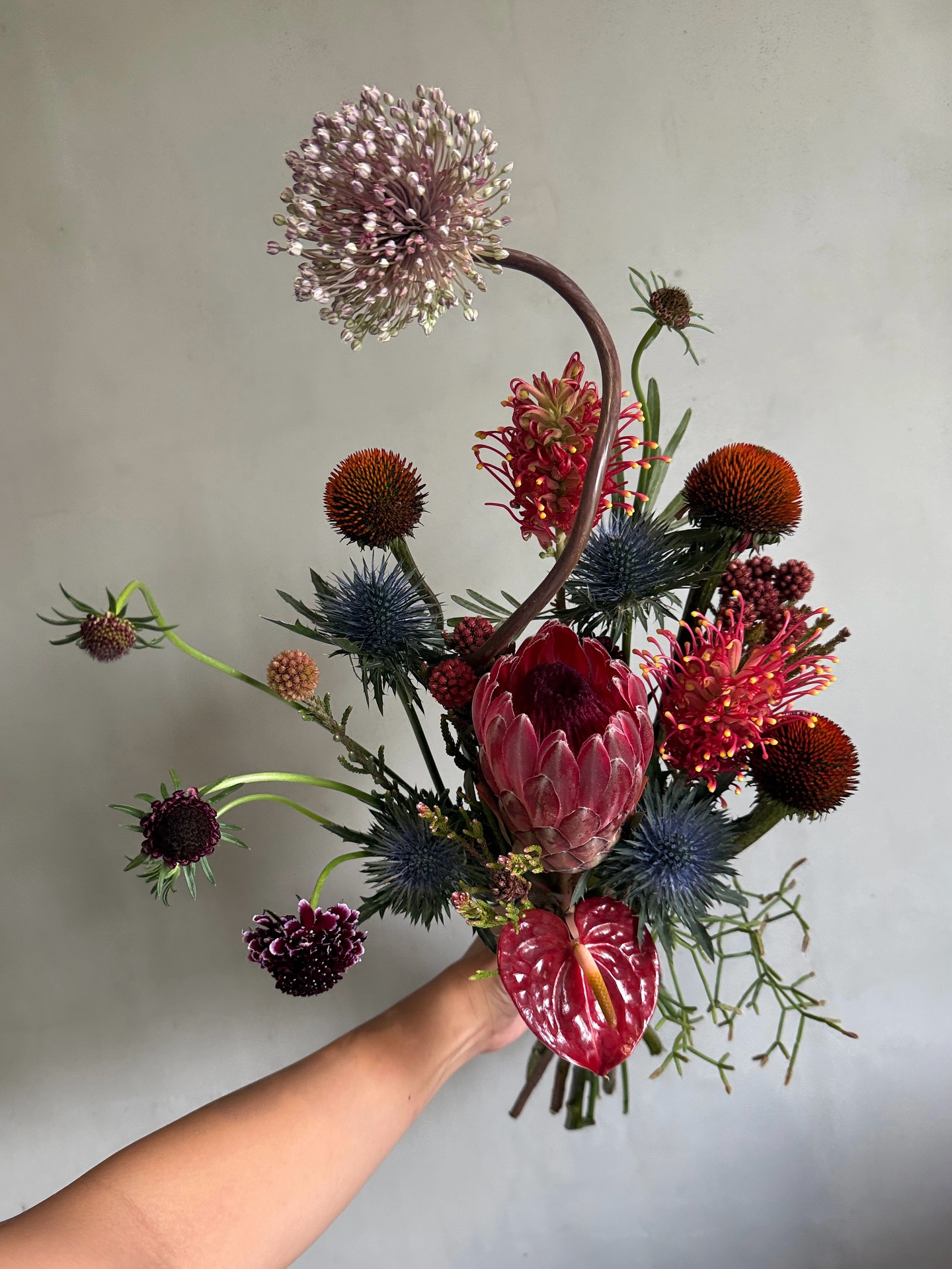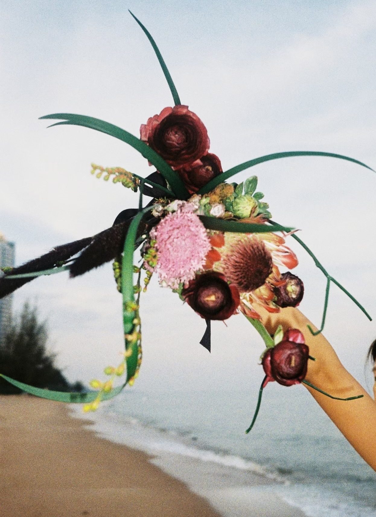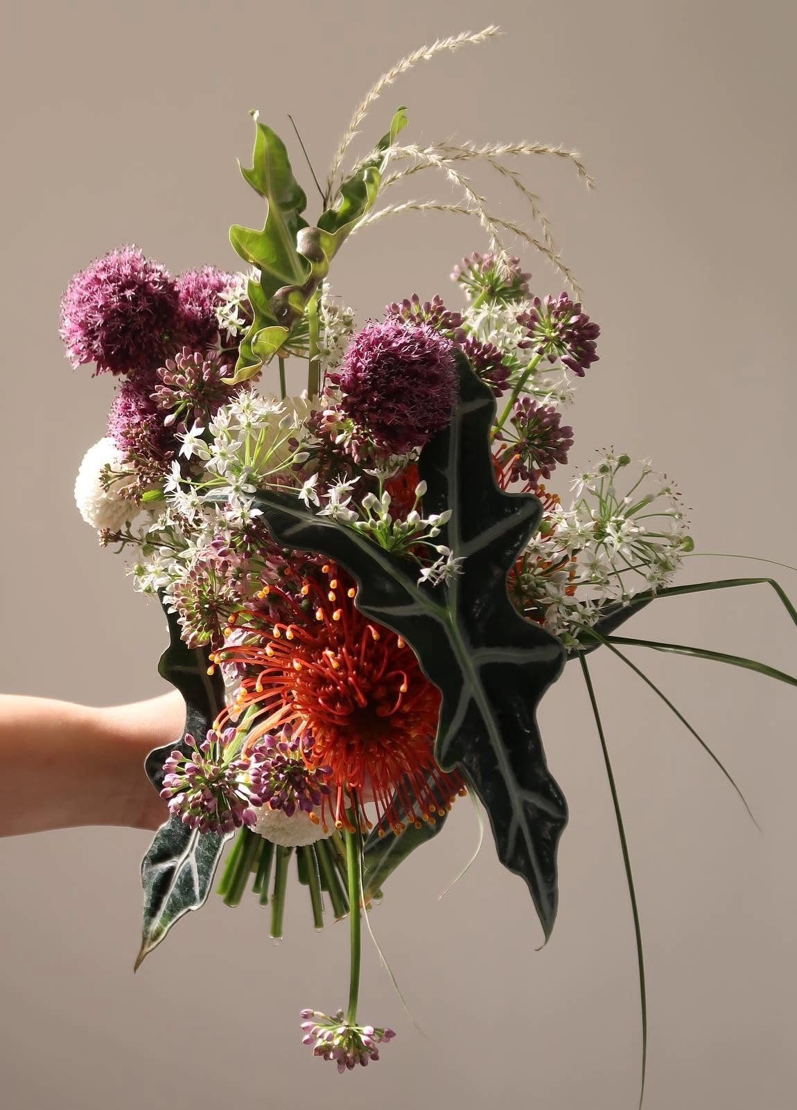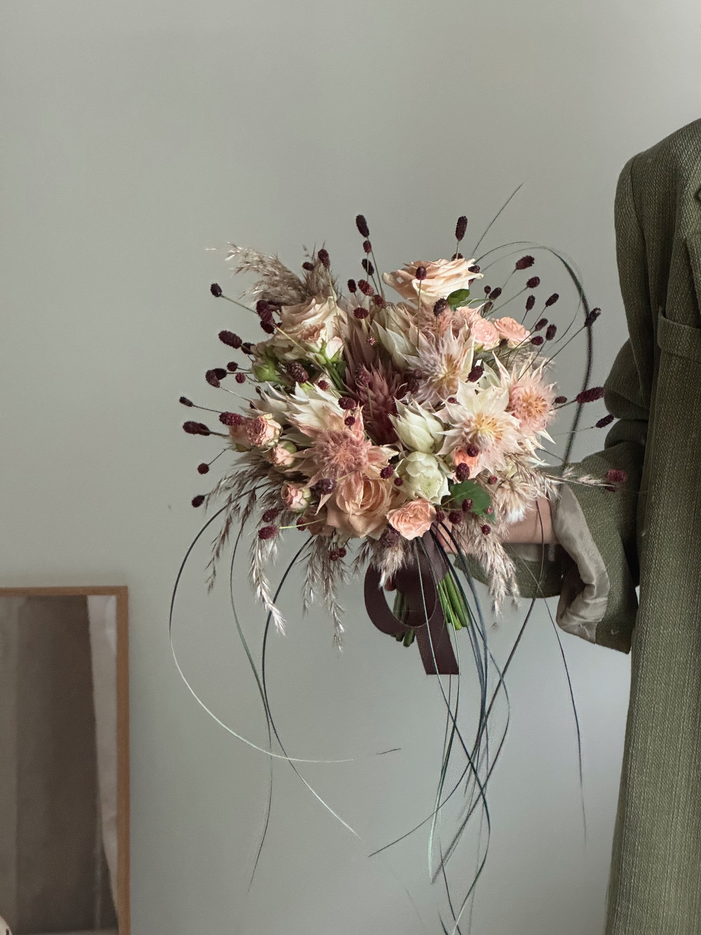 Букет в стиле бохо может быть объёмным и очень разнообразным по составу. Используй в нём протею, антуриум, плоды граната и сухоцветы. Подробнее про эстетику современного бохо в свадьбах читай в нашей статье.